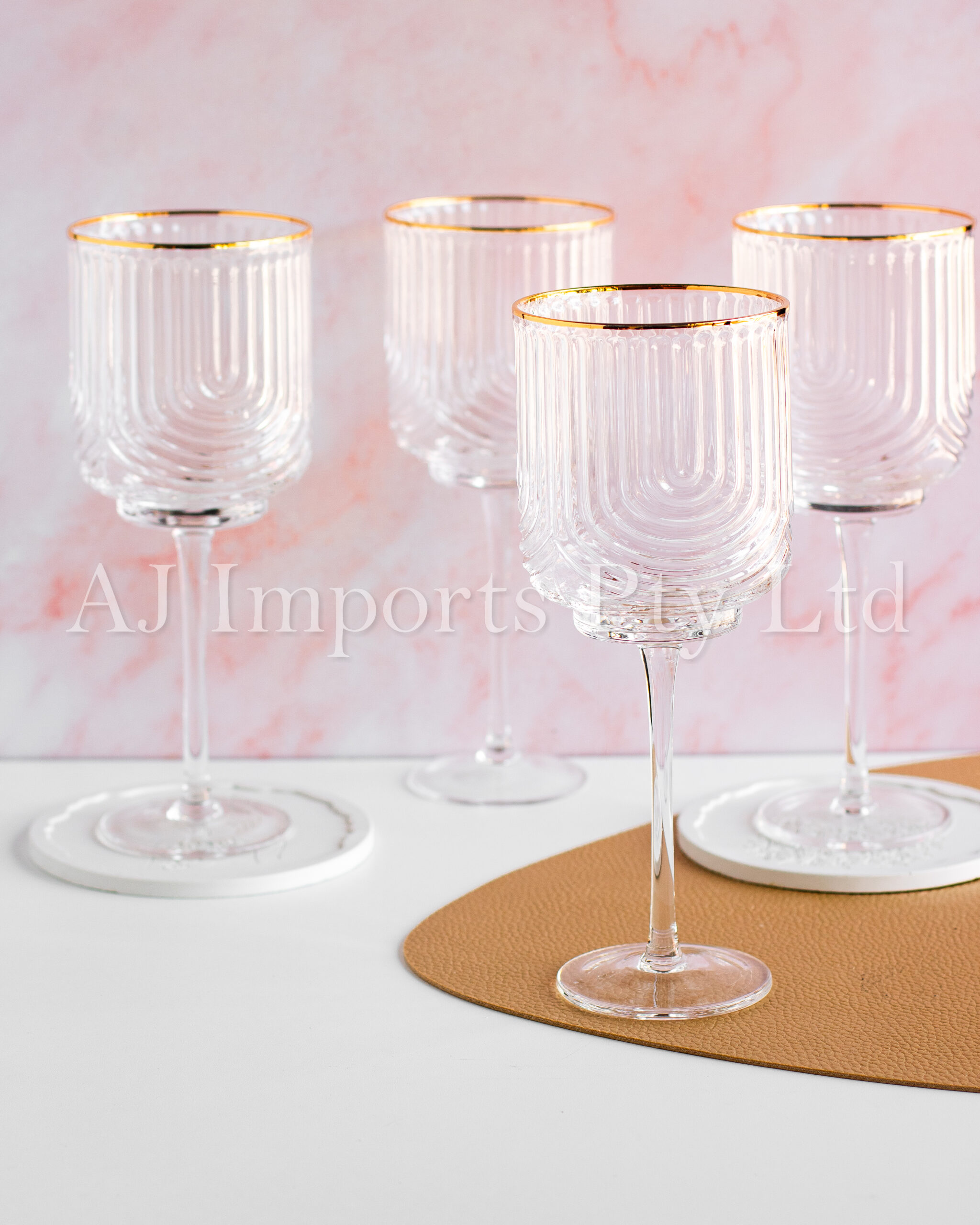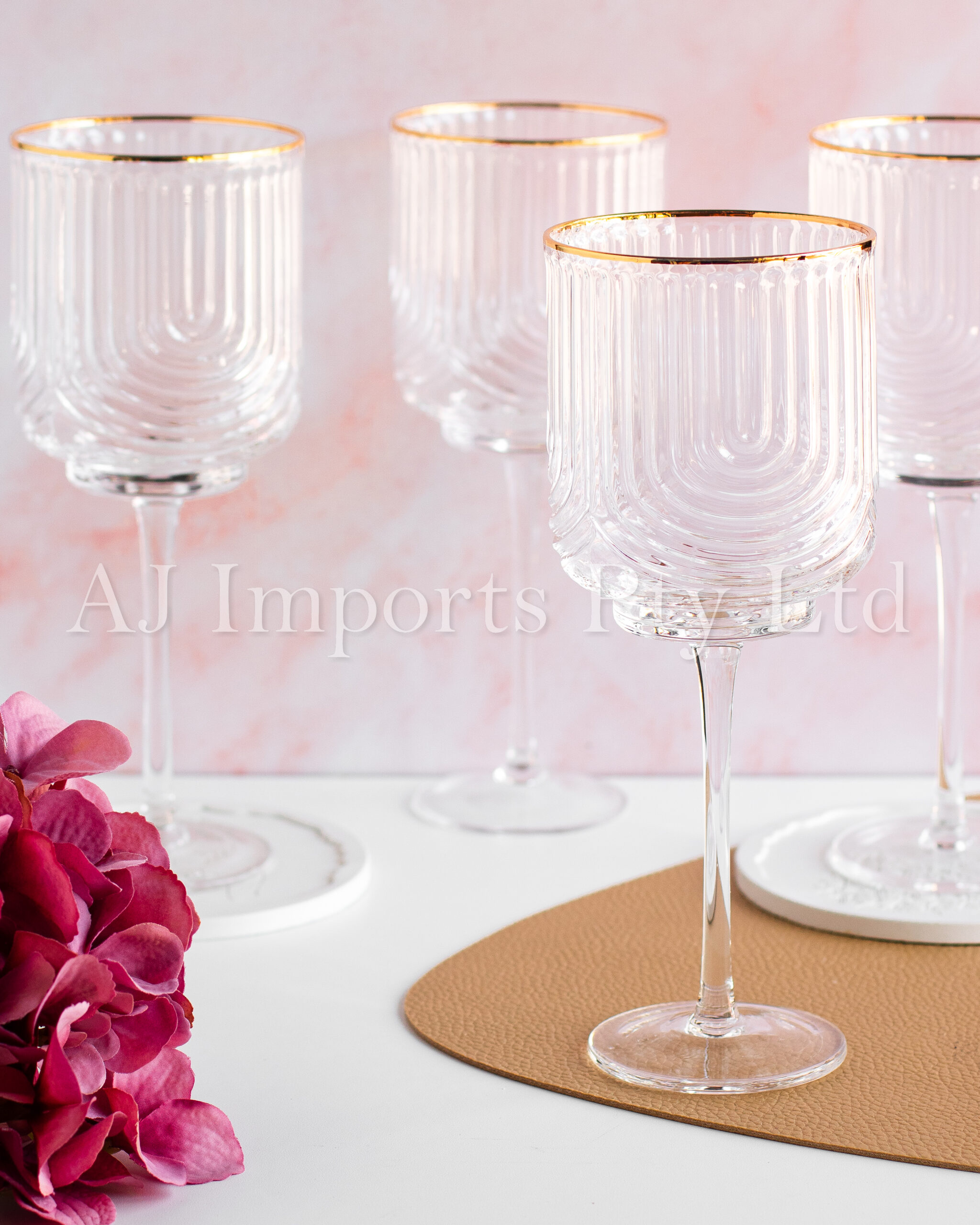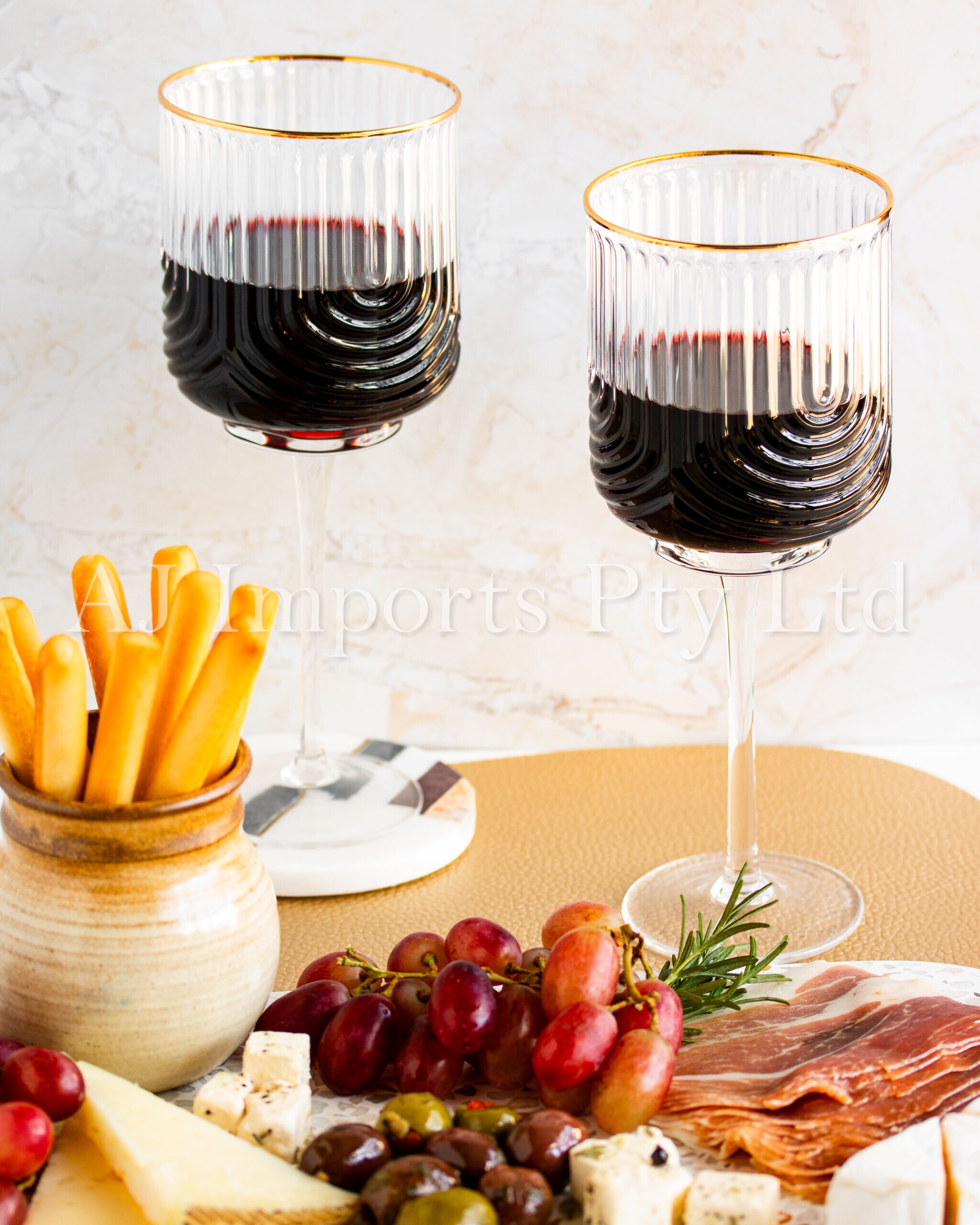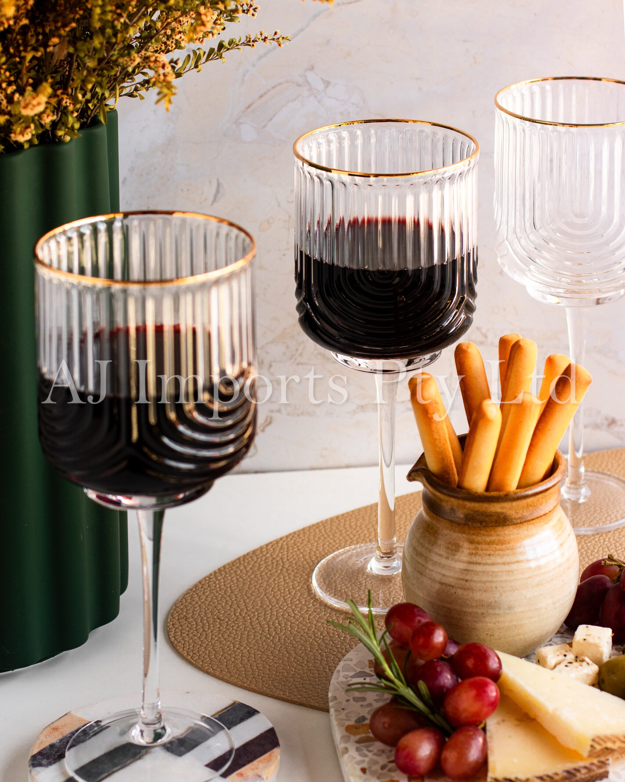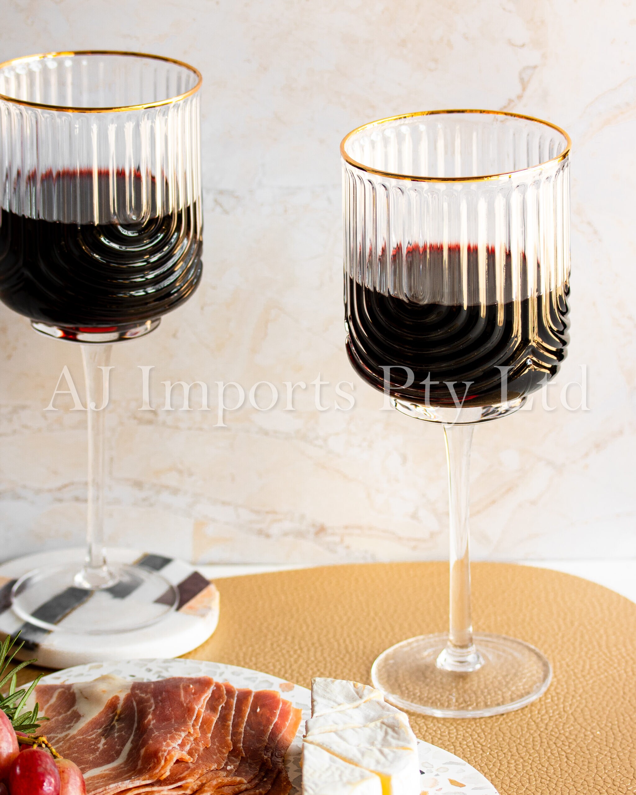 Crafted with meticulous attention to detail, these glasses boast a timeless footed base that not only enhances their aesthetic appeal but also ensures stability and balance. The luxurious gold rim adds a lavish touch, elevating your wine-drinking experience to new heights of sophistication.