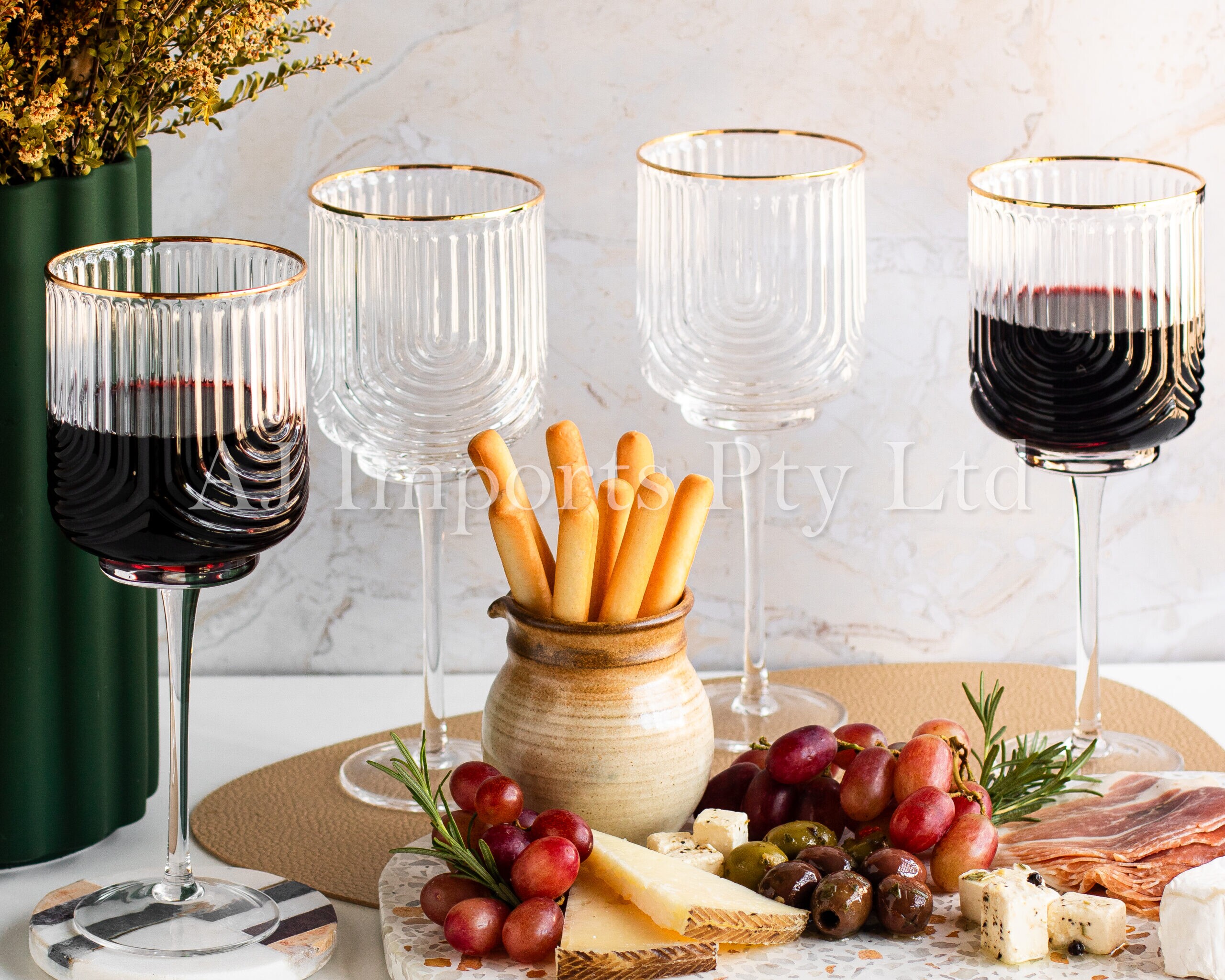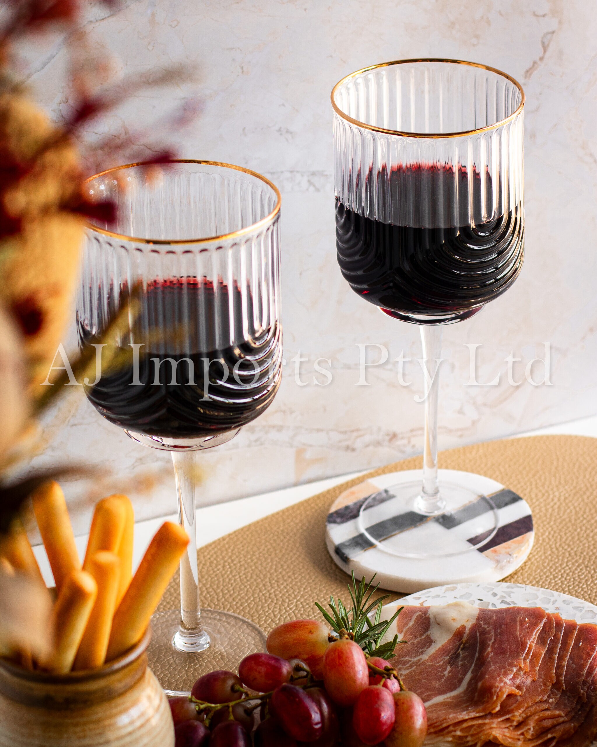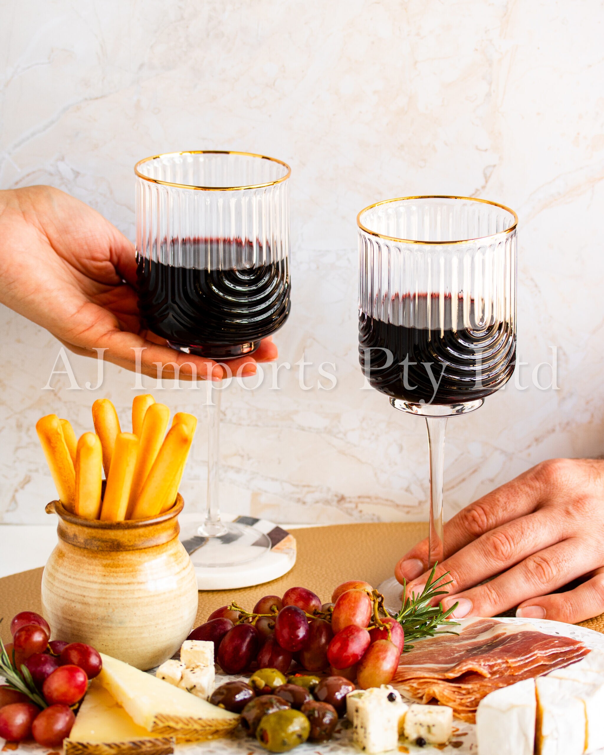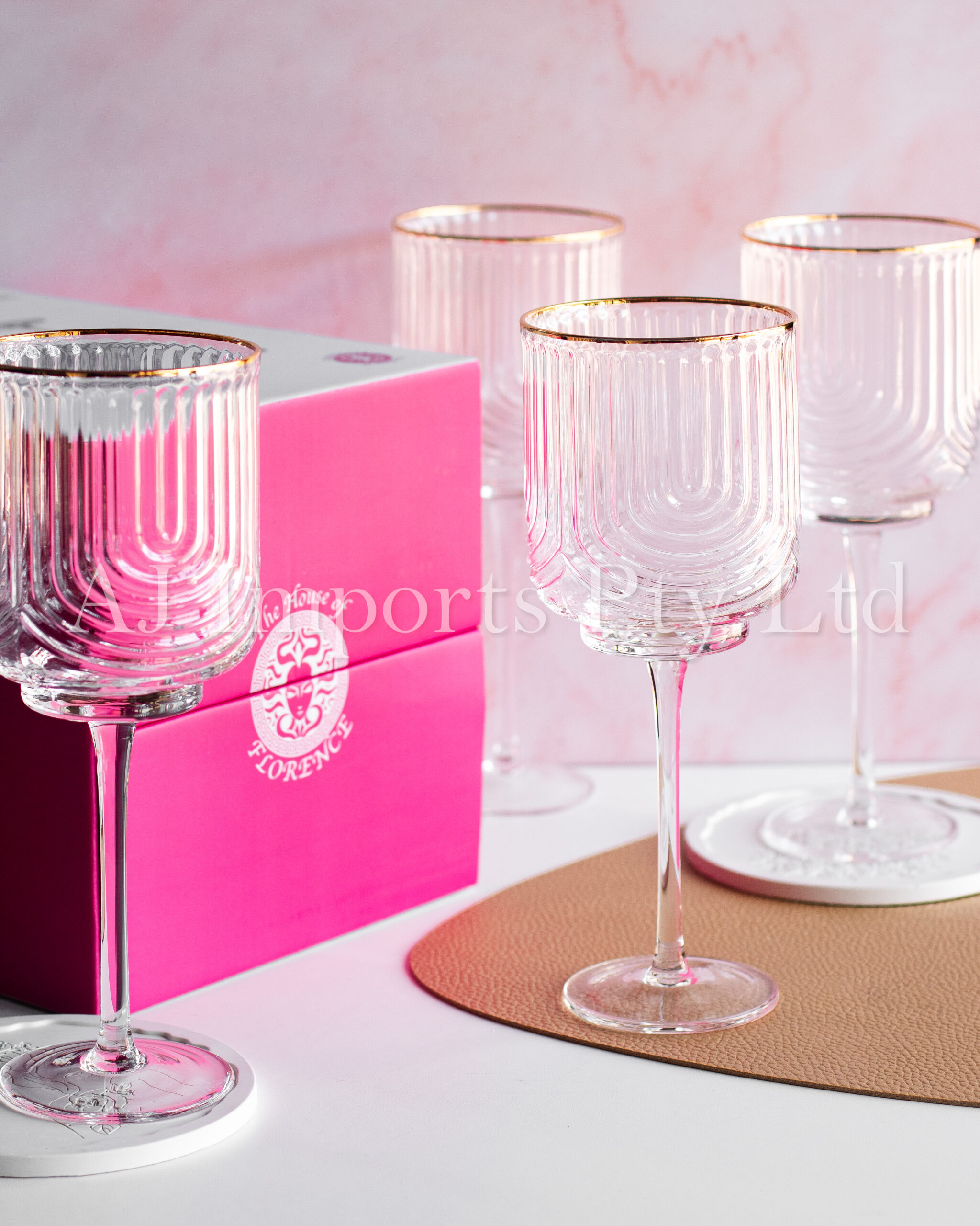 Crafted with meticulous attention to detail, these glasses boast a timeless footed base that not only enhances their aesthetic appeal but also ensures stability and balance. The luxurious gold rim adds a lavish touch, elevating your wine-drinking experience to new heights of sophistication.