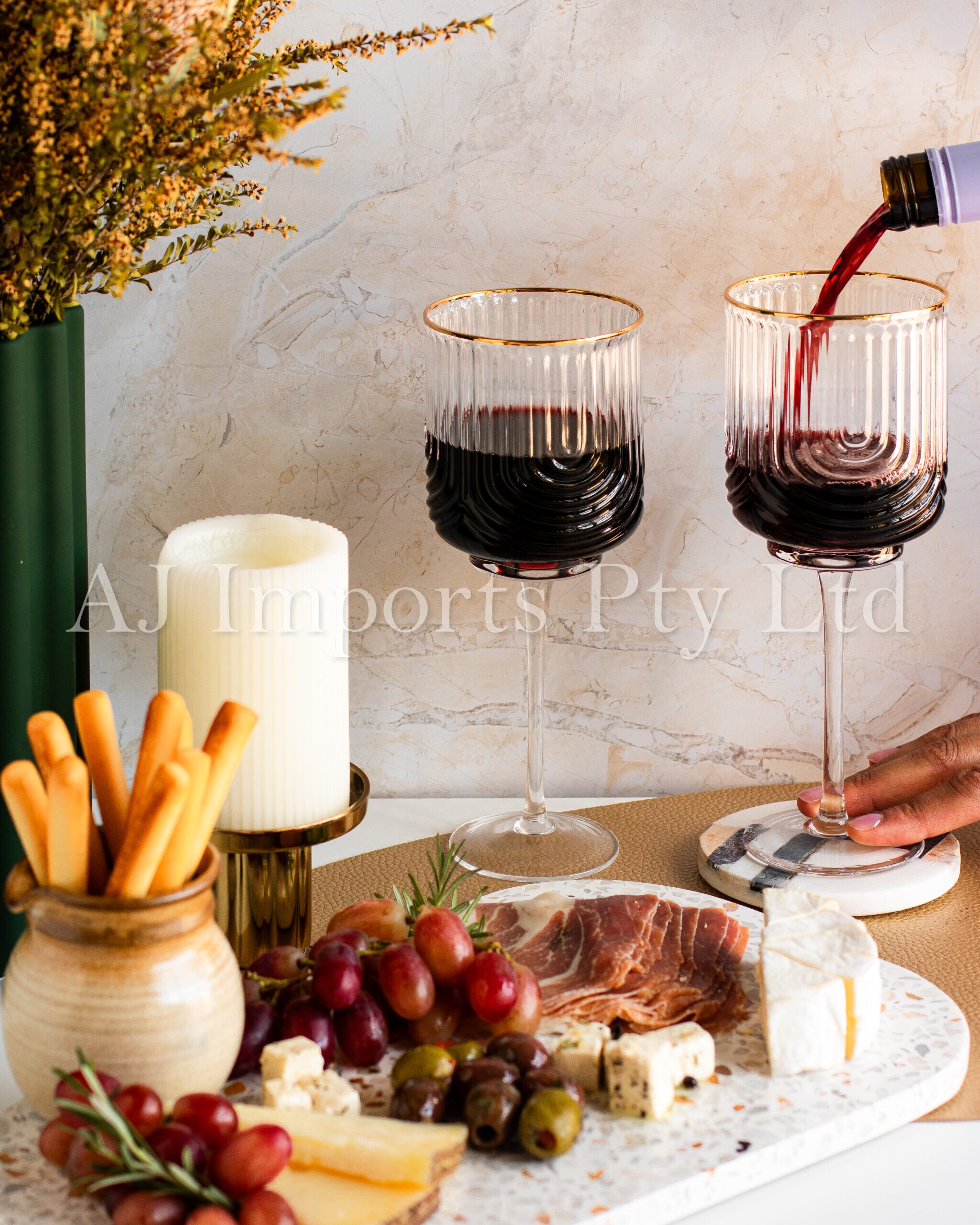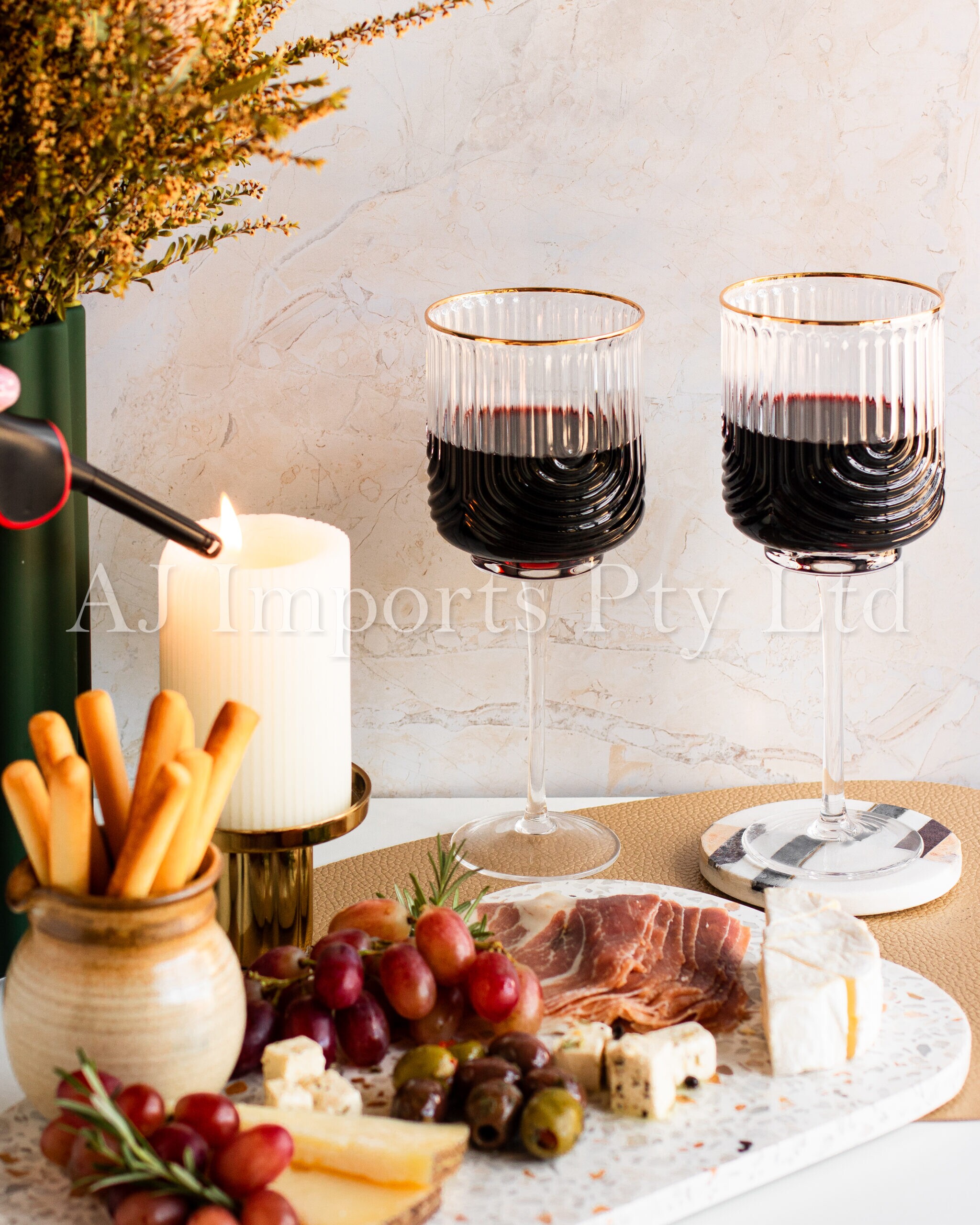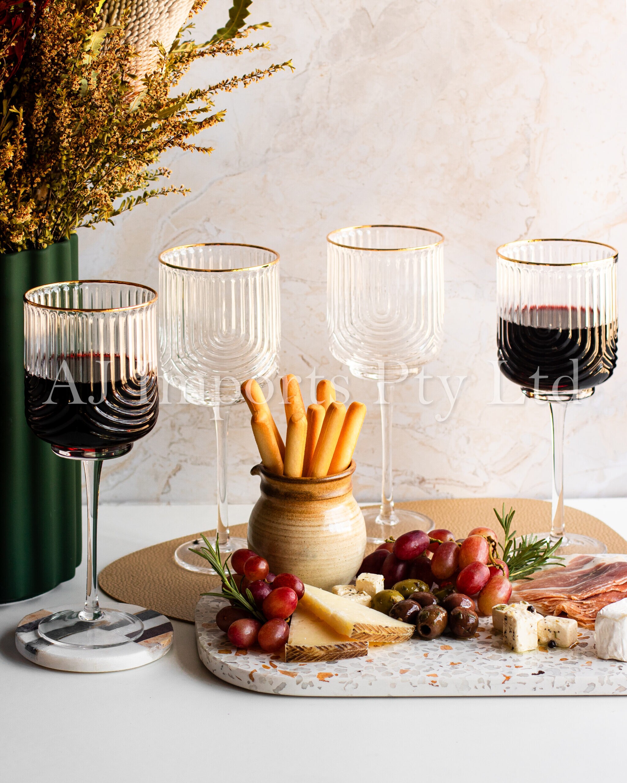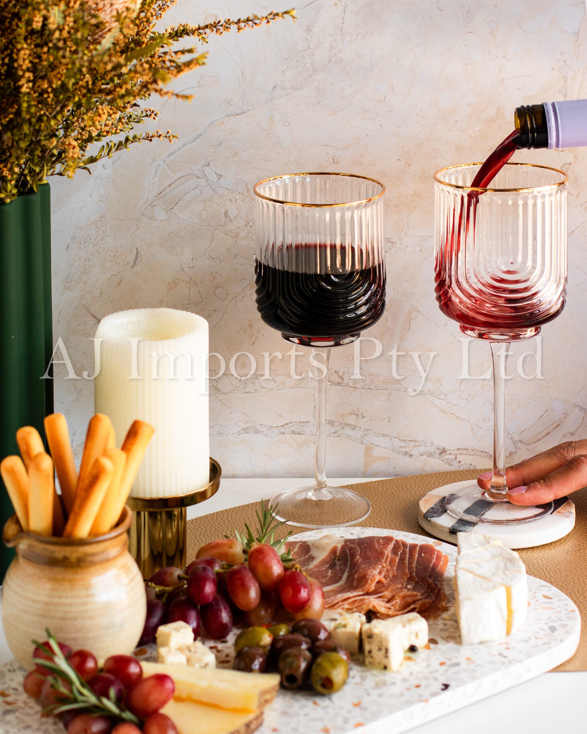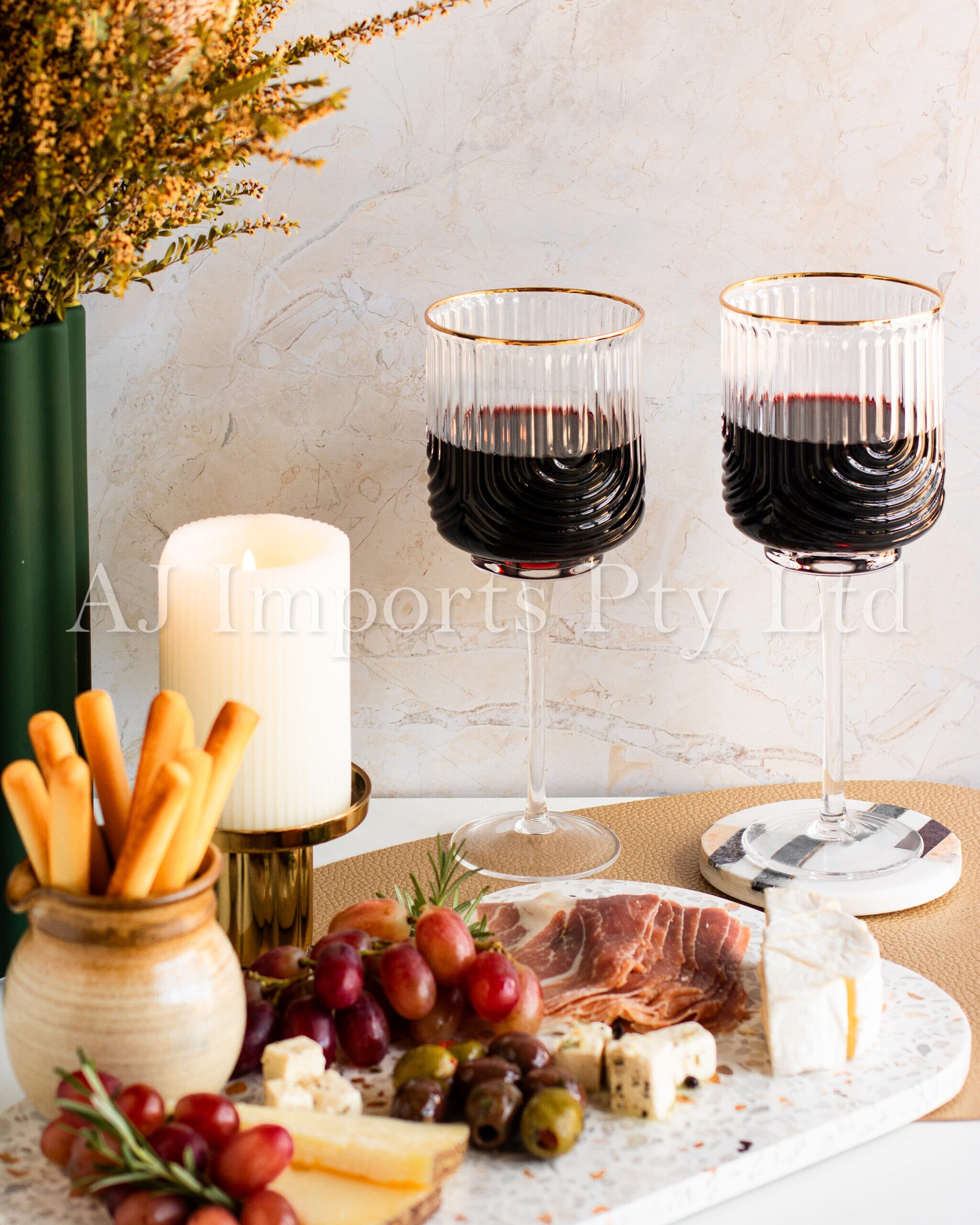 Crafted with meticulous attention to detail, these glasses boast a timeless footed base that not only enhances their aesthetic appeal but also ensures stability and balance. The luxurious gold rim adds a lavish touch, elevating your wine-drinking experience to new heights of sophistication.