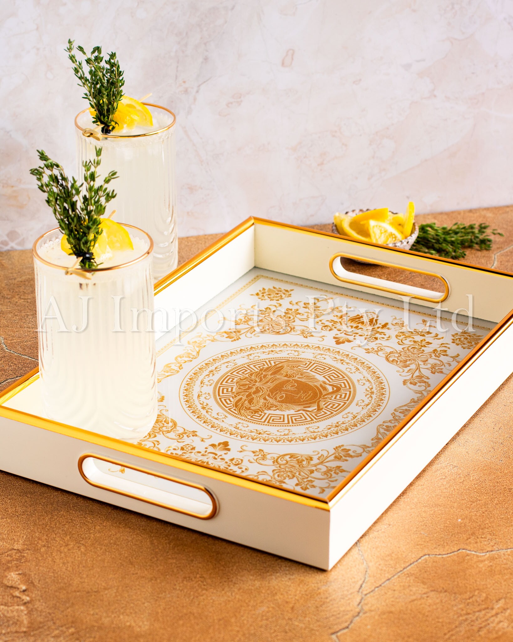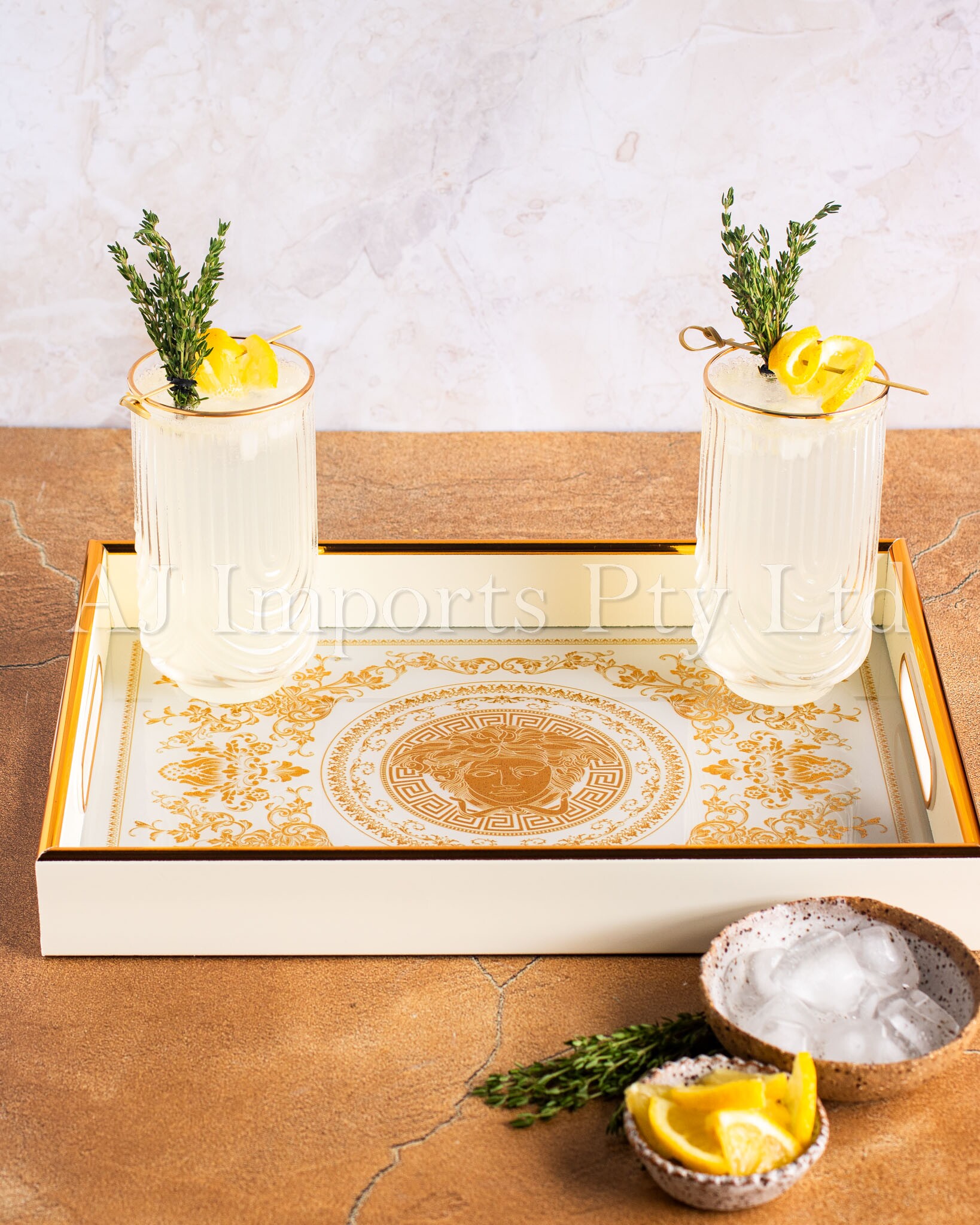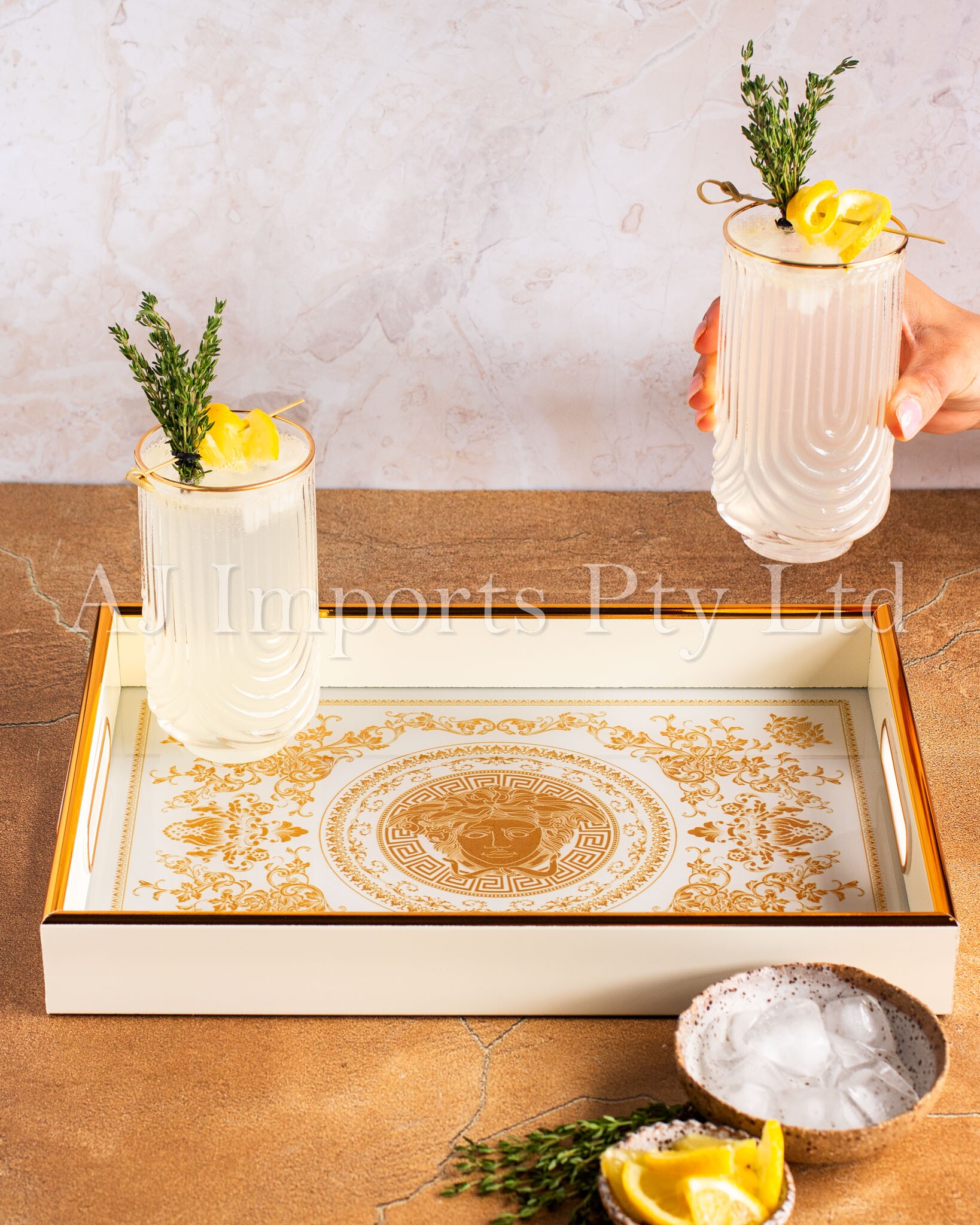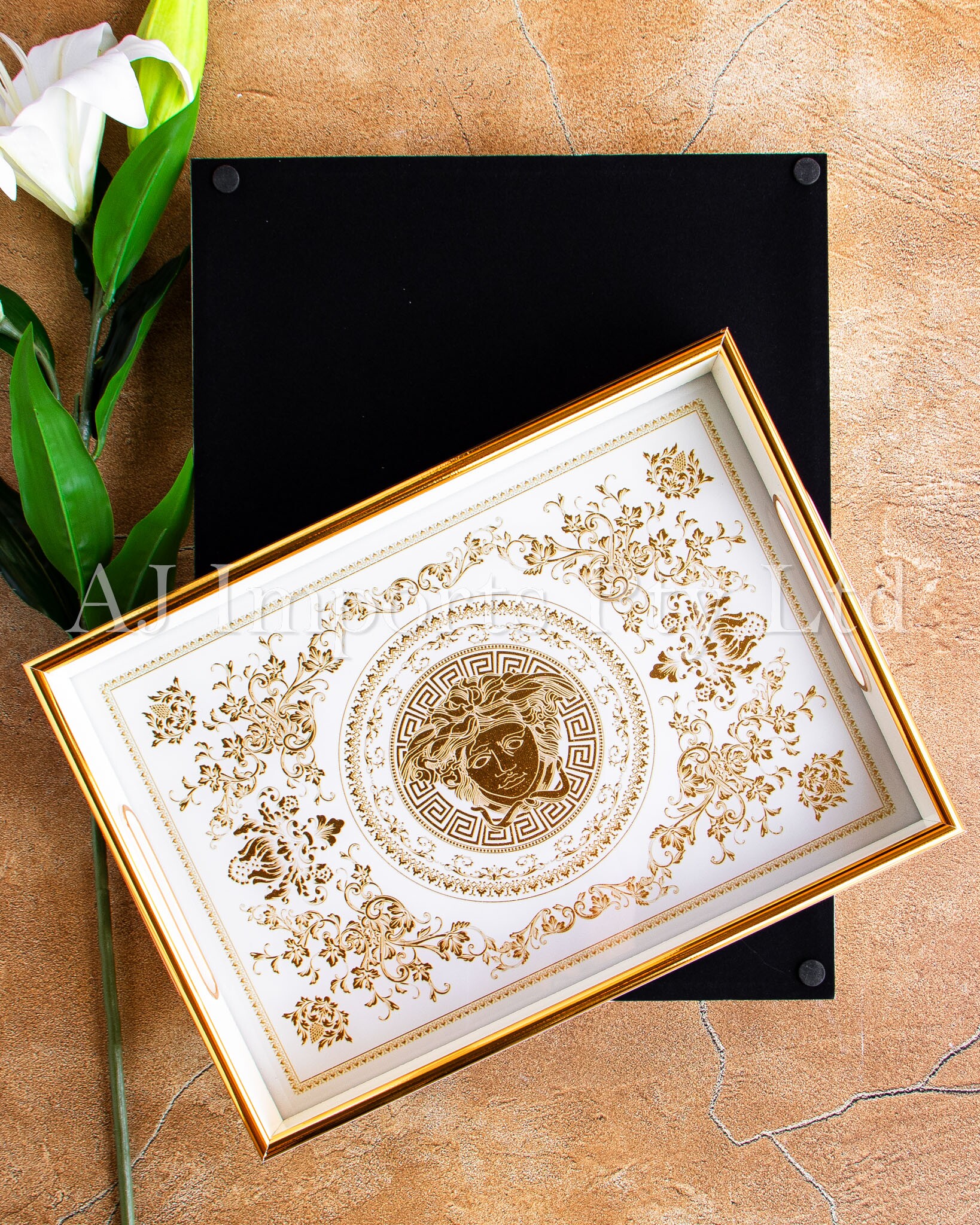 Elevate your hosting with our opulent Medusa Face Serving Tray Set. Crafted in sleek white and adorned with lavish gold accents, each rectangular tray features the iconic Medusa motif, adding a touch of luxury to any occasion. Perfect for serving appetizers, desserts, or cocktails in style, these trays are both functional and decorative, making them an exquisite addition to your home decor. Whether you’re entertaining guests or simply indulging in a moment of sophistication, our Medusa Face Serving Tray Set promises to captivate with its timeless elegance and regal charm.