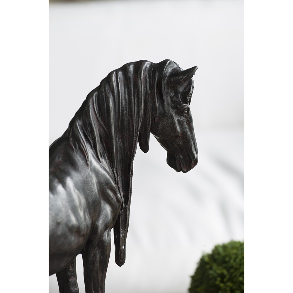 This statue captures the wild splendour of the horse with its realistic detailing, lustrous black finish, and subtle red accents. Feature this stunning horse statue in a traditional office, rustic great room, or globally inspired living room for a touch of classic style. With its gentle look, thick mane, and dynamic appearance, this statue makes a stunning gift for any horse lover.