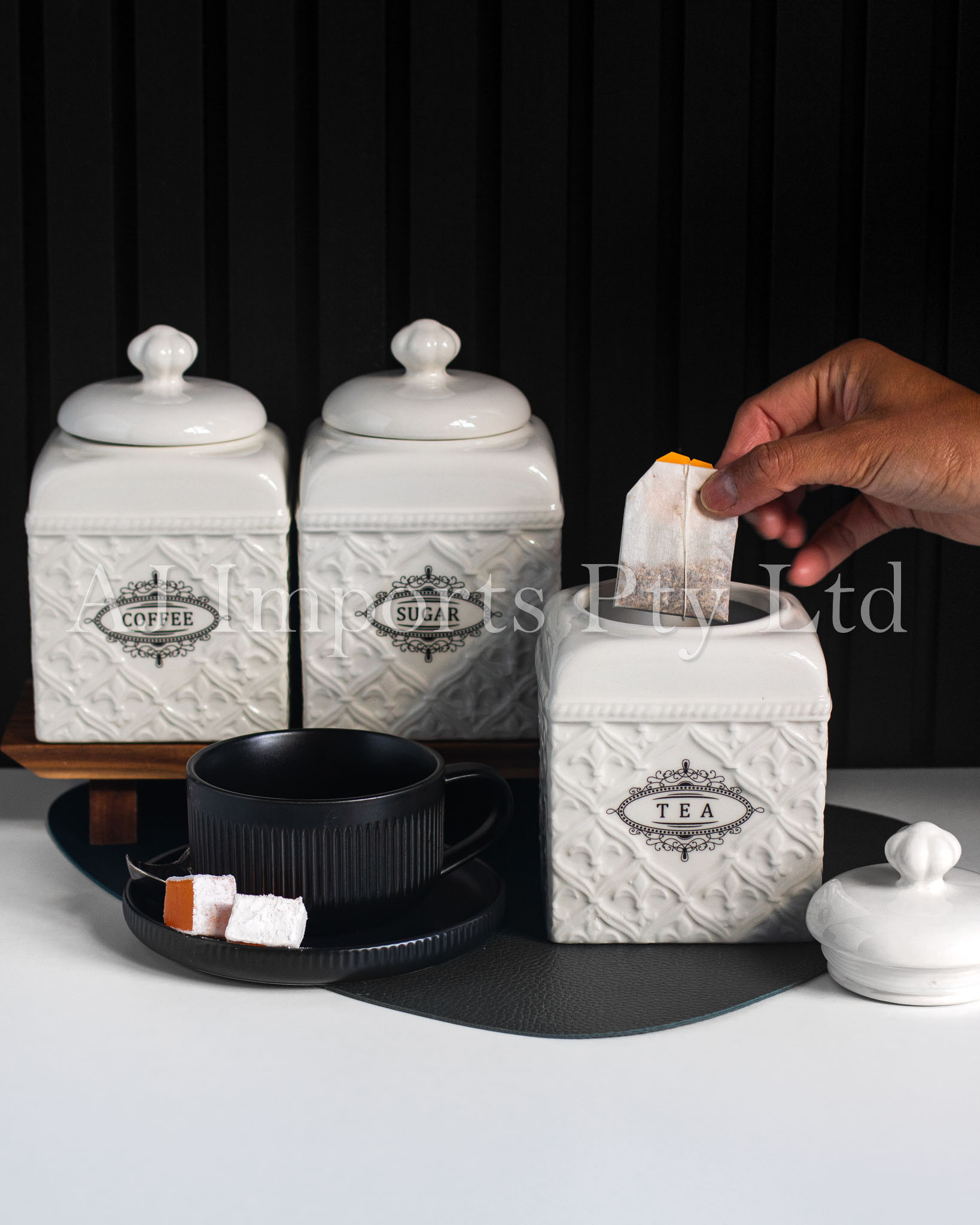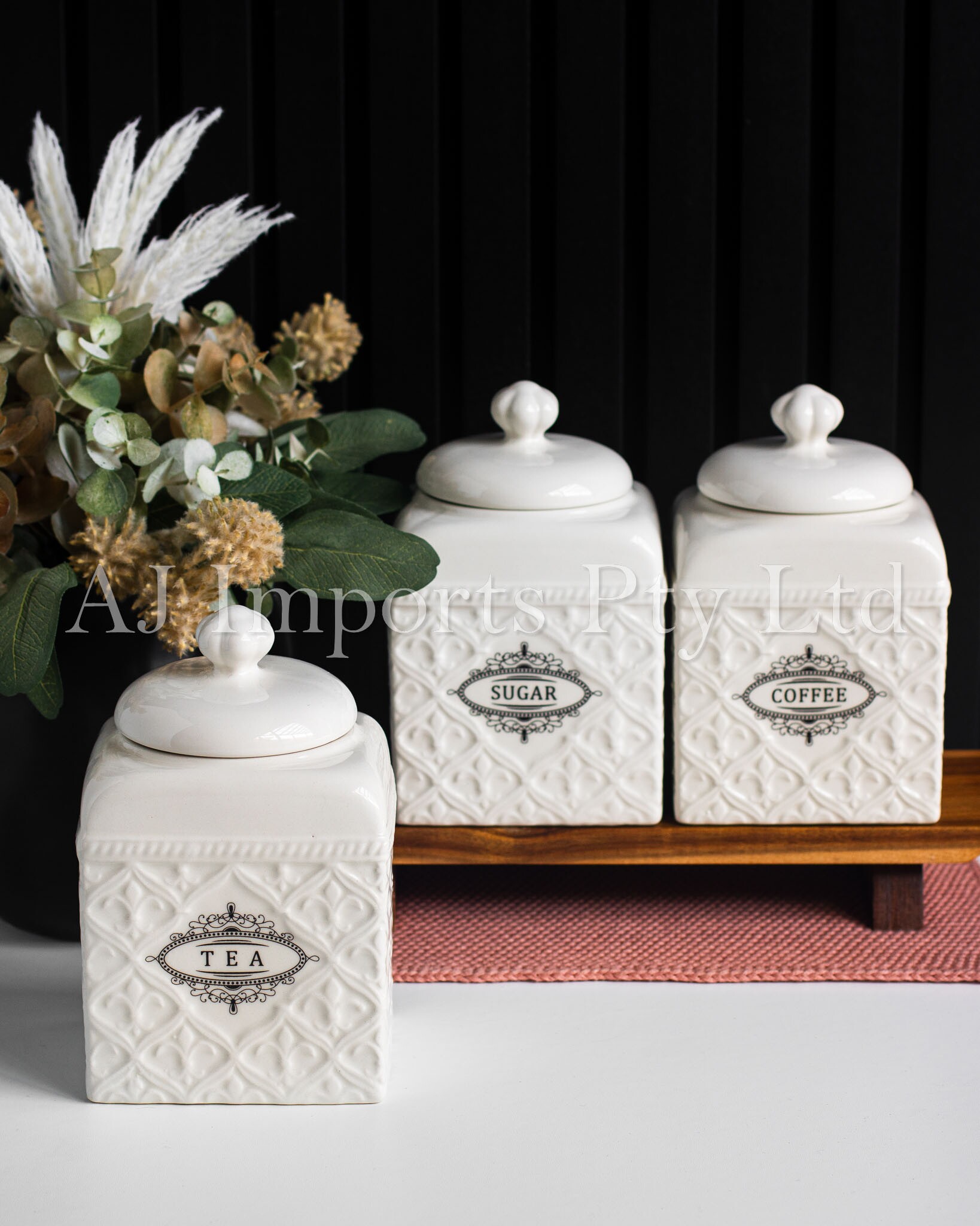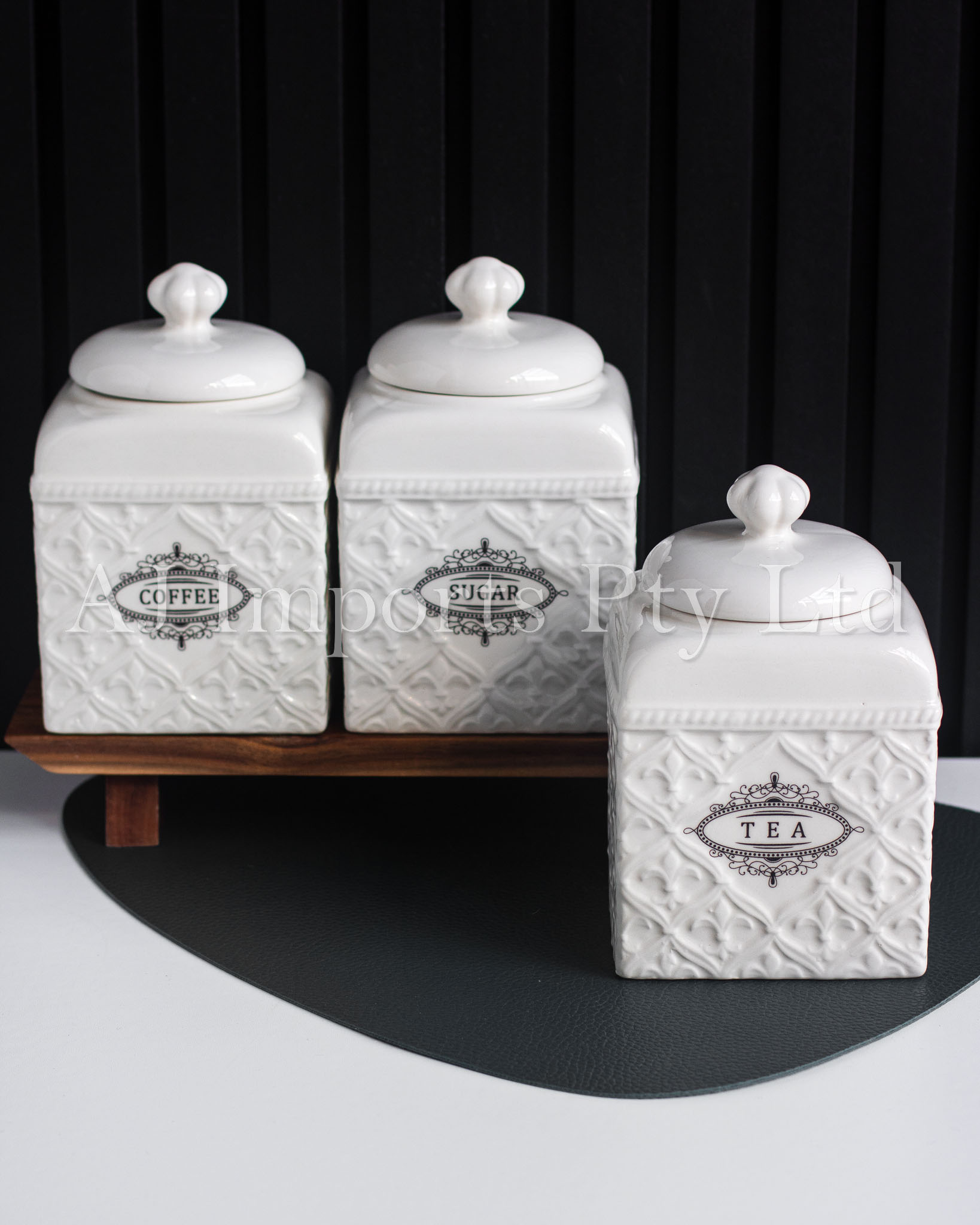 This set of three canisters, perfect for storing sugar, tea, and coffee, combines elegance and functionality to enhance any kitchen decor. Each canister is crafted from high-quality, durable materials, finished in a pristine white hue that complements a wide range of kitchen styles. The canisters feature an exquisite embossed European design, adding a touch of sophistication and charm. The intricate patterns not only provide an aesthetically pleasing look but also offer a tactile experience. The airtight lids ensure the contents remain fresh and flavorful, making this canister set both a practical and stylish addition to your kitchen countertop.