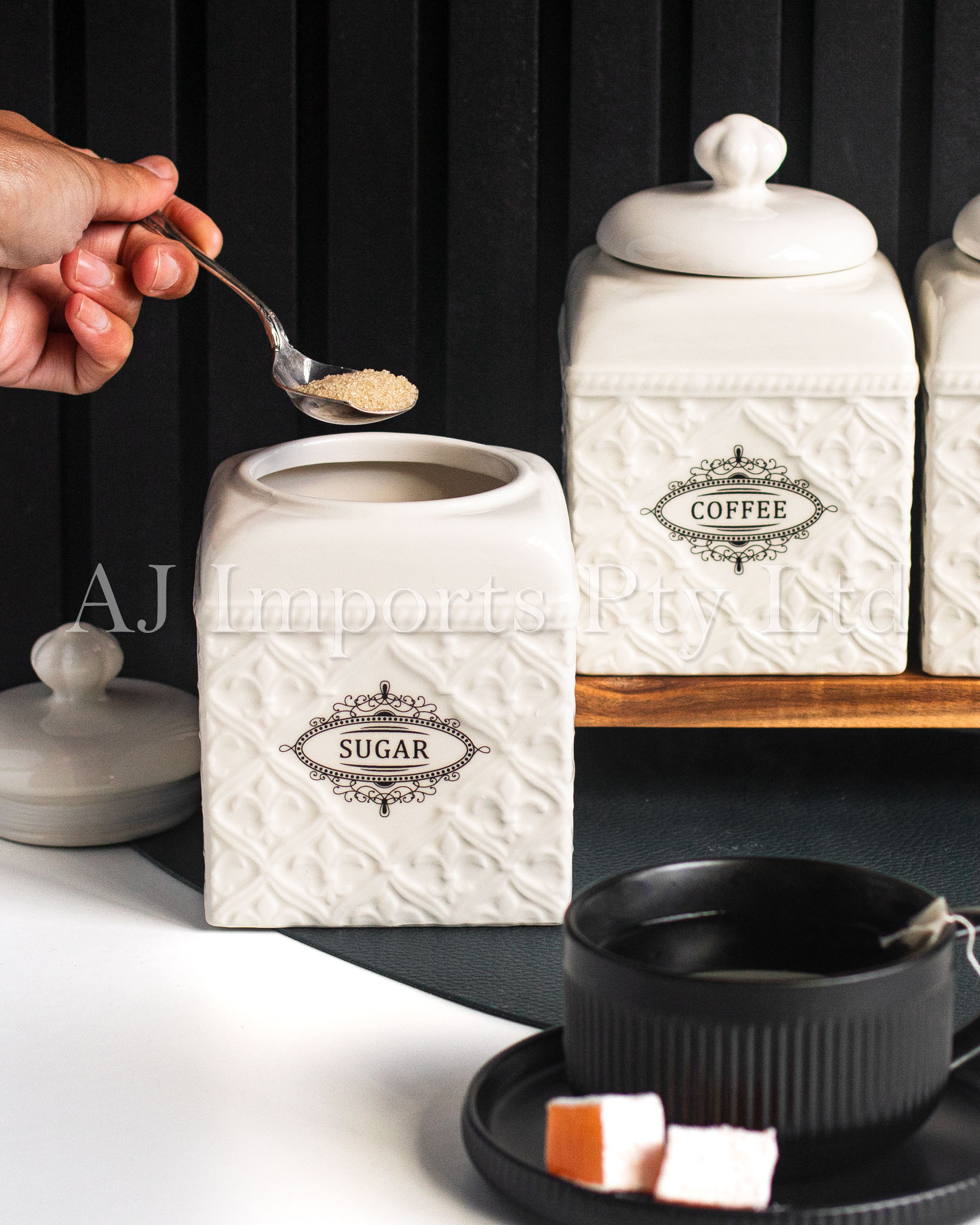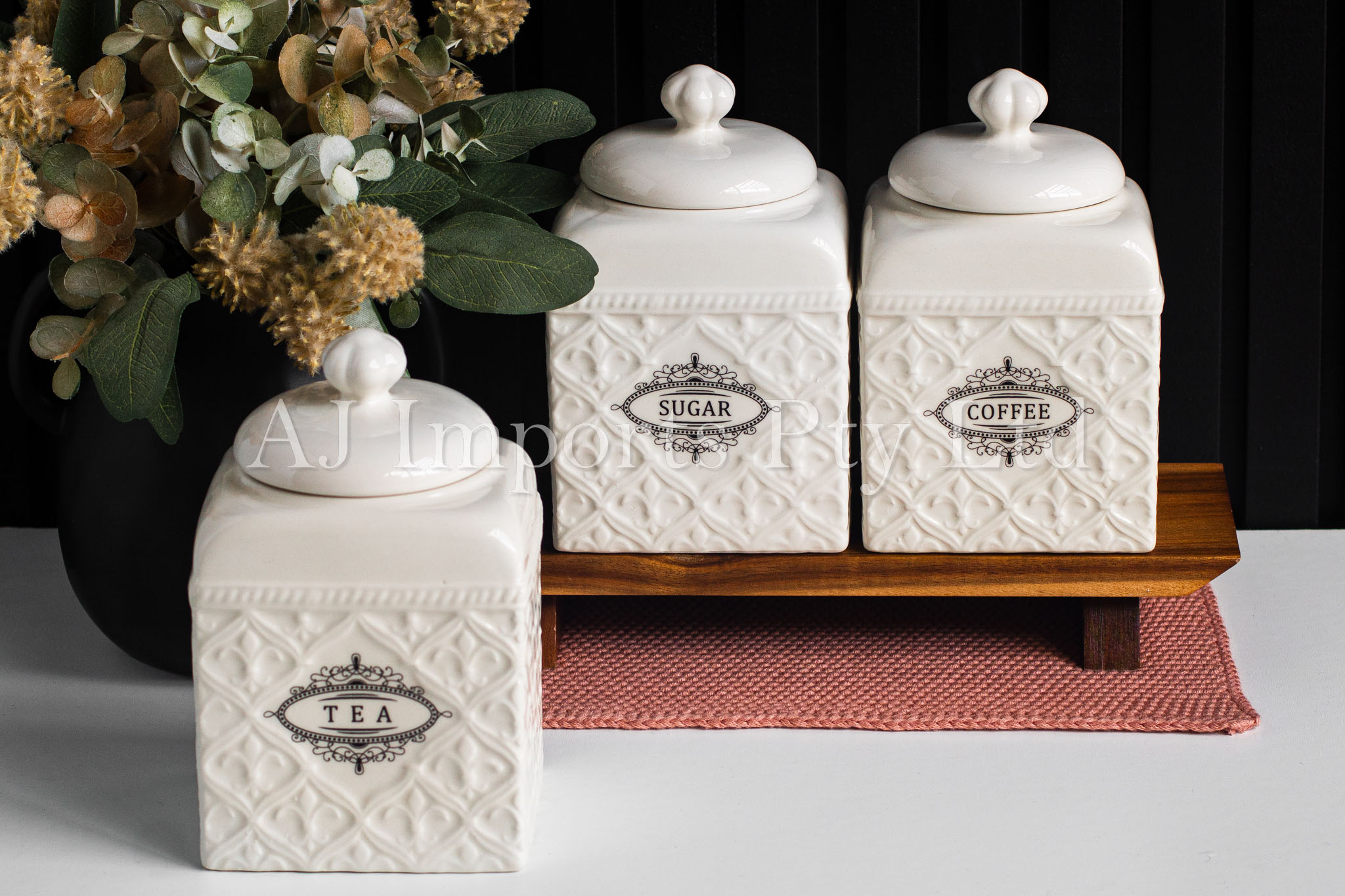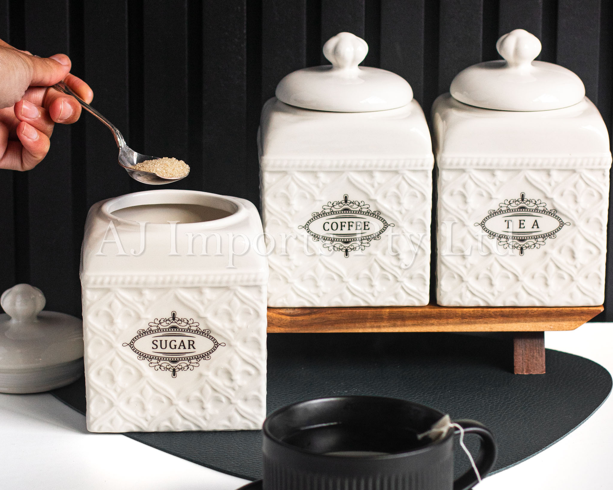 This set of three canisters, perfect for storing sugar, tea, and coffee, combines elegance and functionality to enhance any kitchen decor. Each canister is crafted from high-quality, durable materials, finished in a pristine white hue that complements a wide range of kitchen styles. The canisters feature an exquisite embossed European design, adding a touch of sophistication and charm. The intricate patterns not only provide an aesthetically pleasing look but also offer a tactile experience. The airtight lids ensure the contents remain fresh and flavorful, making this canister set both a practical and stylish addition to your kitchen countertop.