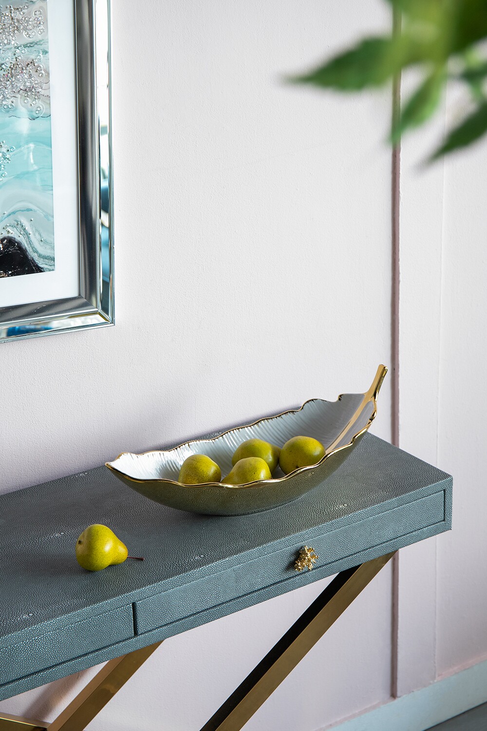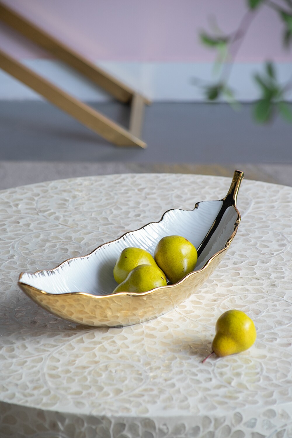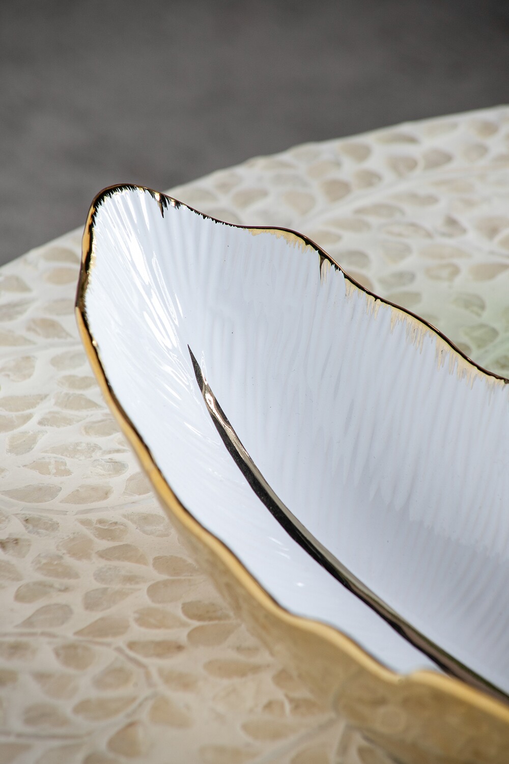 Shaped like a delicate leaf and finished with shimmering gold edges, this versatile ceramic tray can elevate your everyday essentials — from jewelry and trinkets to keys and wrapped treats. Whether placed on a coffee table, dresser, or entryway console, it adds a subtle yet stunning touch of modern luxury to your home.
