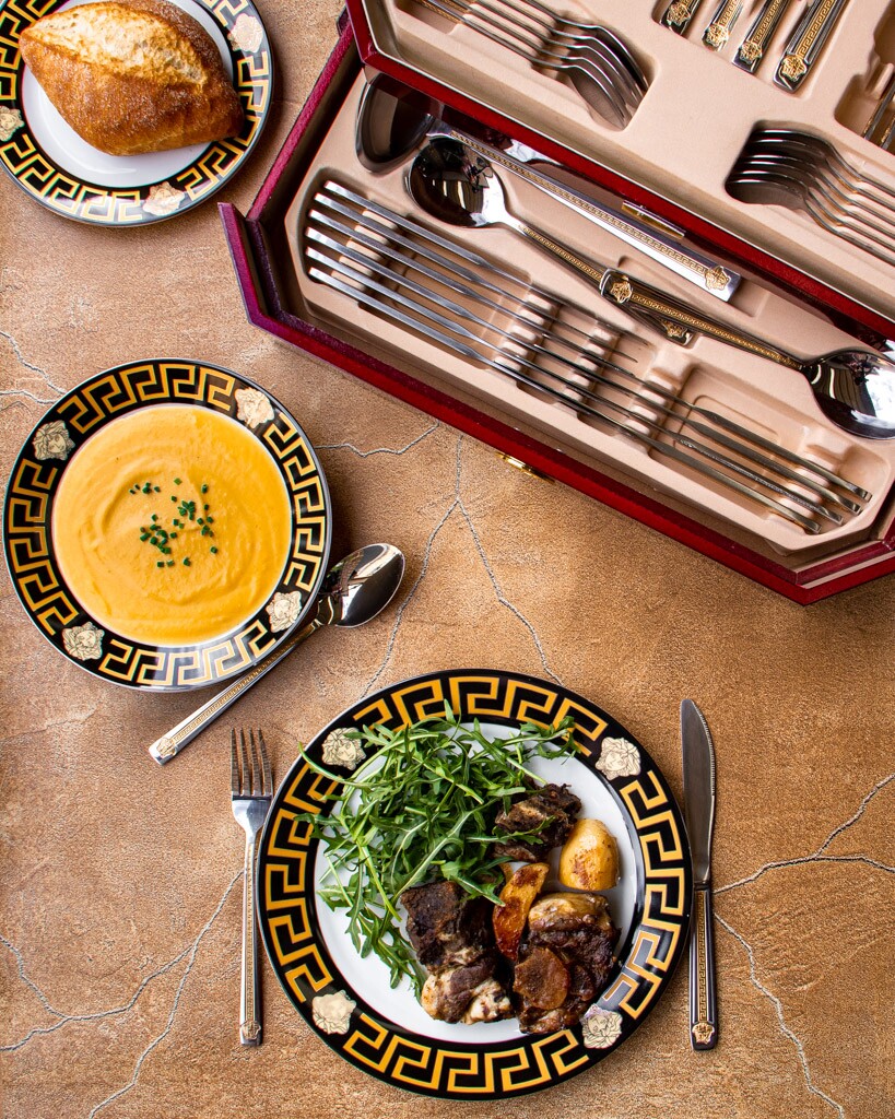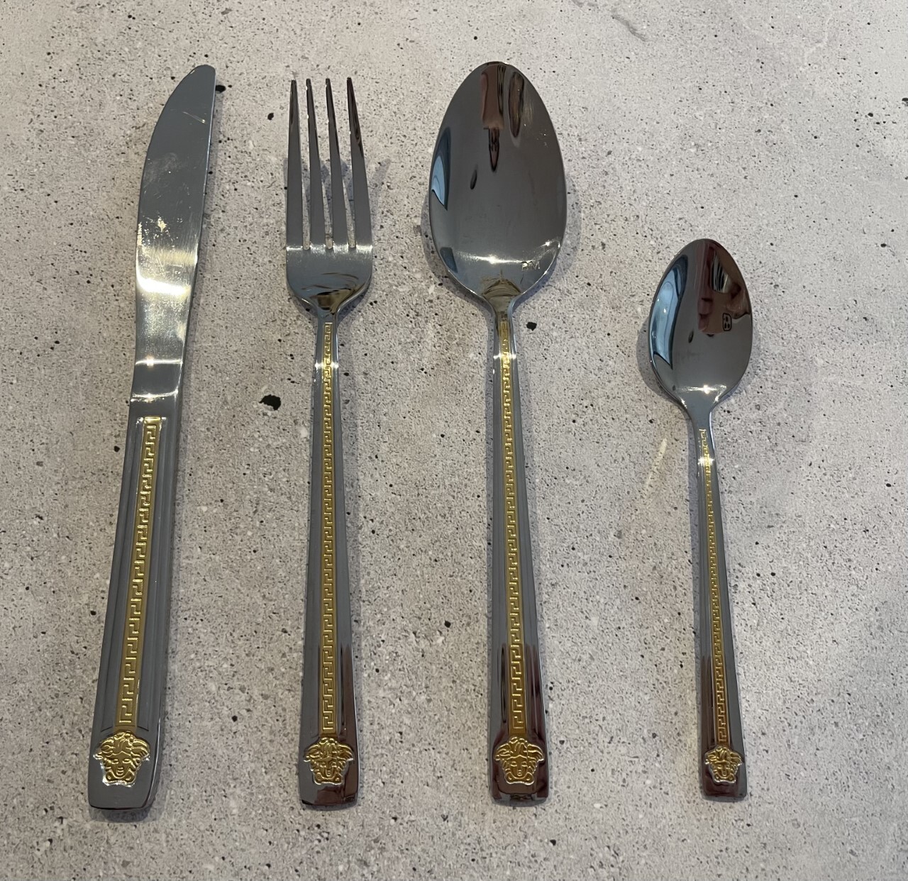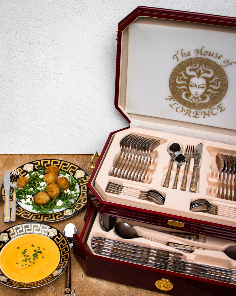 The standout feature of this set is the intricate Medusa face motif adorning each handle, exuding an aura of classical mythology and timeless allure. Complementing this motif is a stunning Greek key pattern, symbolizing unity and infinity, adding a touch of ancient splendor to your table.