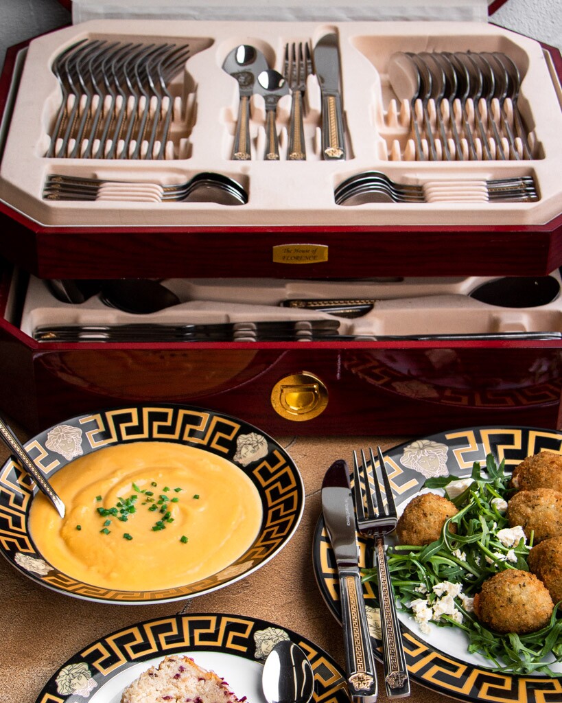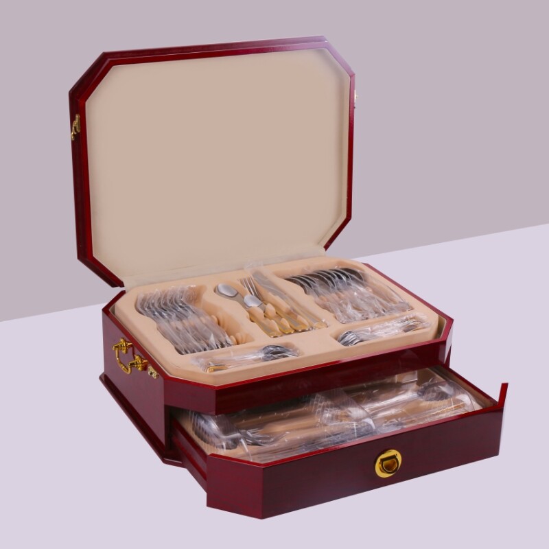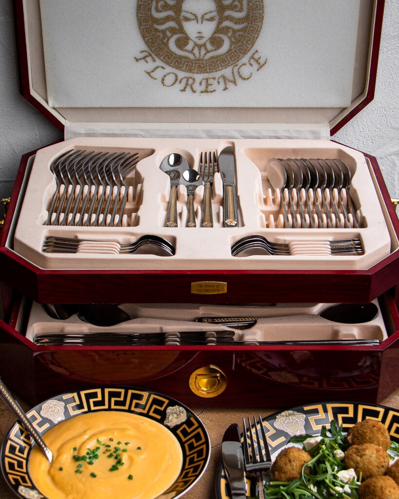 Packaged in a sumptuous wooden display case with a convenient draw, this set not only serves as a functional dining essential but also doubles as a captivating piece of art for your home. Whether you’re hosting a formal dinner party or simply enjoying a meal with loved ones, our Gold-Plated Cutlery Set promises to make every moment unforgettable. Elevate your dining experience with a touch of luxury that transcends ordinary utensils.