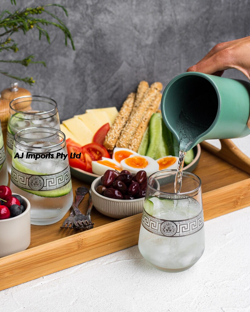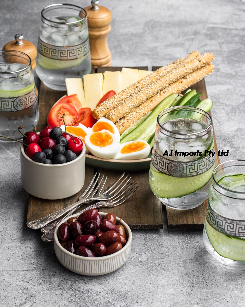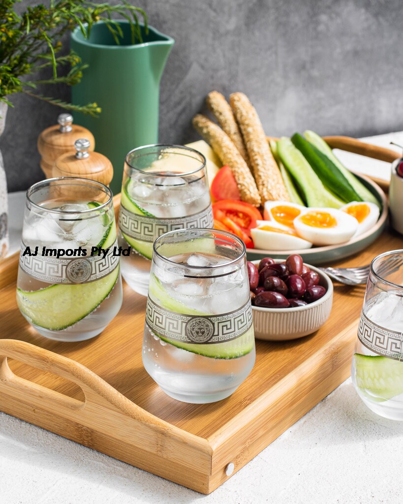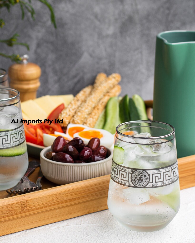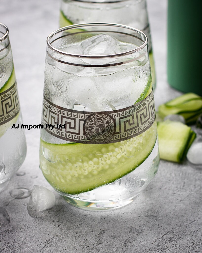 A set of four highball glasses exudes elegance with a silver Medusa Greek key design adorning their sleek exteriors. Crafted with precision, each glass embodies the timeless allure of Greek mythology, intertwining classical motifs with contemporary style. The silver hues gleam under ambient light, casting a mesmerizing aura reminiscent of Medusa’s legendary gaze. These glasses not only elevate any beverage they hold but also serve as exquisite conversation pieces, capturing the imagination with their intricate detailing and opulent charm. Perfect for imbuing gatherings with sophistication or adding a touch of luxury to everyday indulgence.