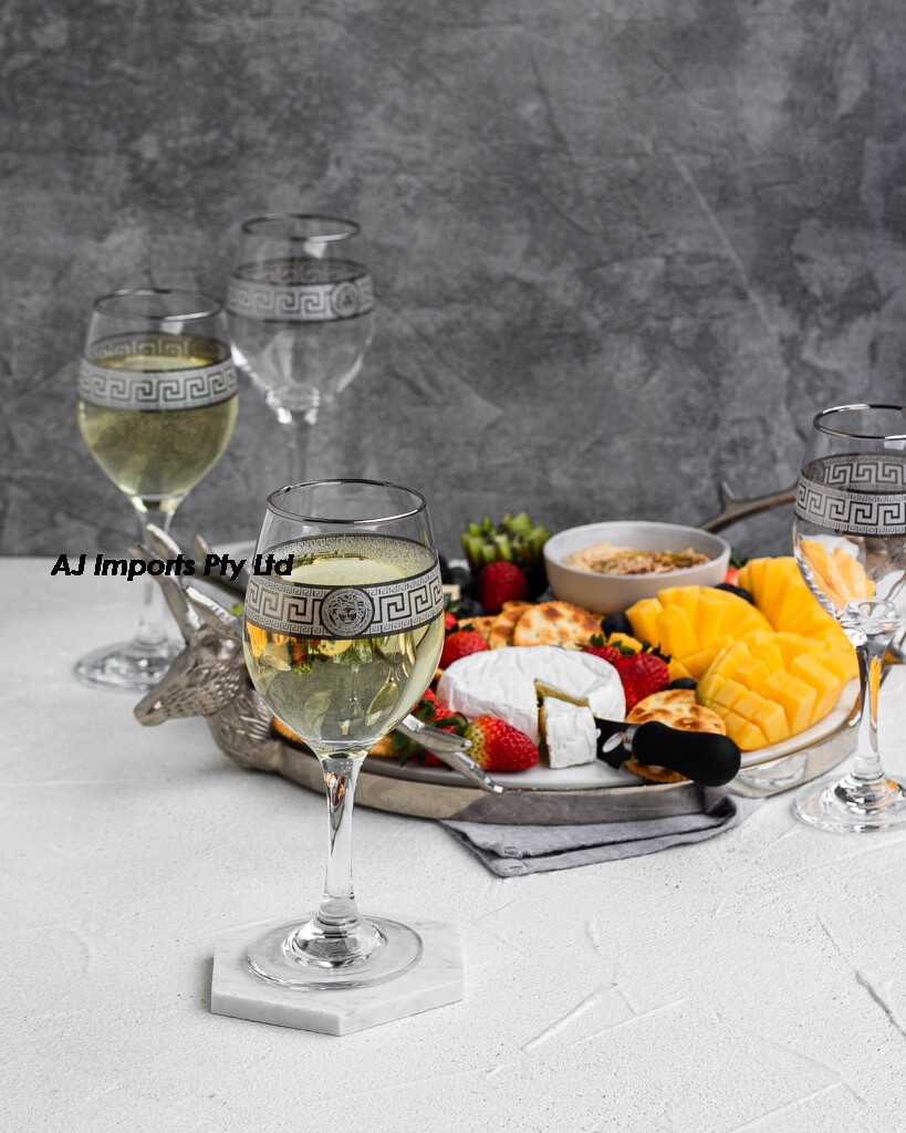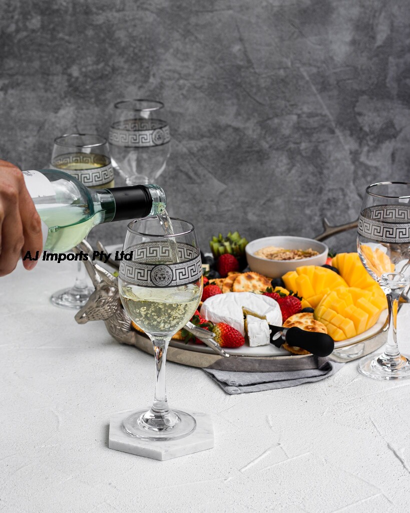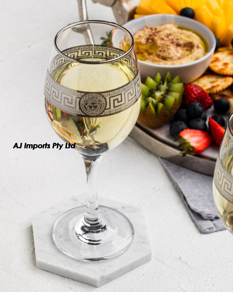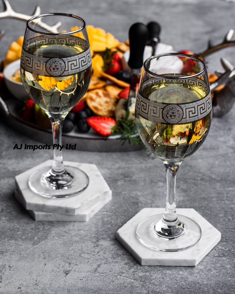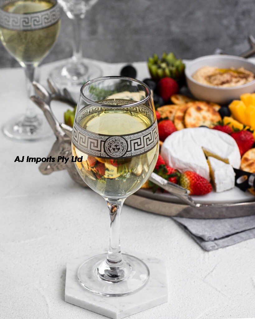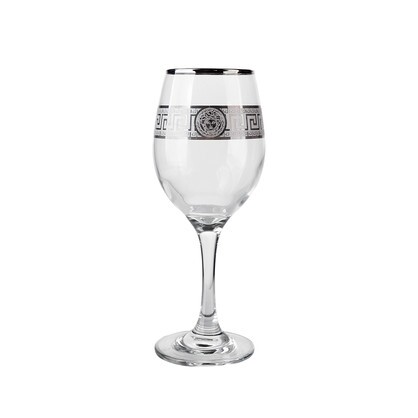 Elegant and enchanting, these silver Medusa Greek key design wine glasses captivate with their timeless beauty. Crafted with exquisite attention to detail, each glass embodies the allure of ancient mythology, featuring intricately engraved silver motifs inspired by the legendary Gorgon. Set against a backdrop of sleek, transparent glass, the Medusa design adds a touch of mystique to any table setting. With a set of four glasses, indulge in the pleasures of fine wine in style, as the shimmering silver accents elevate every sip to a celestial experience, merging classical elegance with contemporary refinement.