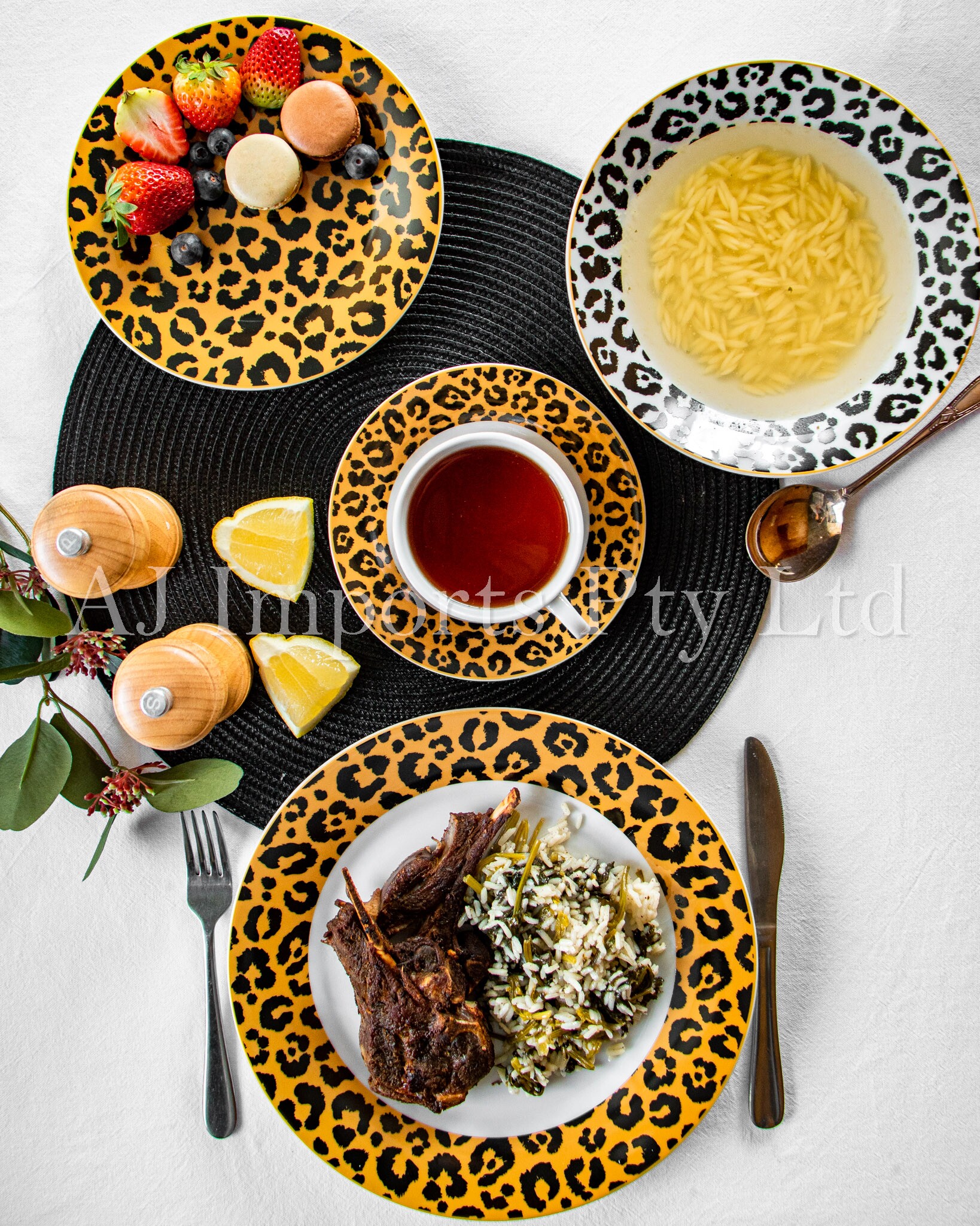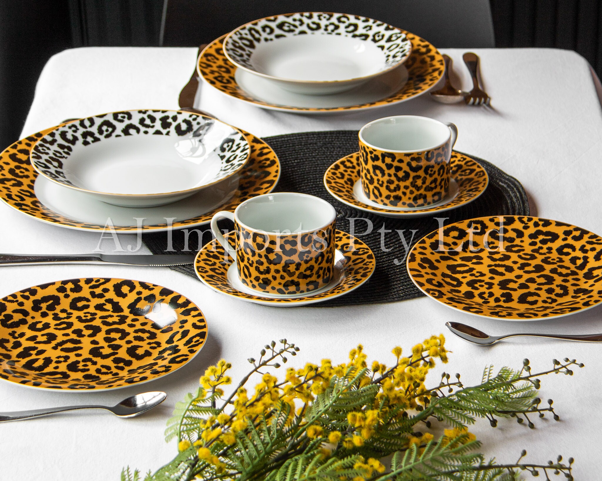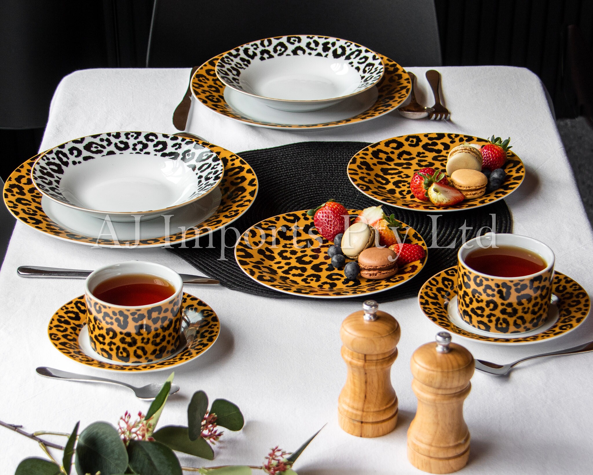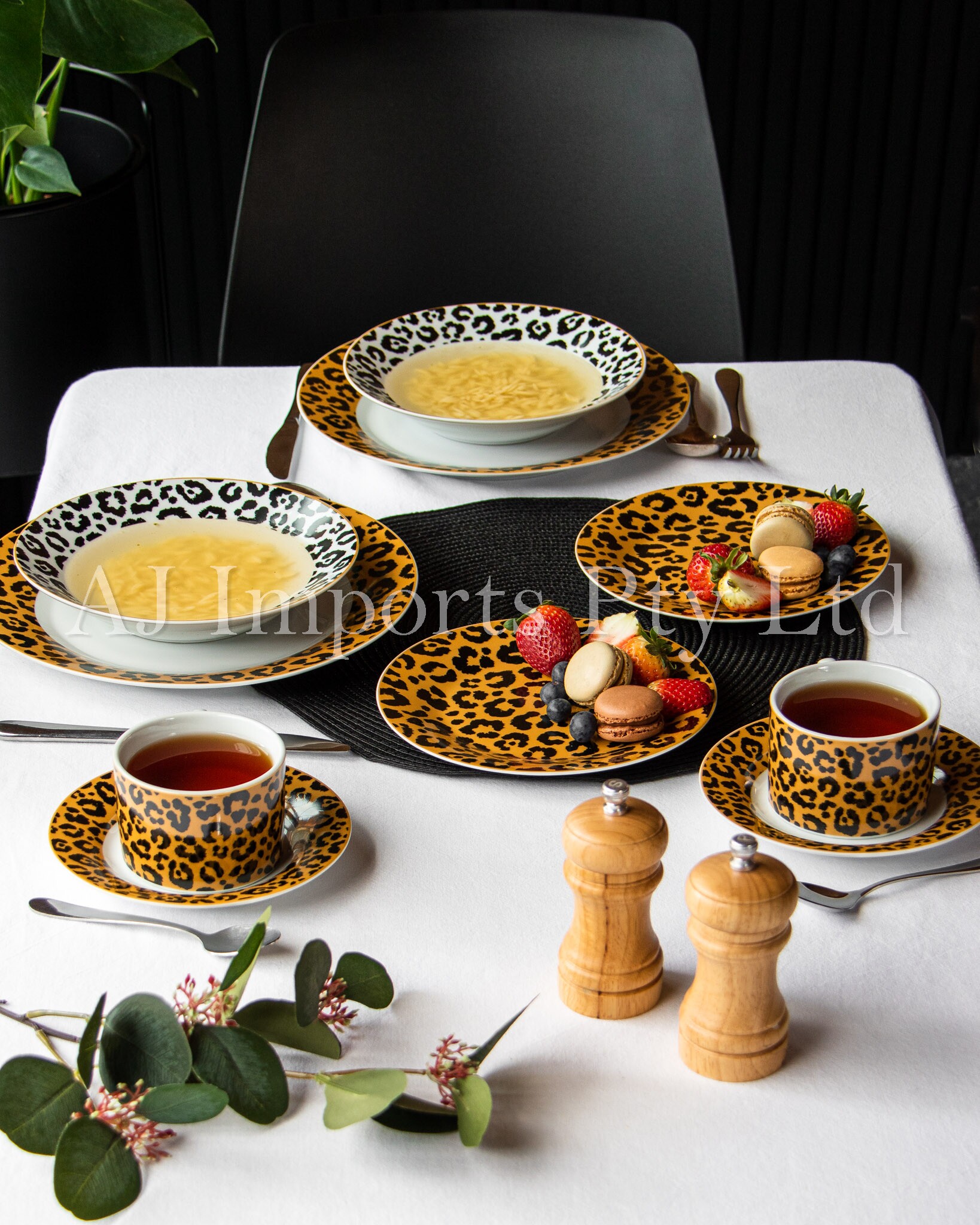 Introducing the epitome of elegance and wild sophistication – the Leopard print 20-piece Dinner Set in Honey Gold and Black. Designed to captivate and adorn your dining table with unparalleled charm, this set combines the exotic allure of leopard print with the timeless allure of rich honey gold and bold black accents.