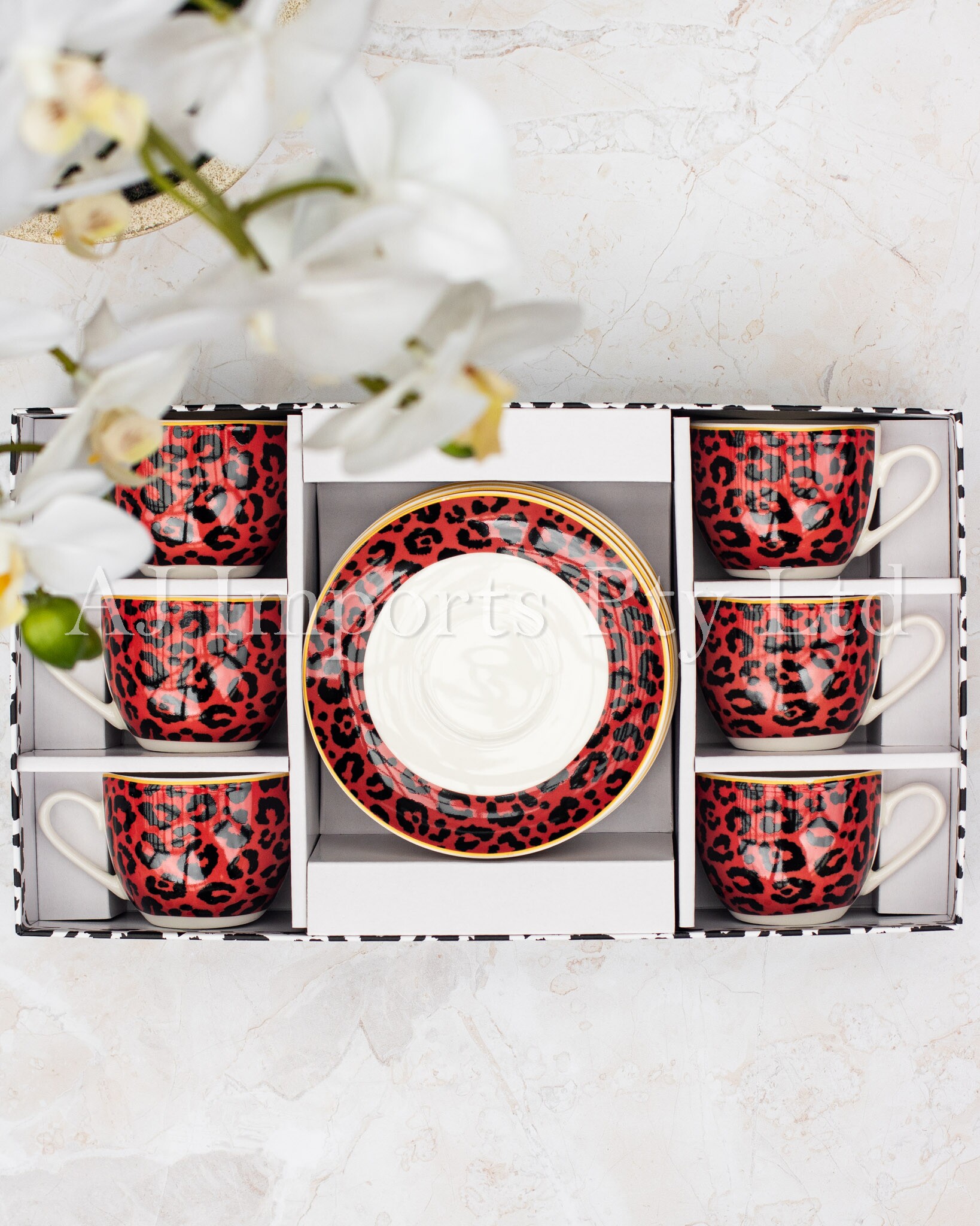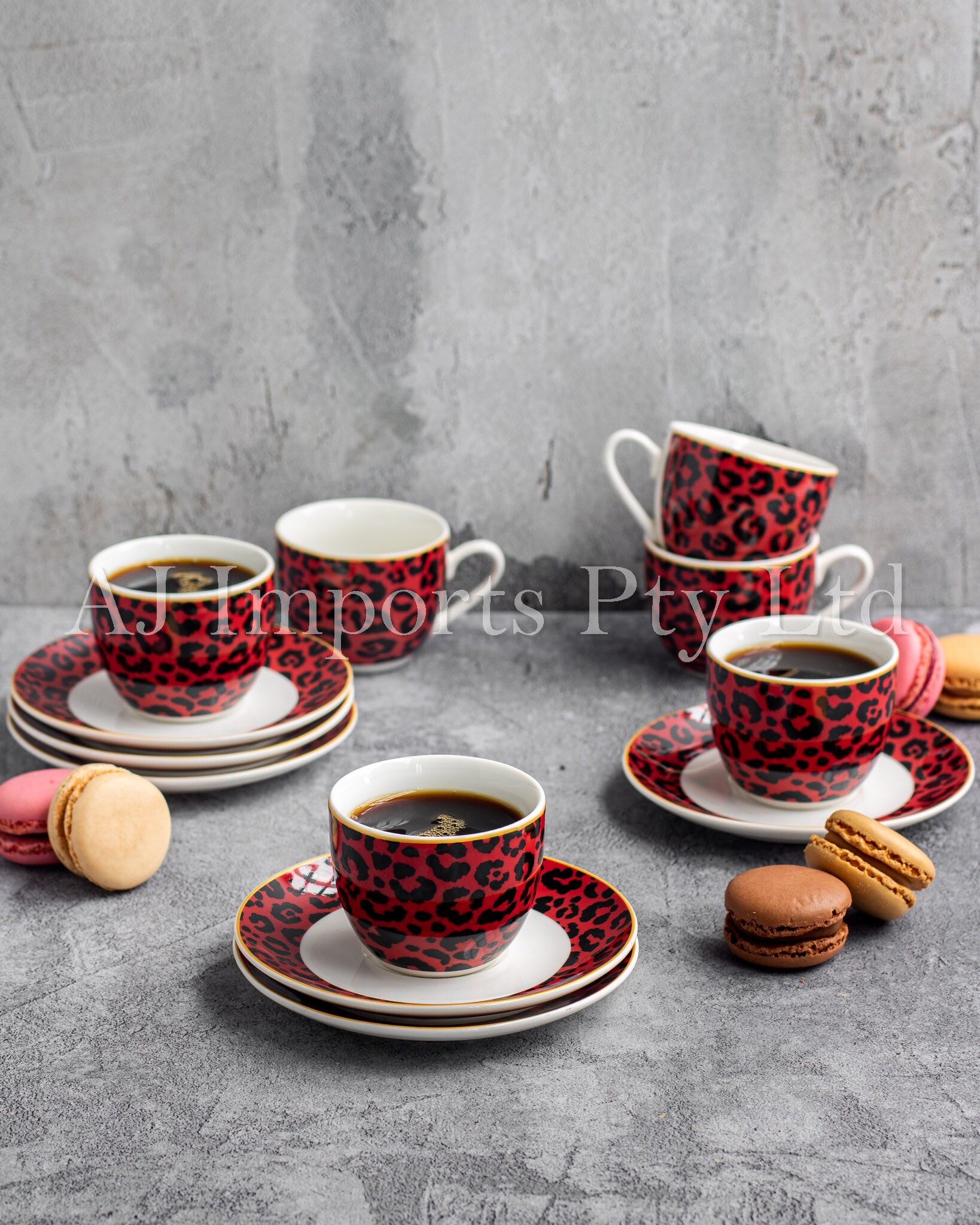 Each espresso cup features a striking red and black leopard print design, adding a touch of exotic flair to your table. The accompanying saucers are elegantly crafted to complement the cups, providing a perfect resting place for your espresso moments.
