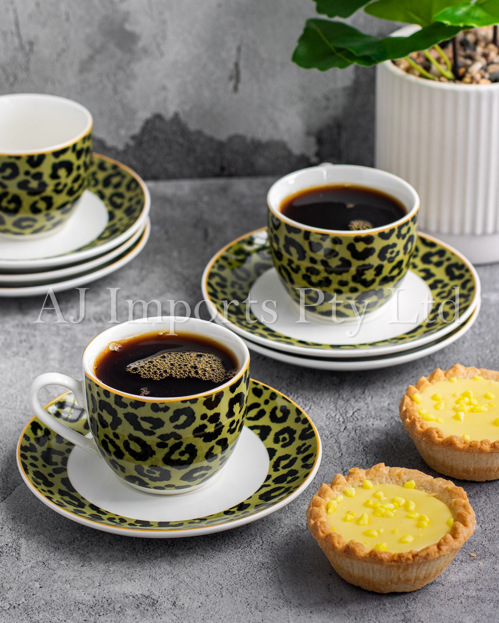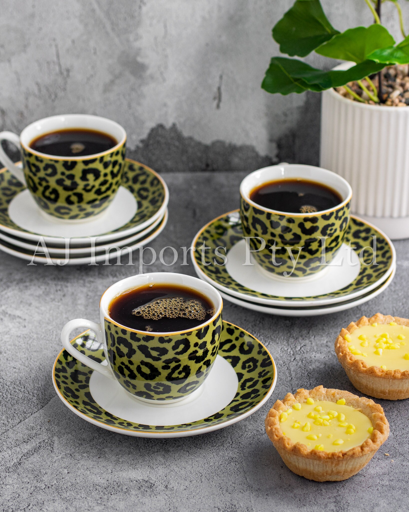Each espresso cup features a olive green and black leopard print design, adding a touch of exotic flair to your table. The accompanying saucers are elegantly crafted to complement the cups, providing a perfect resting place for your espresso moments.