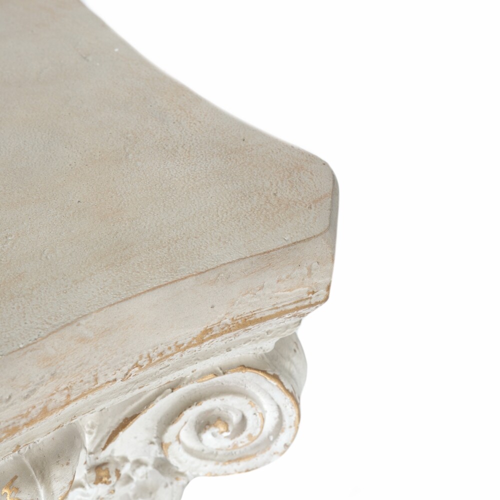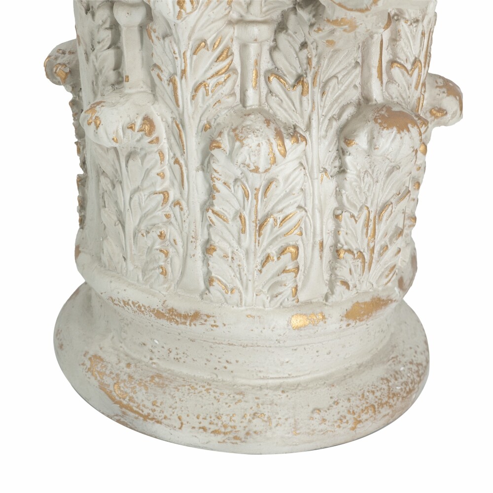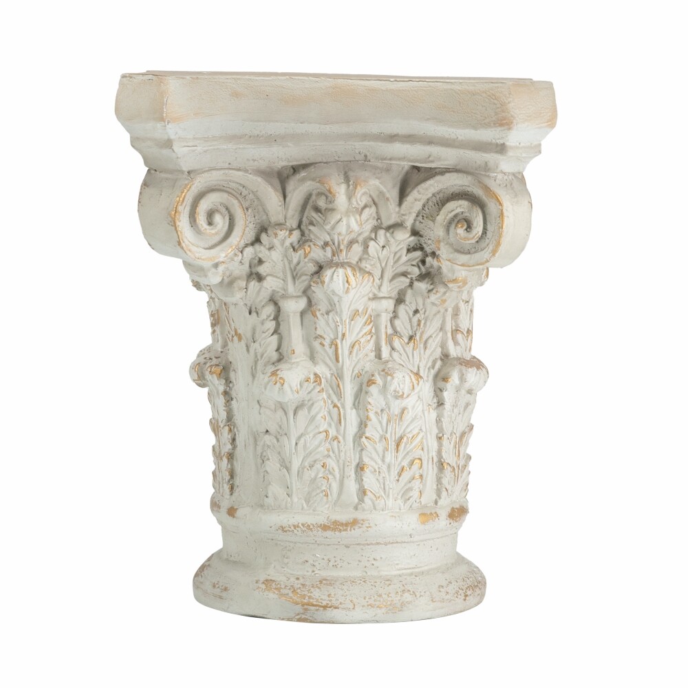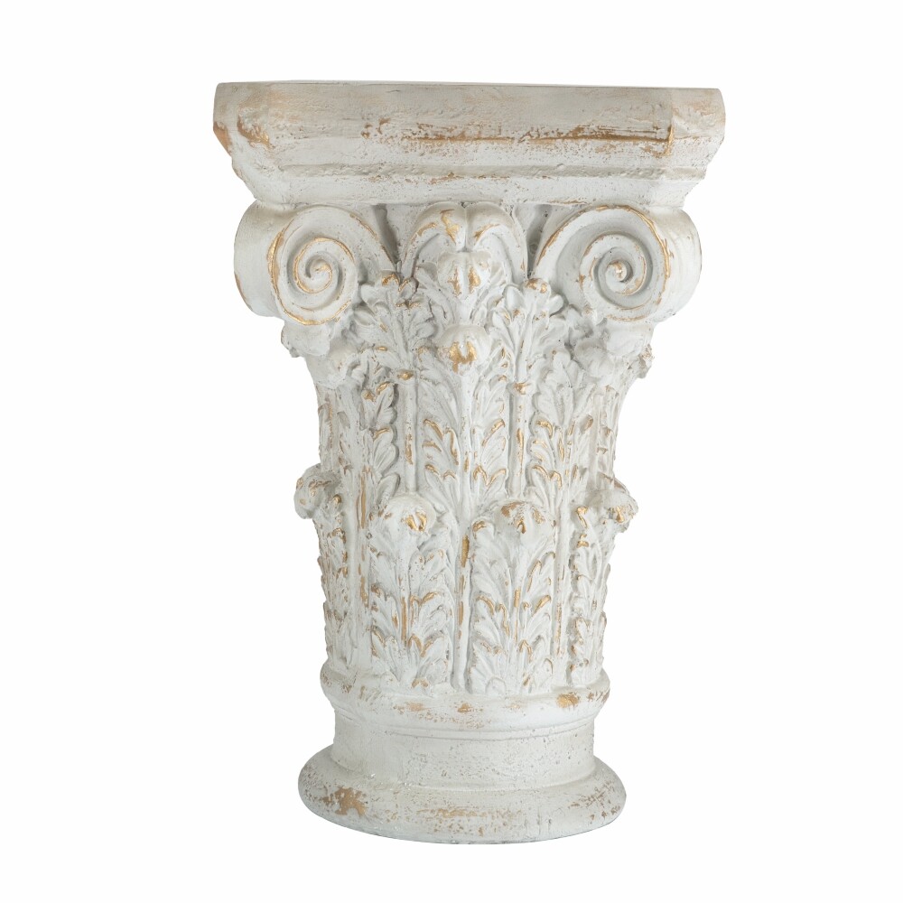 Bring timeless architectural charm into your space with this Decorative Corinthian Pedestal. Modelled after ancient Roman columns, it features finely sculpted acanthus leaves, fluted details, and elegant scrollwork. The antique white finish with gold accents gives it the look of aged stone—perfect for elevating sculptures, floral arrangements, or standing beautifully on its own.