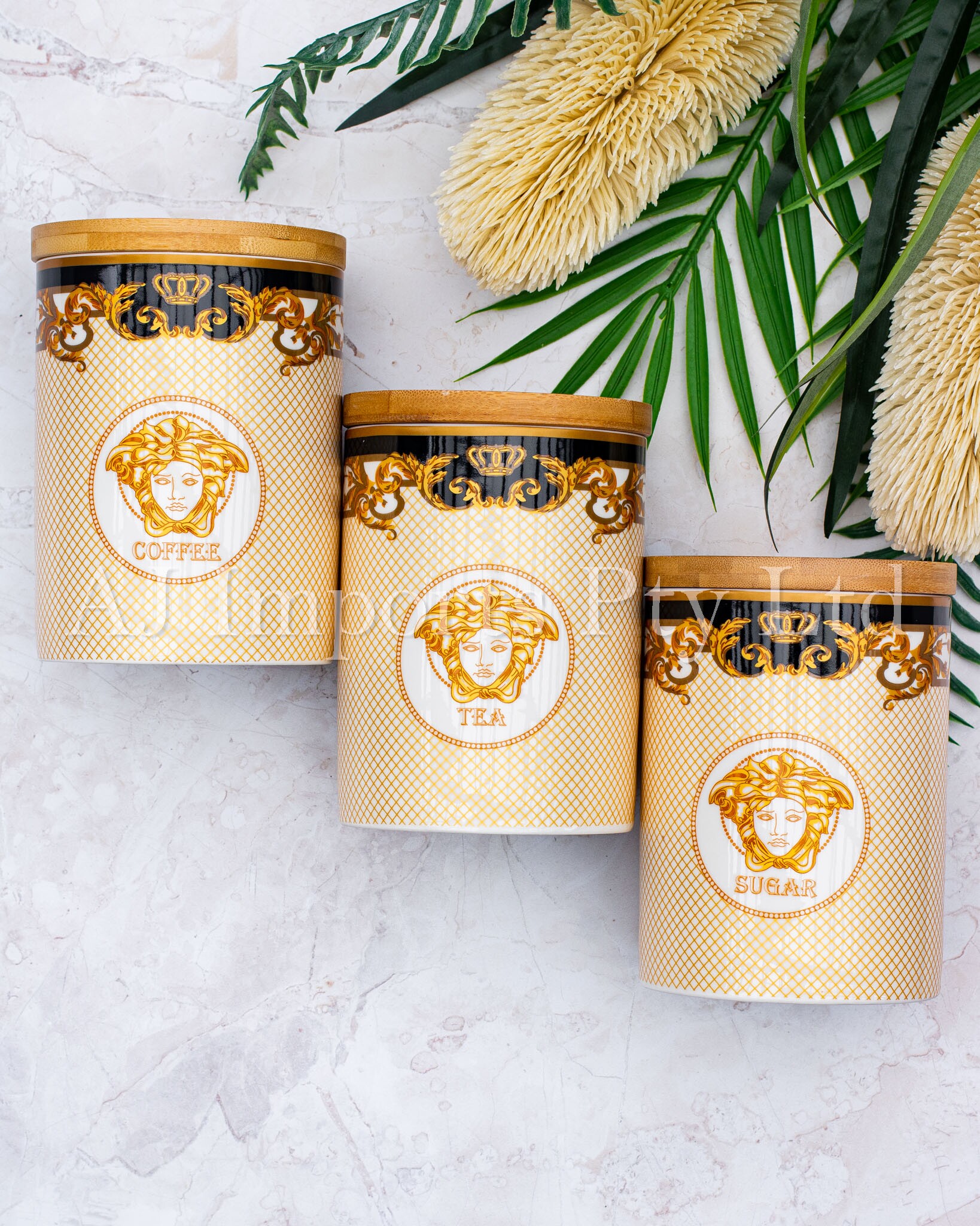 The House of Florence Medusa Luxurious and Stunning Set of Three Canister Set for Sugar, Tea and Coffee.