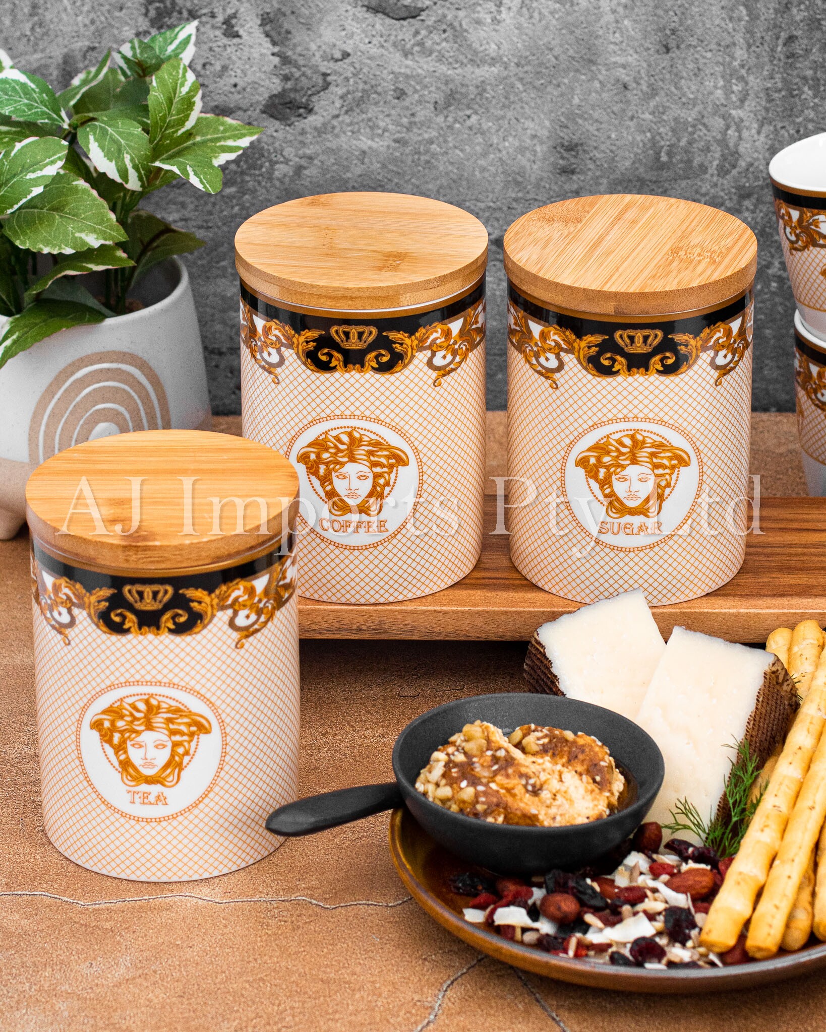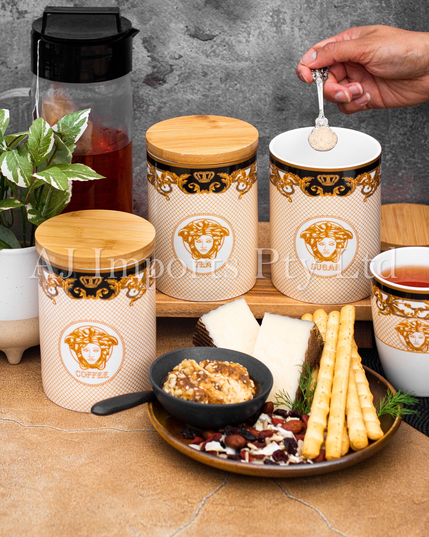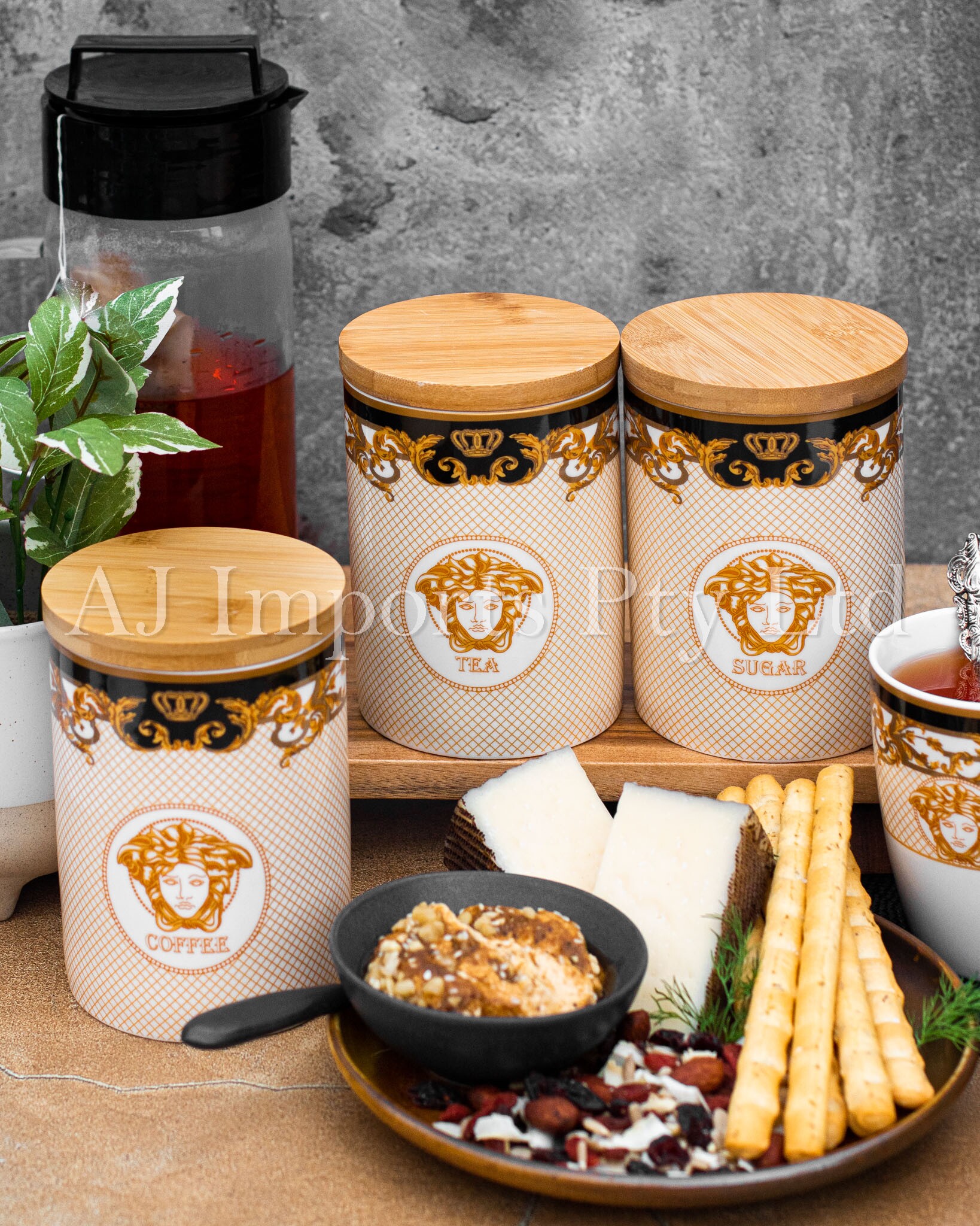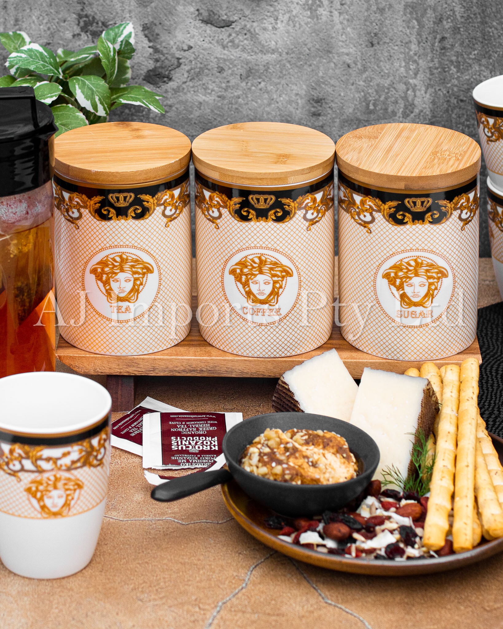 Elevate your kitchen with the Medusa Luxe Canister Set. Crafted with decorative new bone China topped with eco-friendly bamboo lids, this trio adds a touch of sophistication to your countertop. Perfect for storing sugar, tea, and coffee, each canister keeps contents fresh and easily accessible. The Medusa Luxe set seamlessly blends style with functionality, enhancing both your cooking space and your daily routine.