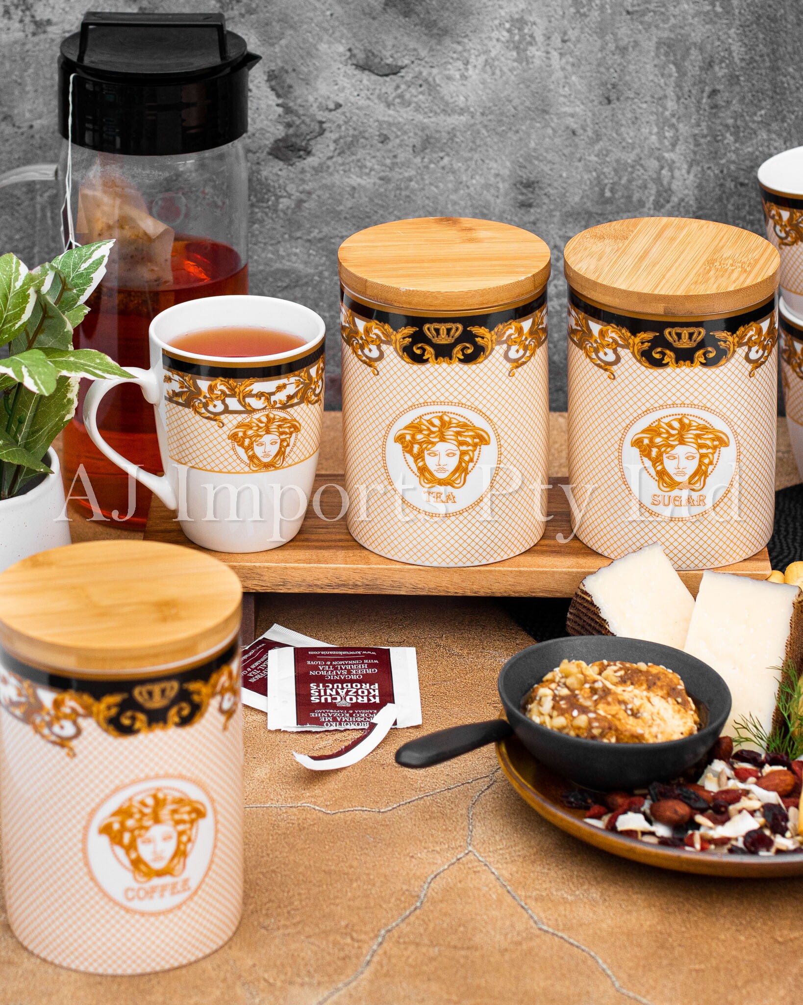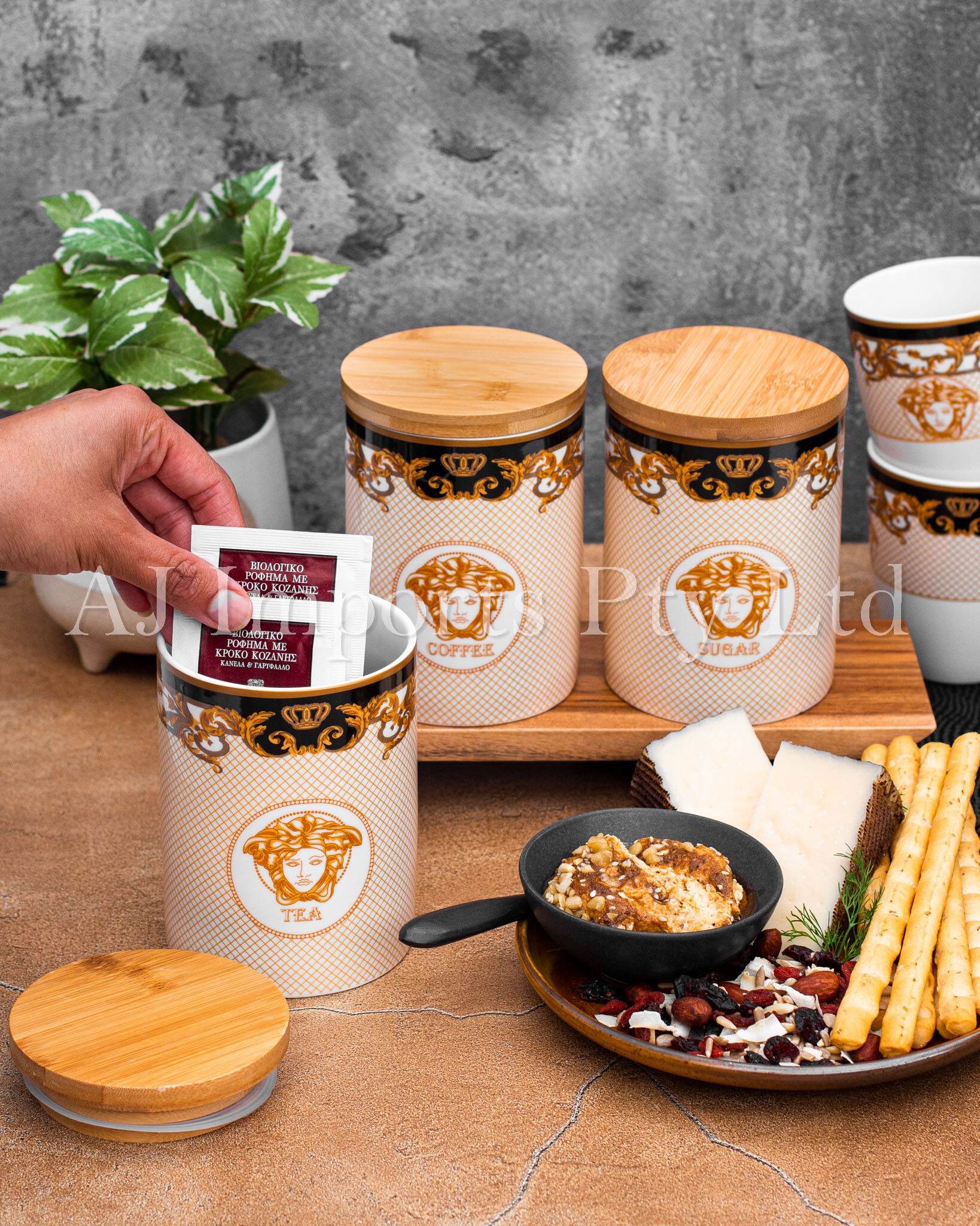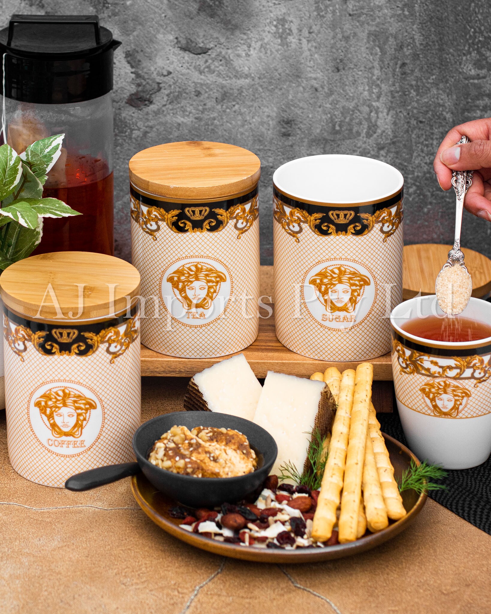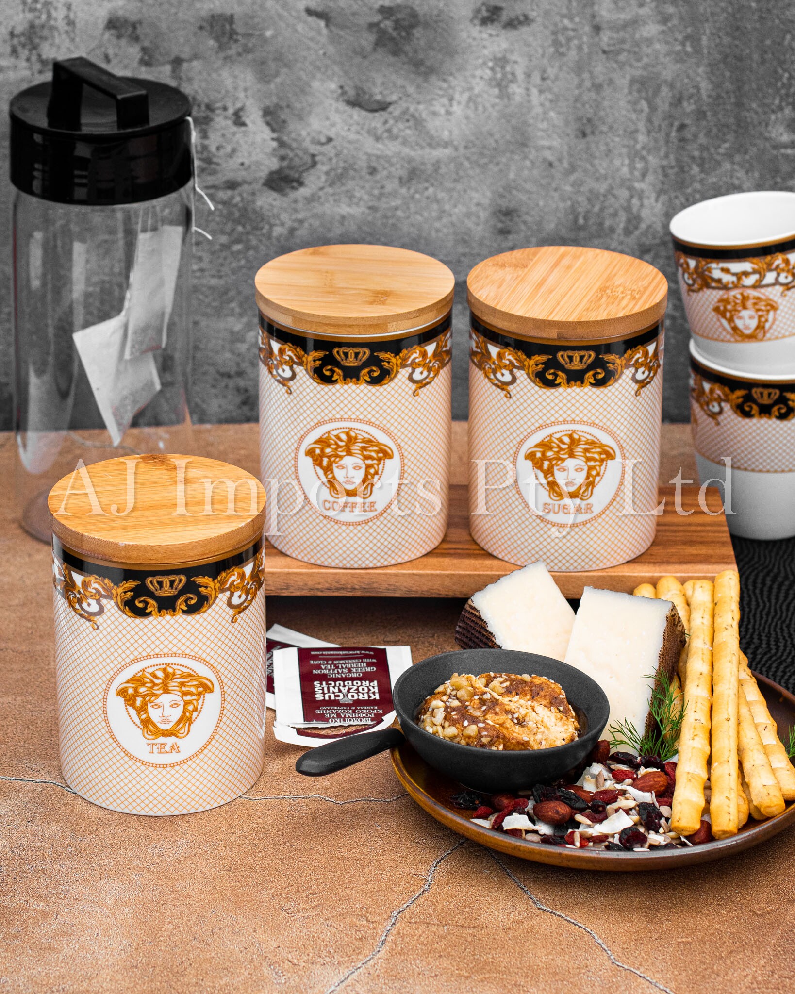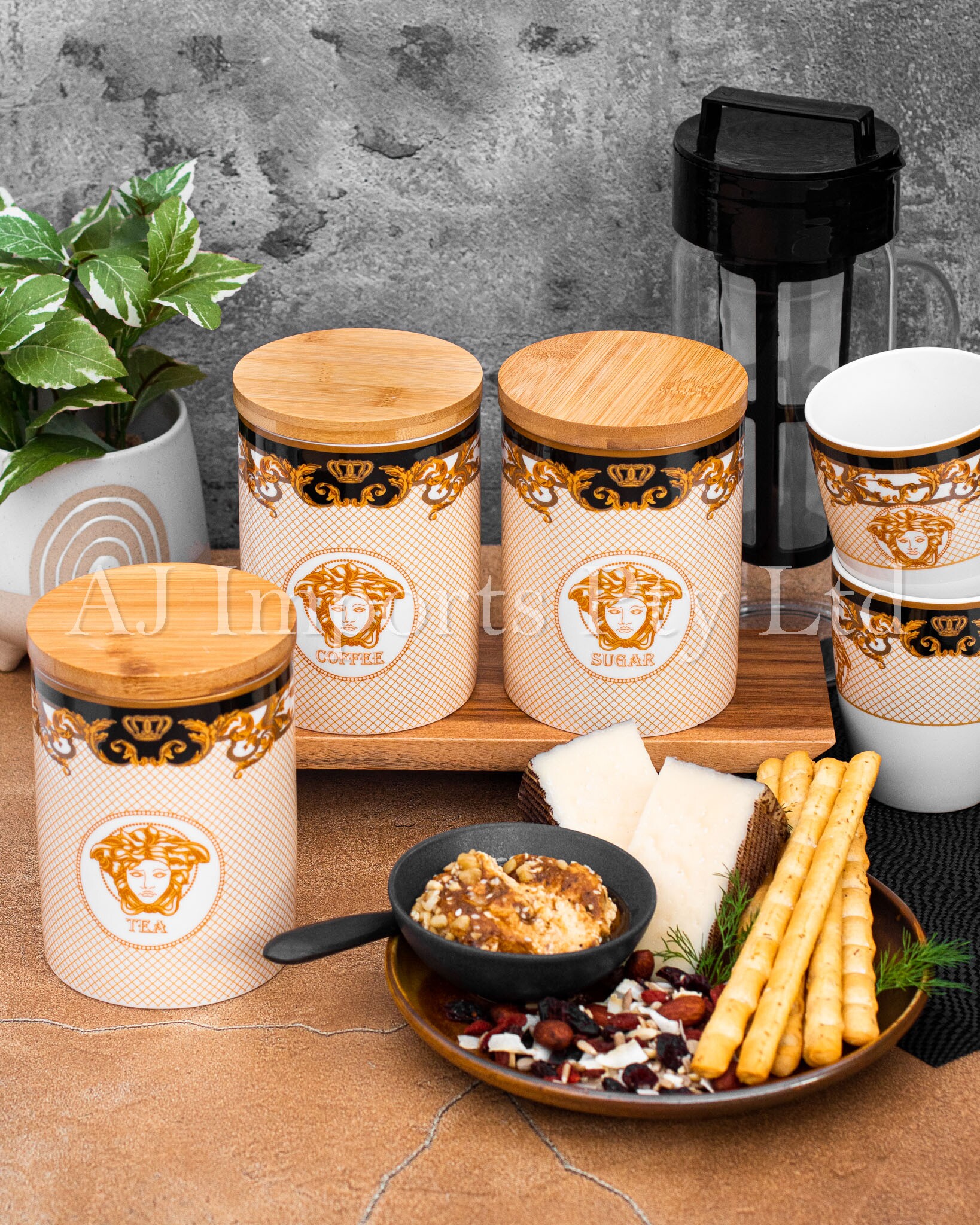 Elevate your kitchen with the Medusa Luxe Canister Set. Crafted with decorative new bone China topped with eco-friendly bamboo lids, this trio adds a touch of sophistication to your countertop. Perfect for storing sugar, tea, and coffee, each canister keeps contents fresh and easily accessible. The Medusa Luxe set seamlessly blends style with functionality, enhancing both your cooking space and your daily routine.