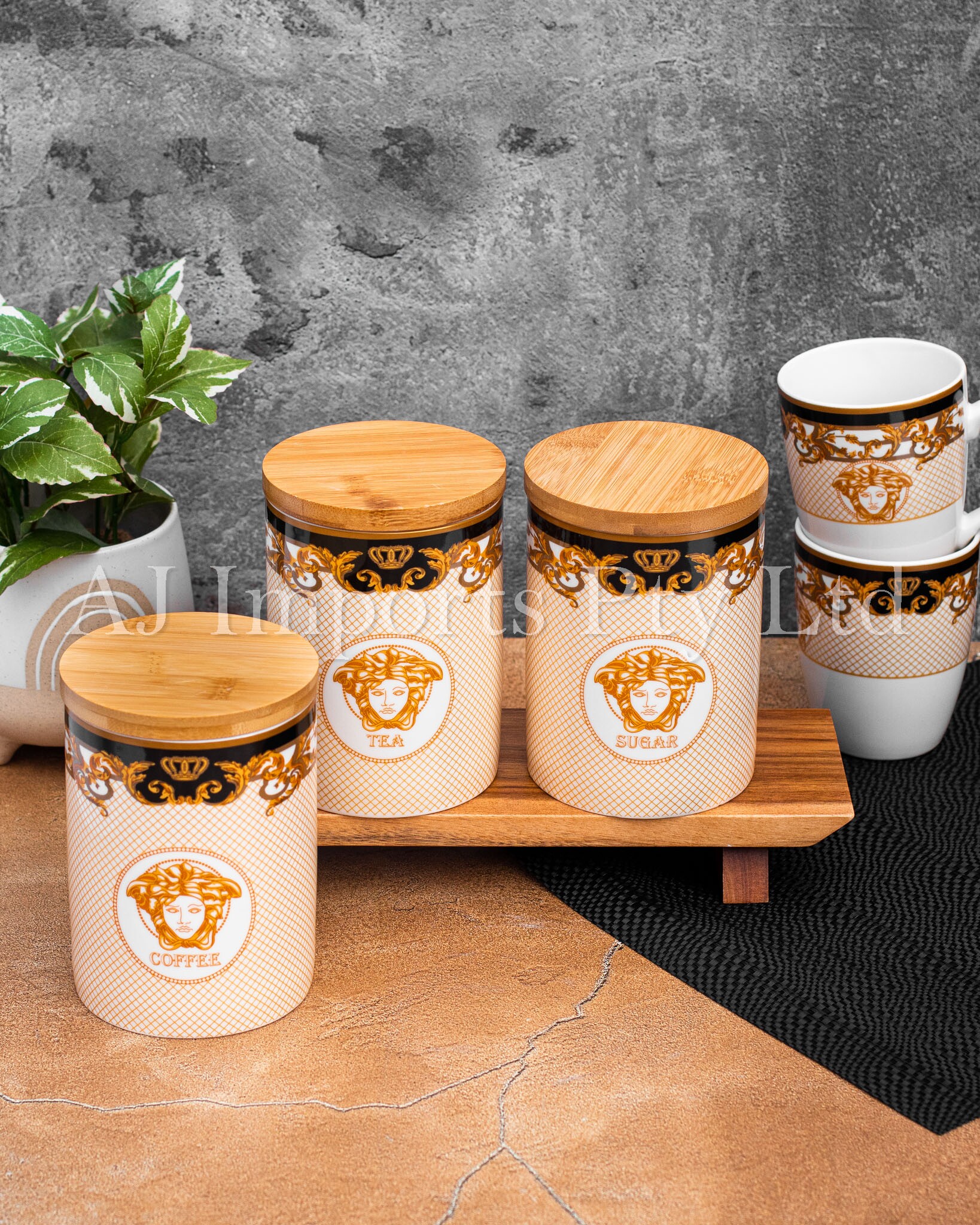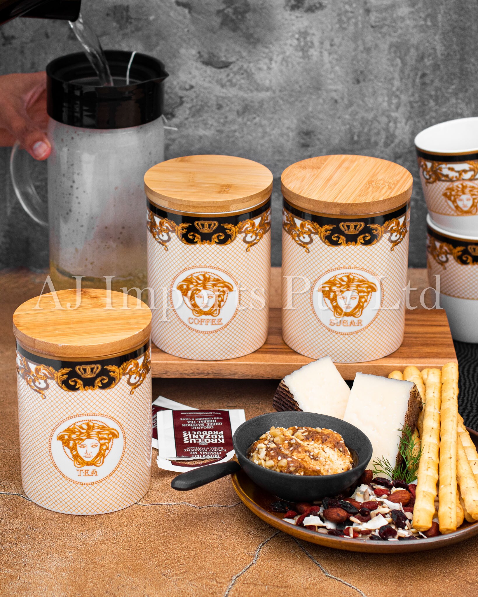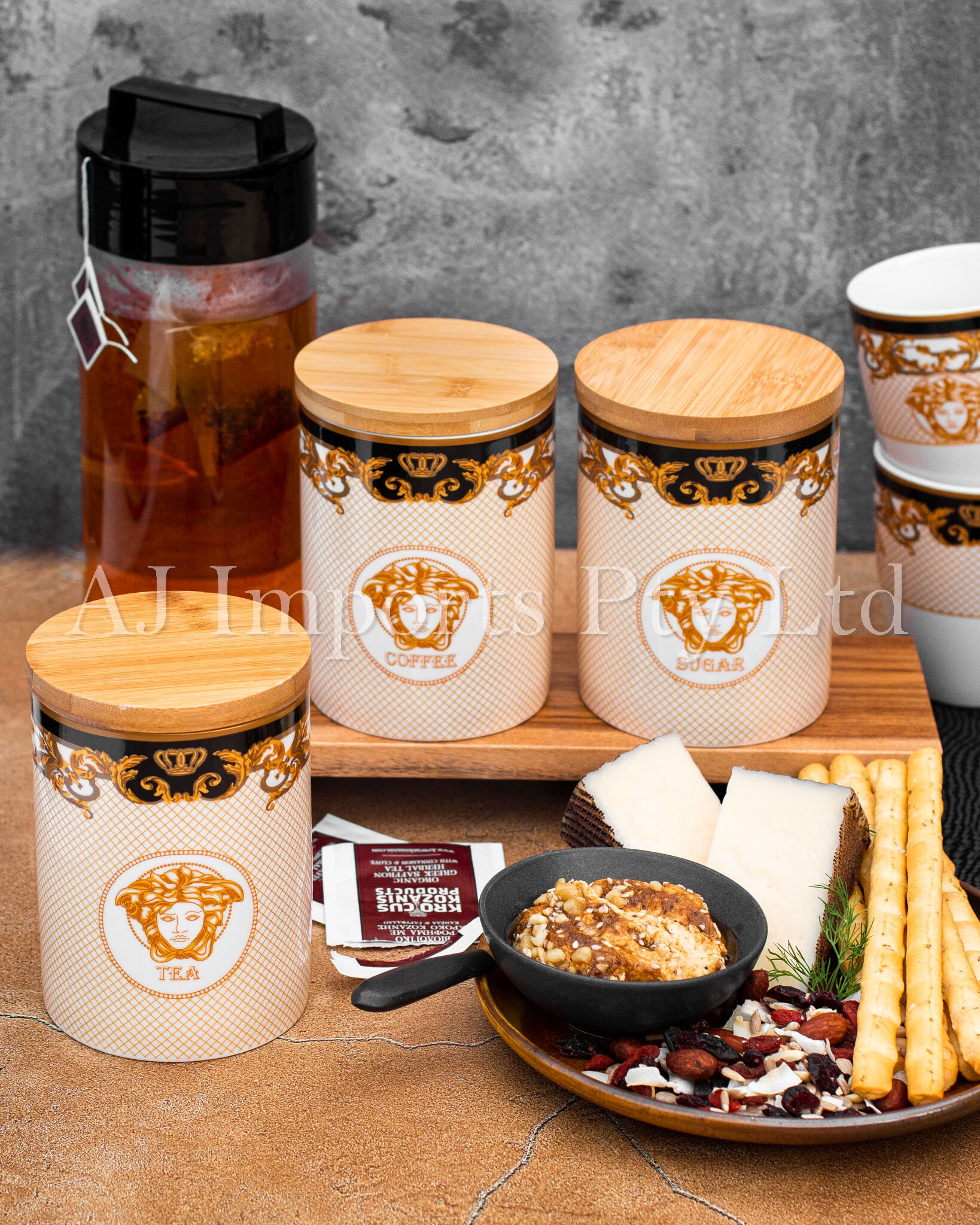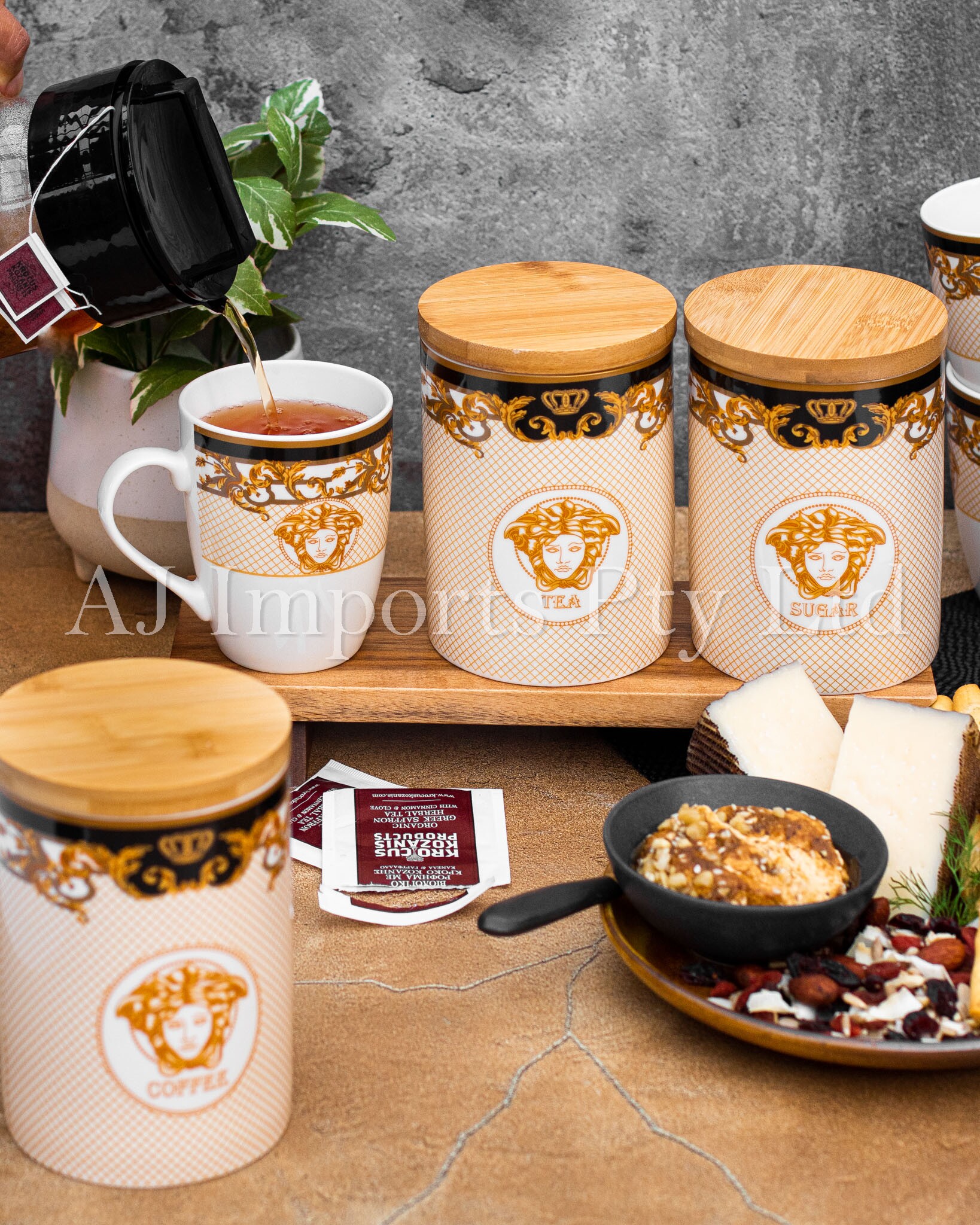 Elevate your kitchen with the Medusa Luxe Canister Set. Crafted with decorative new bone China topped with eco-friendly bamboo lids, this trio adds a touch of sophistication to your countertop. Perfect for storing sugar, tea, and coffee, each canister keeps contents fresh and easily accessible. The Medusa Luxe set seamlessly blends style with functionality, enhancing both your cooking space and your daily routine.