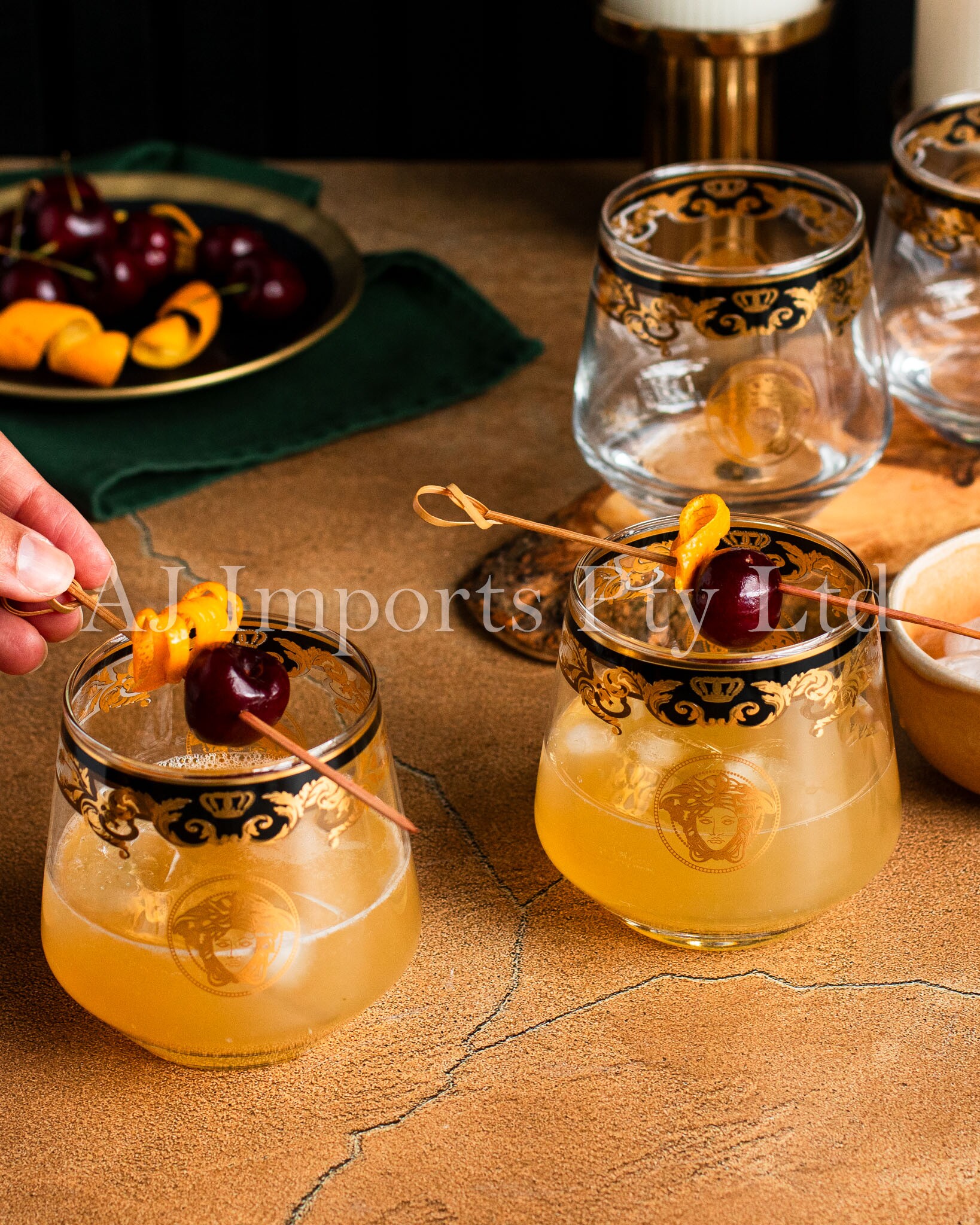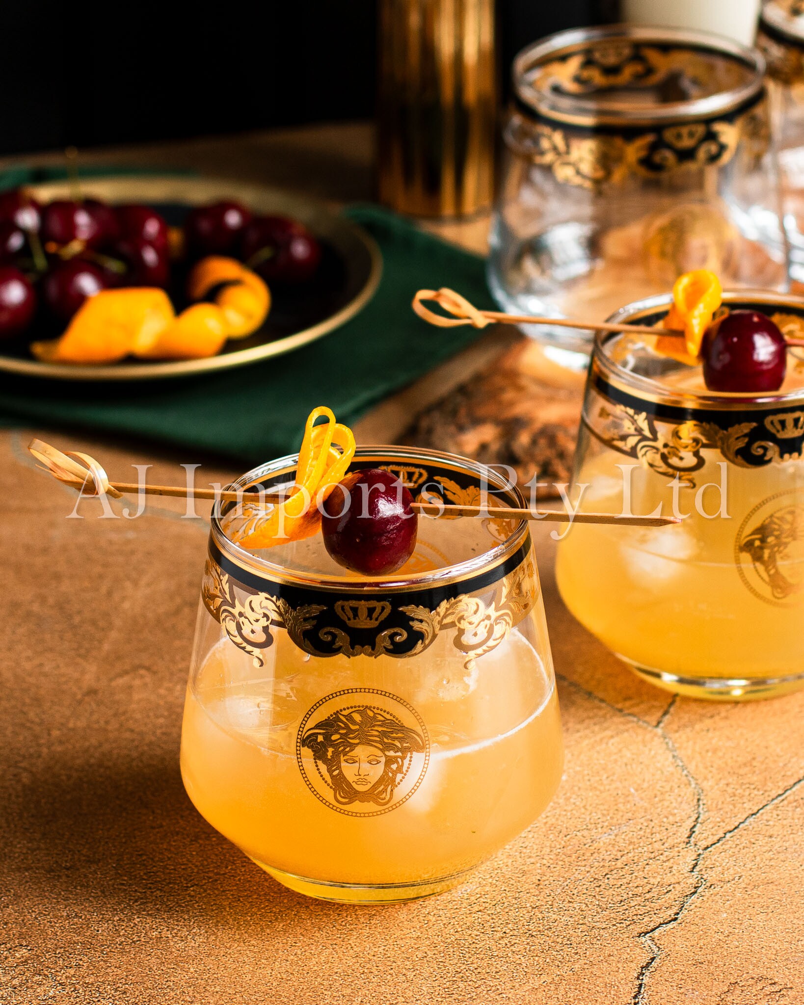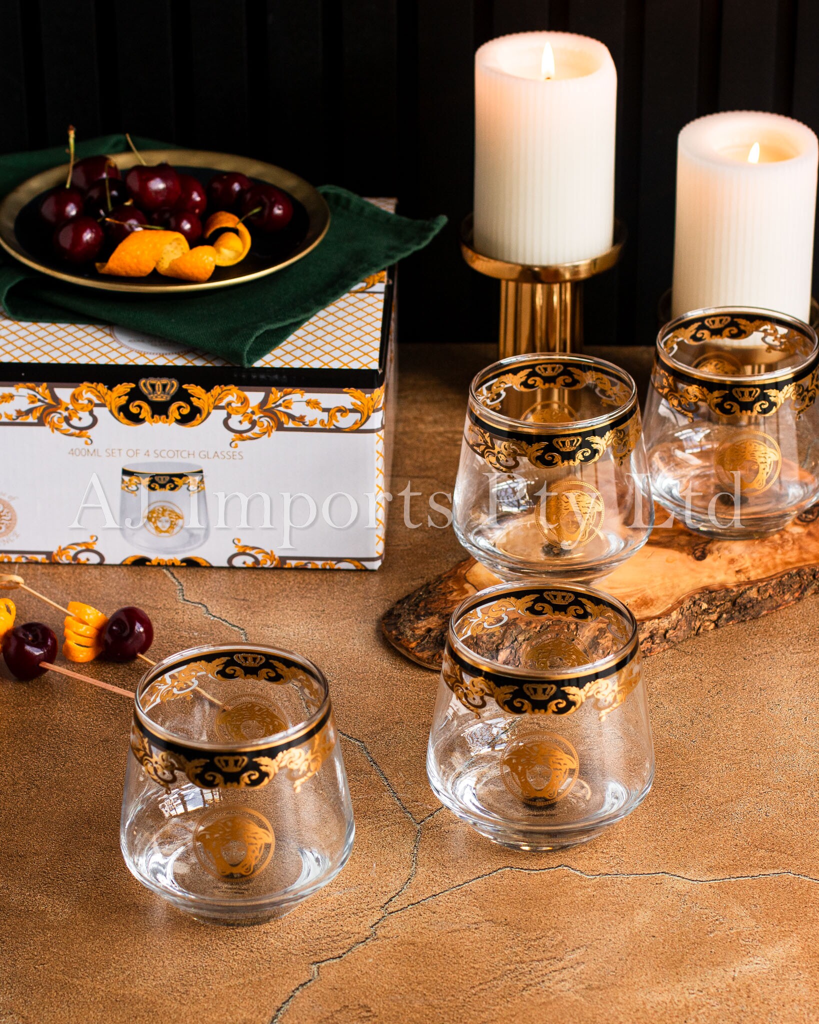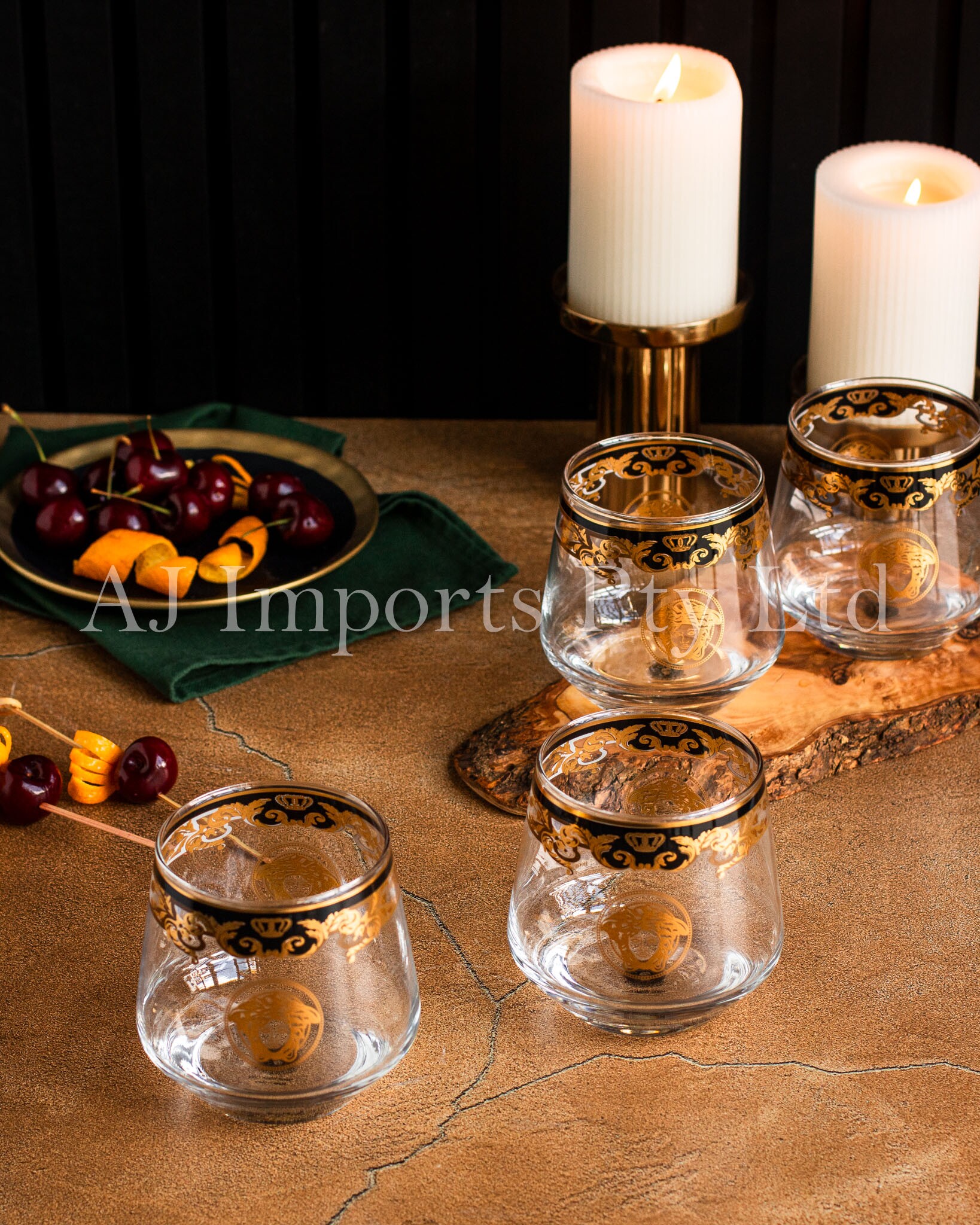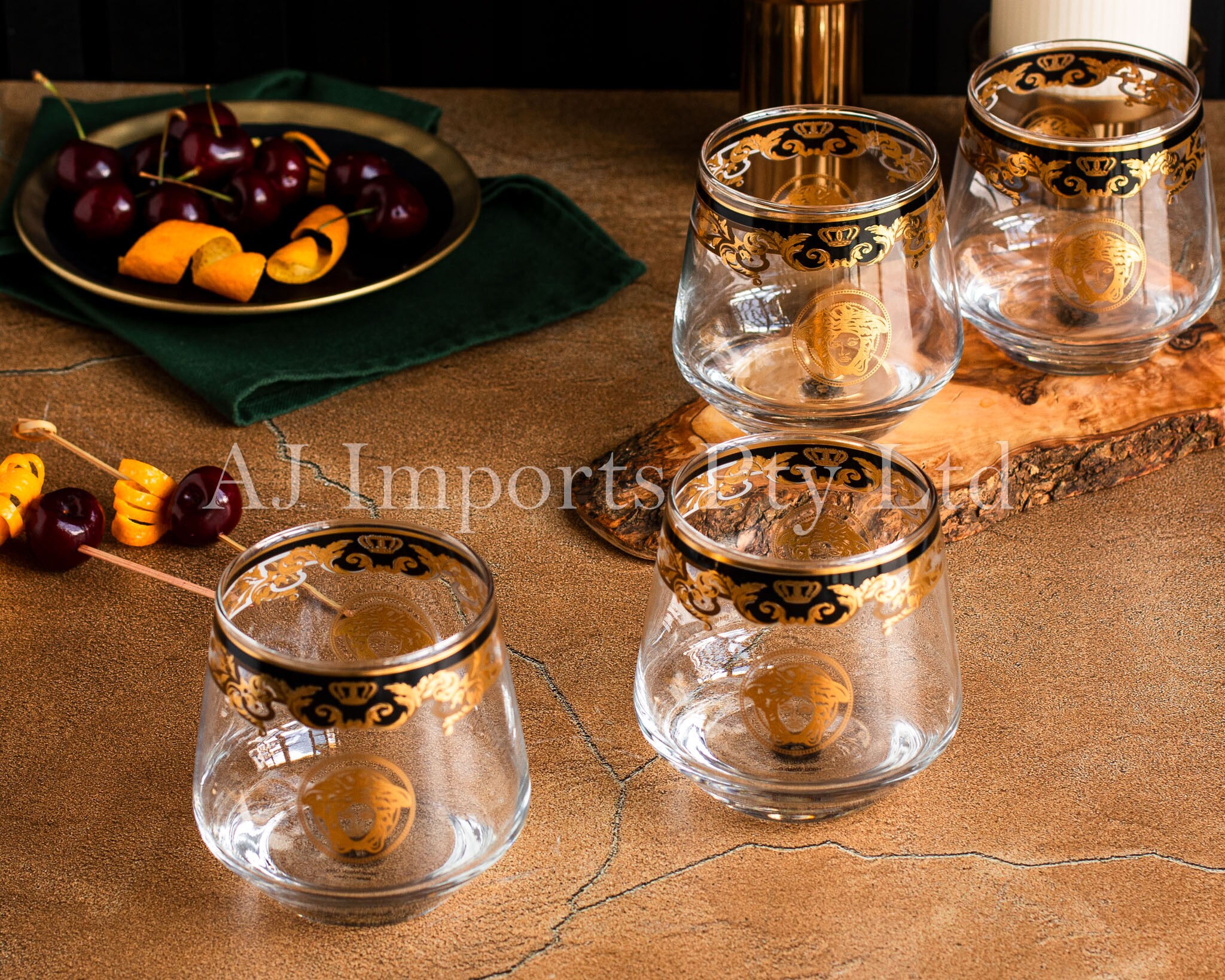 Elevate your Scotch-drinking experience with our exquisite Medusa-inspired glasses, a true testament to sophistication and luxury. These glasses are not just drinkware; they are a masterpiece, seamlessly design with opulent gold and black accents.