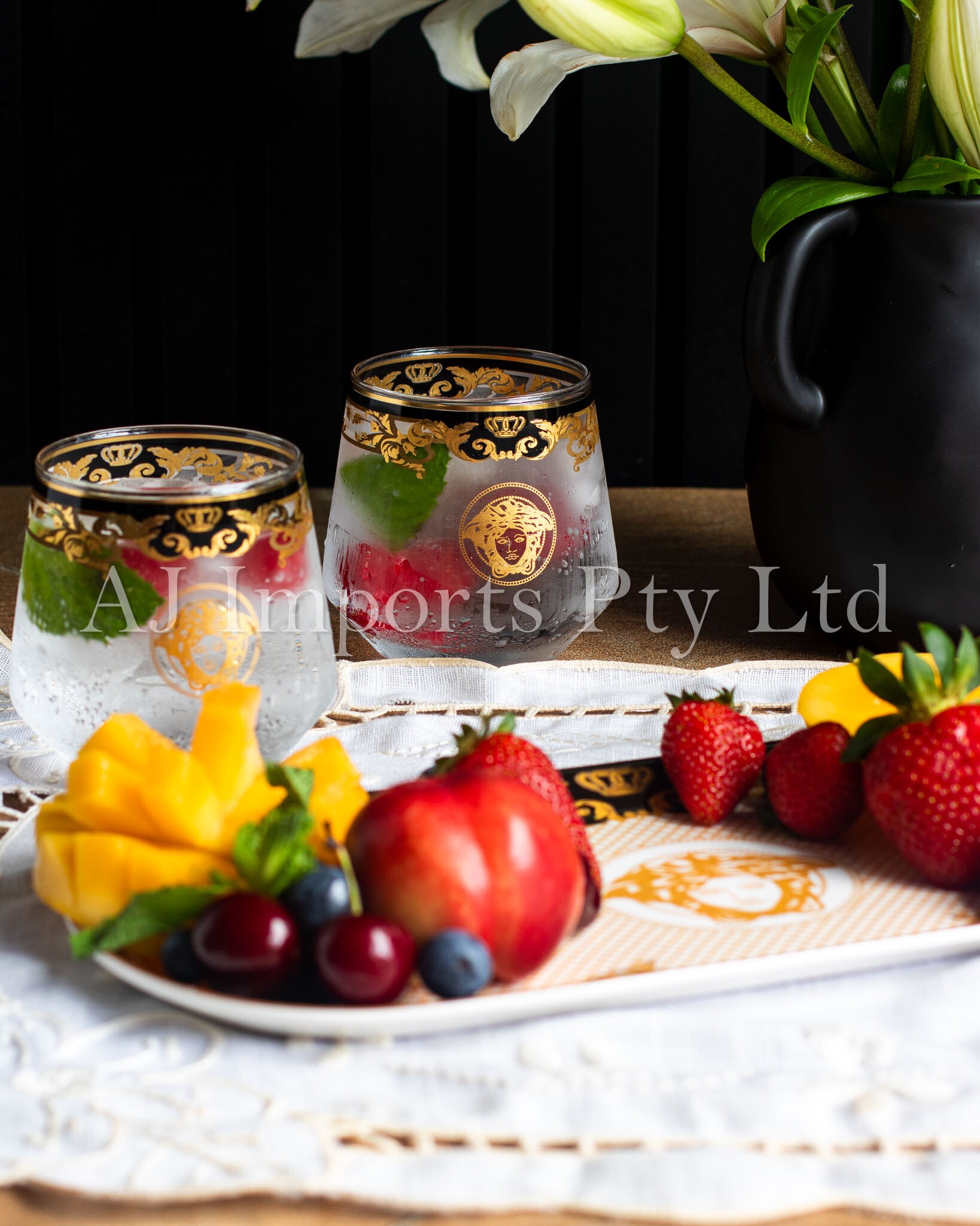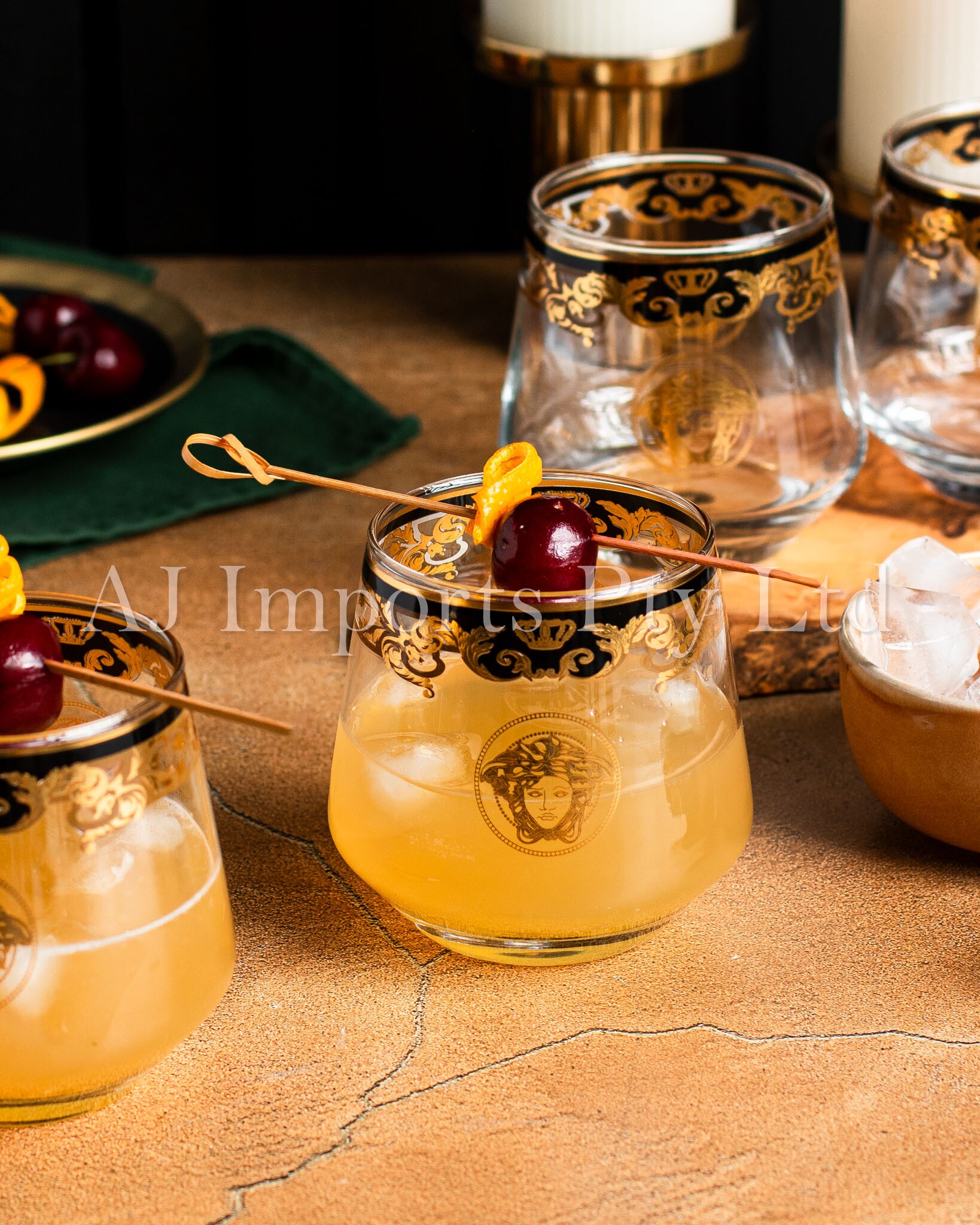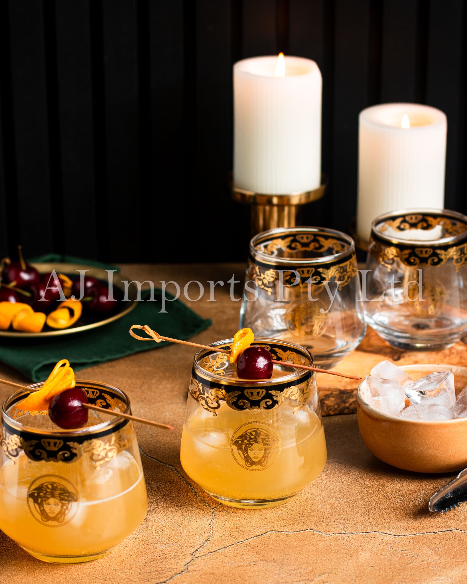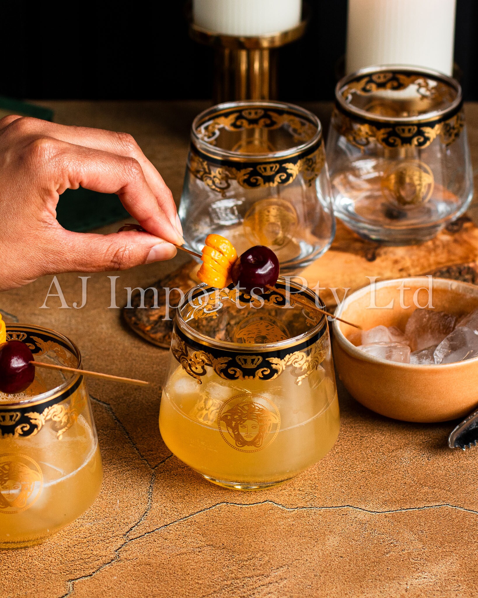 Elevate your Scotch-drinking experience with our exquisite Medusa-inspired glasses, a true testament to sophistication and luxury. These glasses are not just drinkware; they are a masterpiece, seamlessly design with opulent gold and black accents.