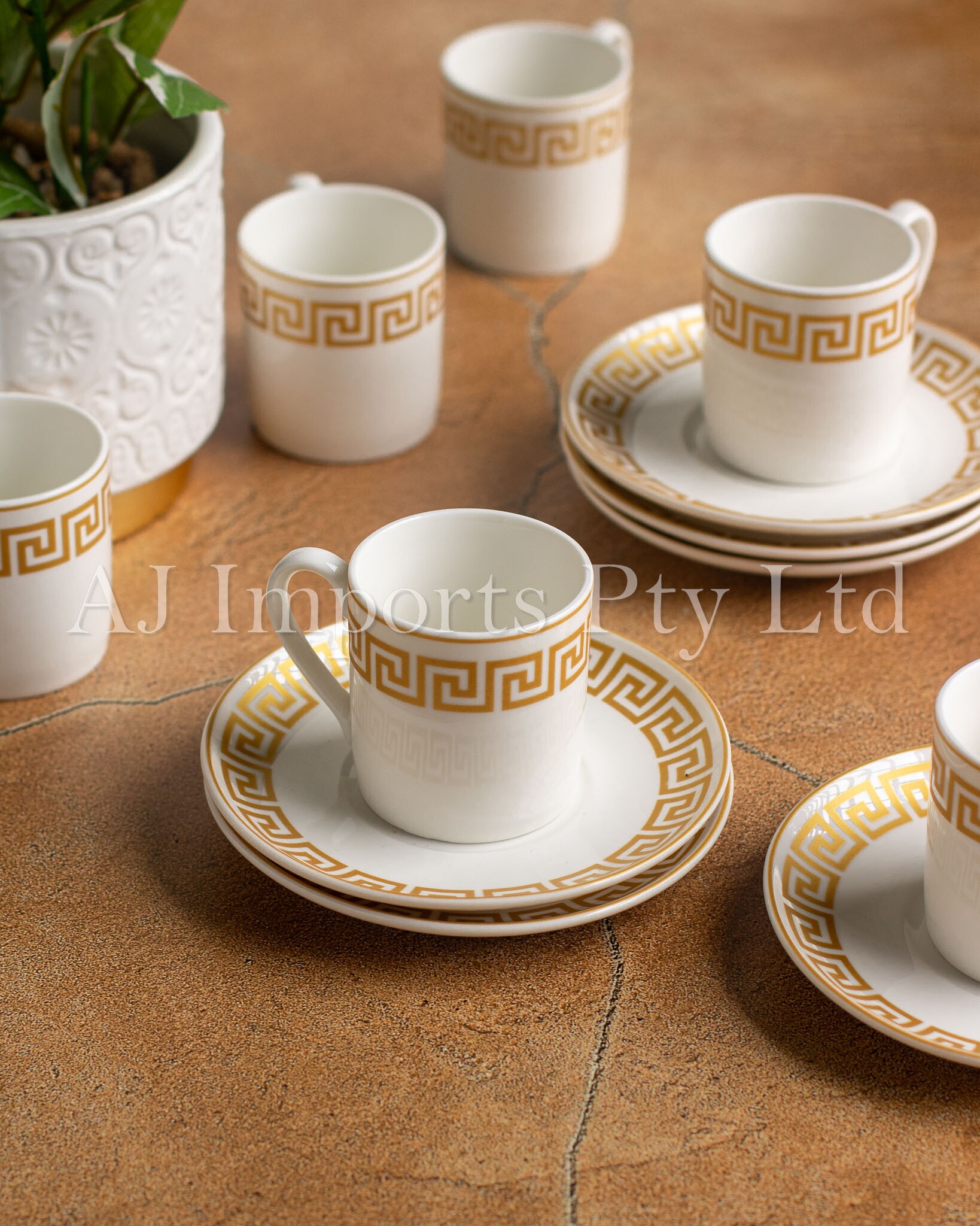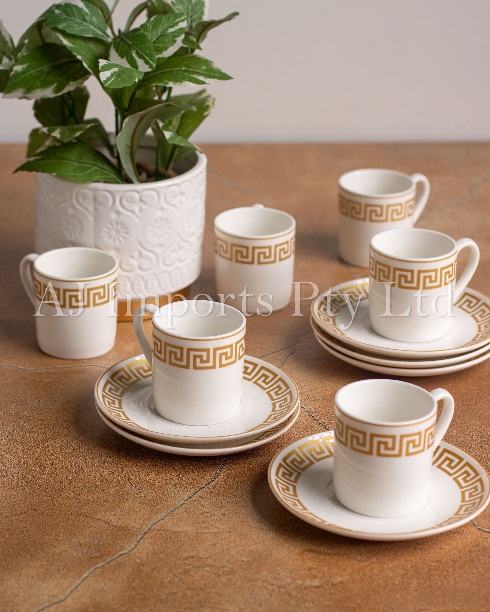 Bring home the charm of classical Greek elegance with the Olympia Gold Espresso Set. Featuring a stunning gold Greek key pattern around the rim, this luxurious set is the perfect combination of timeless design and everyday functionality. Whether you’re serving guests or enjoying a quiet coffee moment, these cups and saucers deliver beauty and sophistication with every sip.