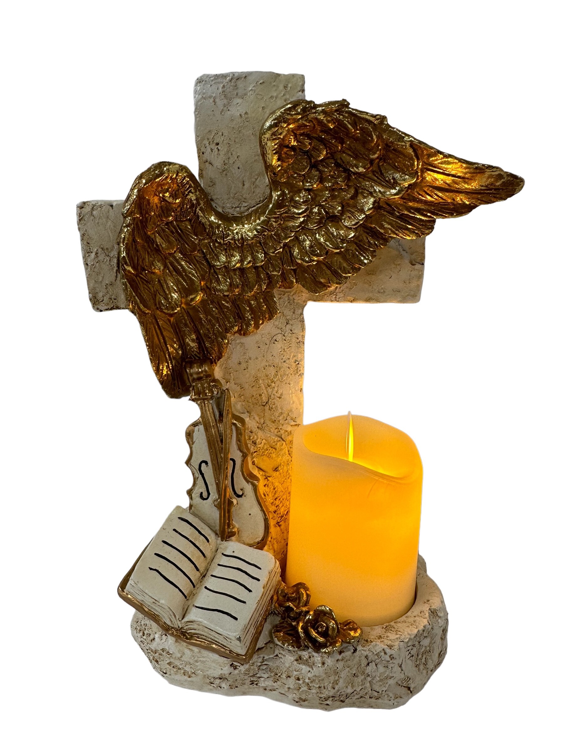 The House of Florence- Religious Keepsake Cross with Angel Wings, Book & Violin with Light Up Candle.