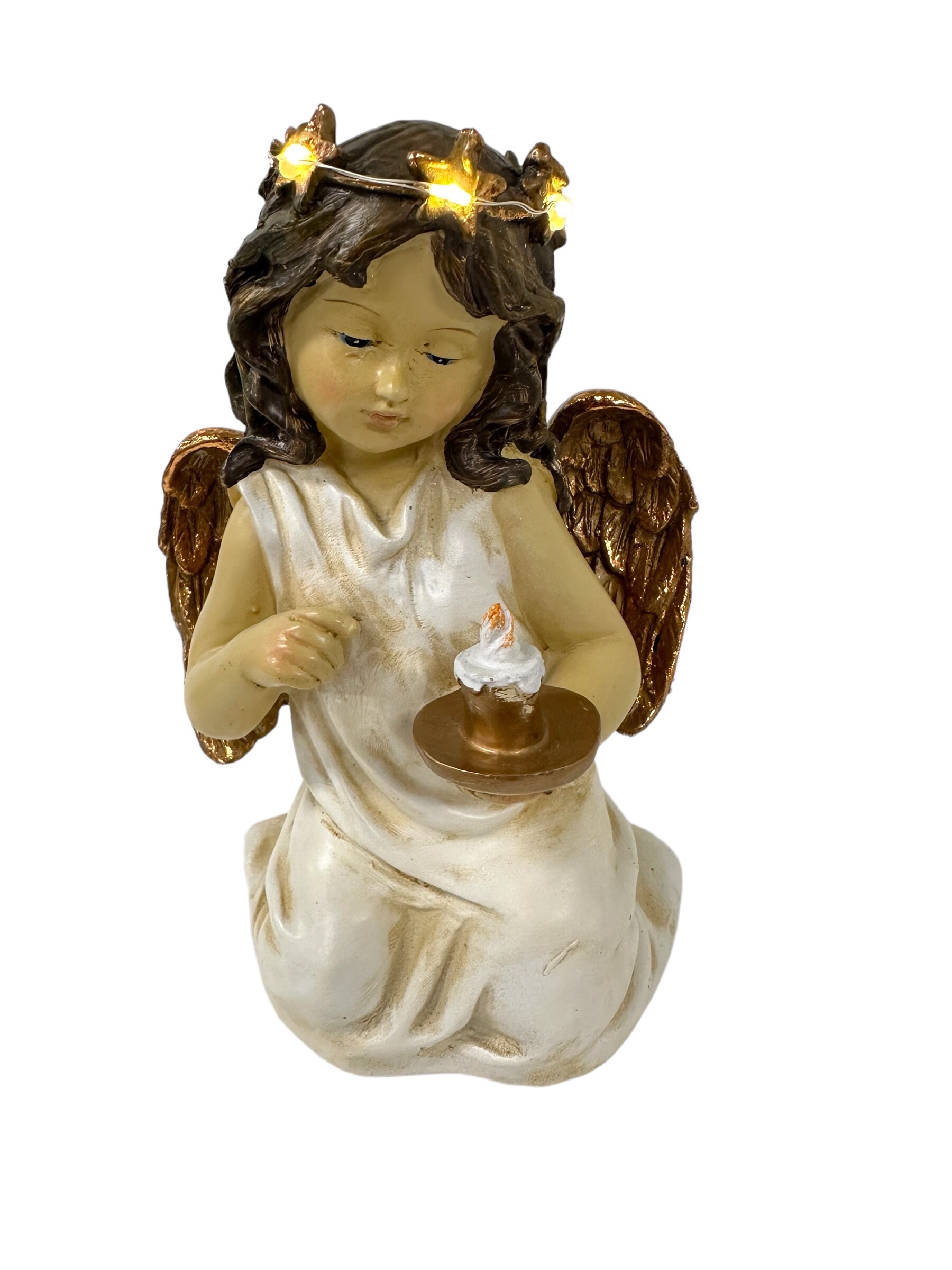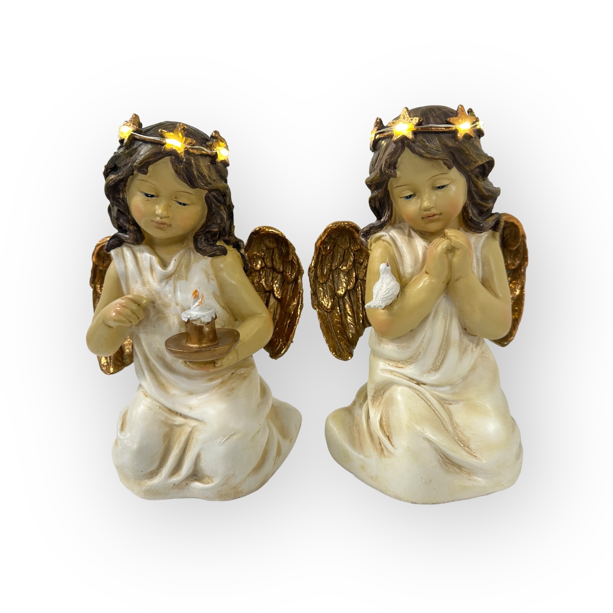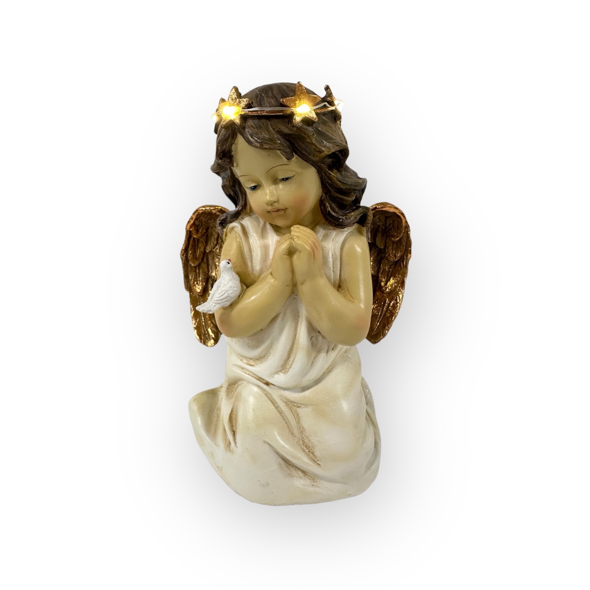 The House of Florence- Religious Keepsake Decoration Kneeling Angel Holding Candlelight & Holding Bird with Light Up Halo