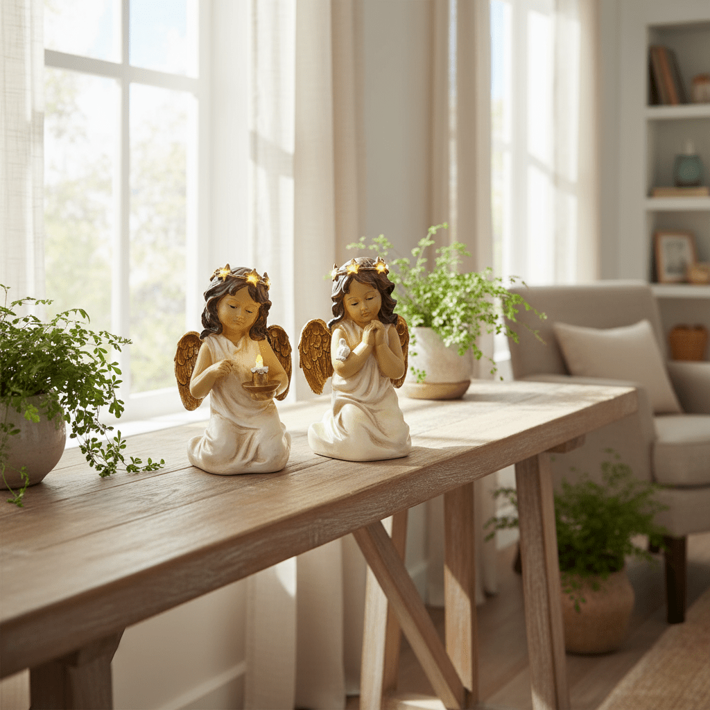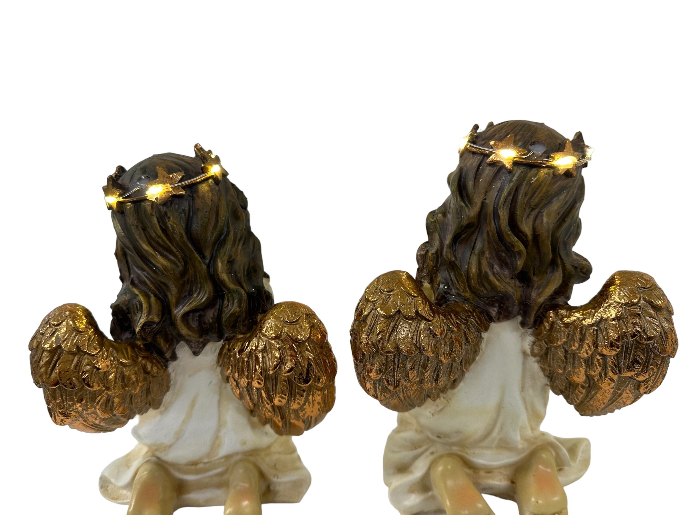 Introducing our exquisite angel figurines, each with elegant rose gold wings and a radiant light-up halo. One angel tenderly holds a delicate bird, symbolizing peace and harmony, while the other cradles a glowing candle, representing hope and light. Crafted with intricate details, these heavenly figures add a touch of divine beauty to any space. Perfect for gifting or personal decor, they come assorted in one carton, ready to grace your home with their serene presence. Illuminate your surroundings with these charming angels, embodying grace and tranquility.