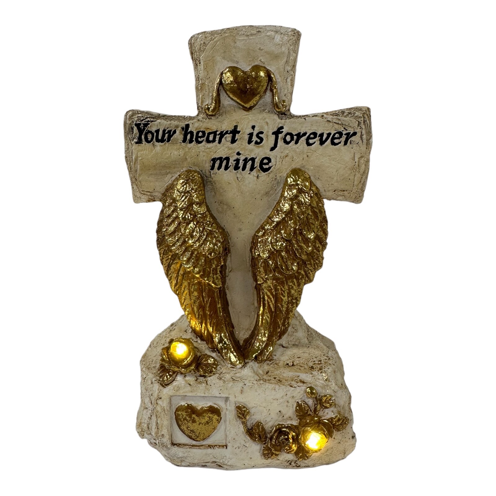 The House of Florence Your Heart is Forever Mine Light Up Cross with Heart and Angel Wings.