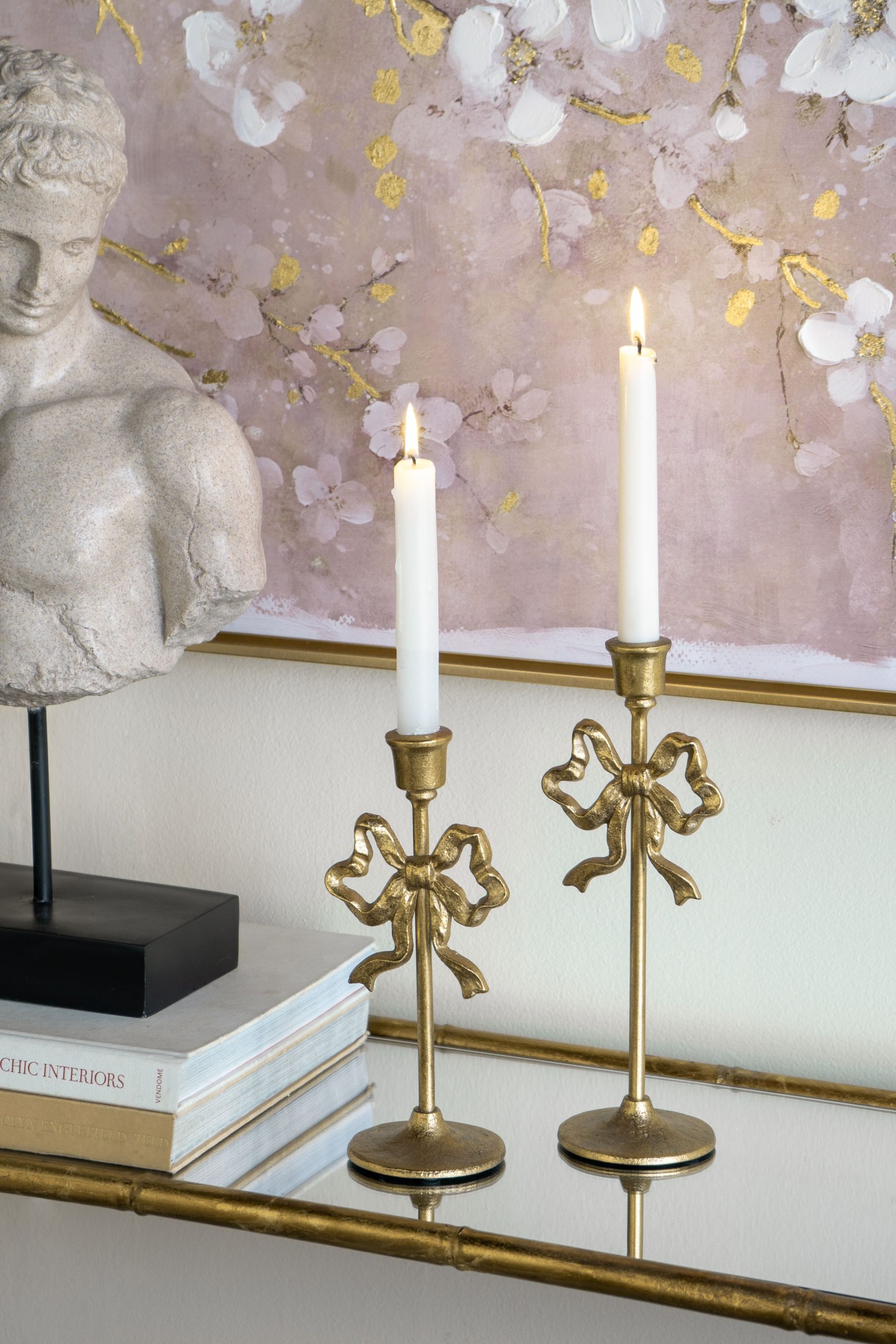 Inspired by the refined beauty of vintage European design, each chic candle holder with sweet bow detail, features a rich gold finish, a sturdy pedestal base, and a slender stem adorned with a delightful bow accent. Whether displayed as a centrepiece duo or individually, they will spread a warm, soothing ambience through any room in your home when paired with a single candle.