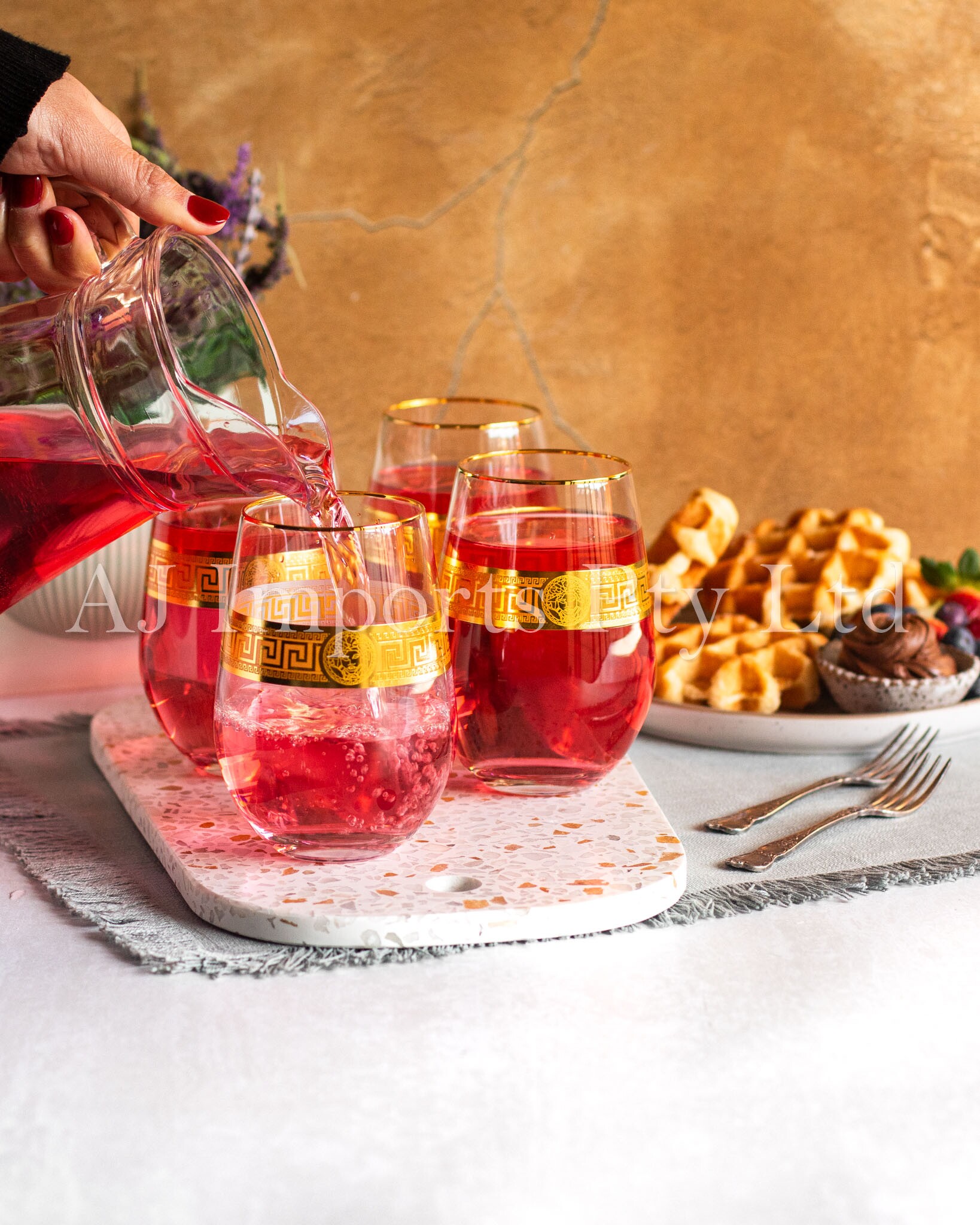 Please note the decal on these glasses have been applied by hand. No piece is perfect and identical. Imperfections and bubbles in the glass may be visible due to their hand-blown nature and variations in colour and pattern may occur