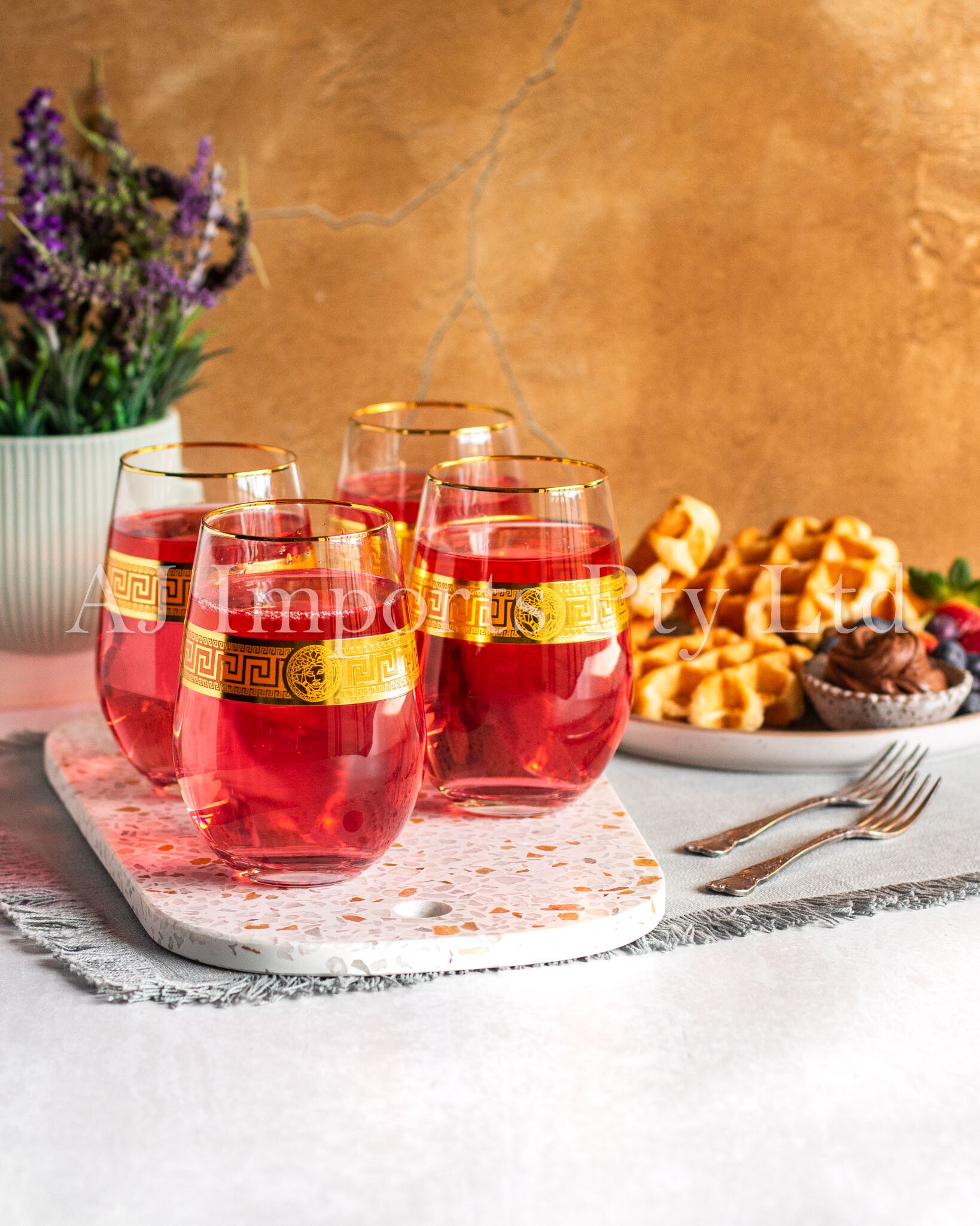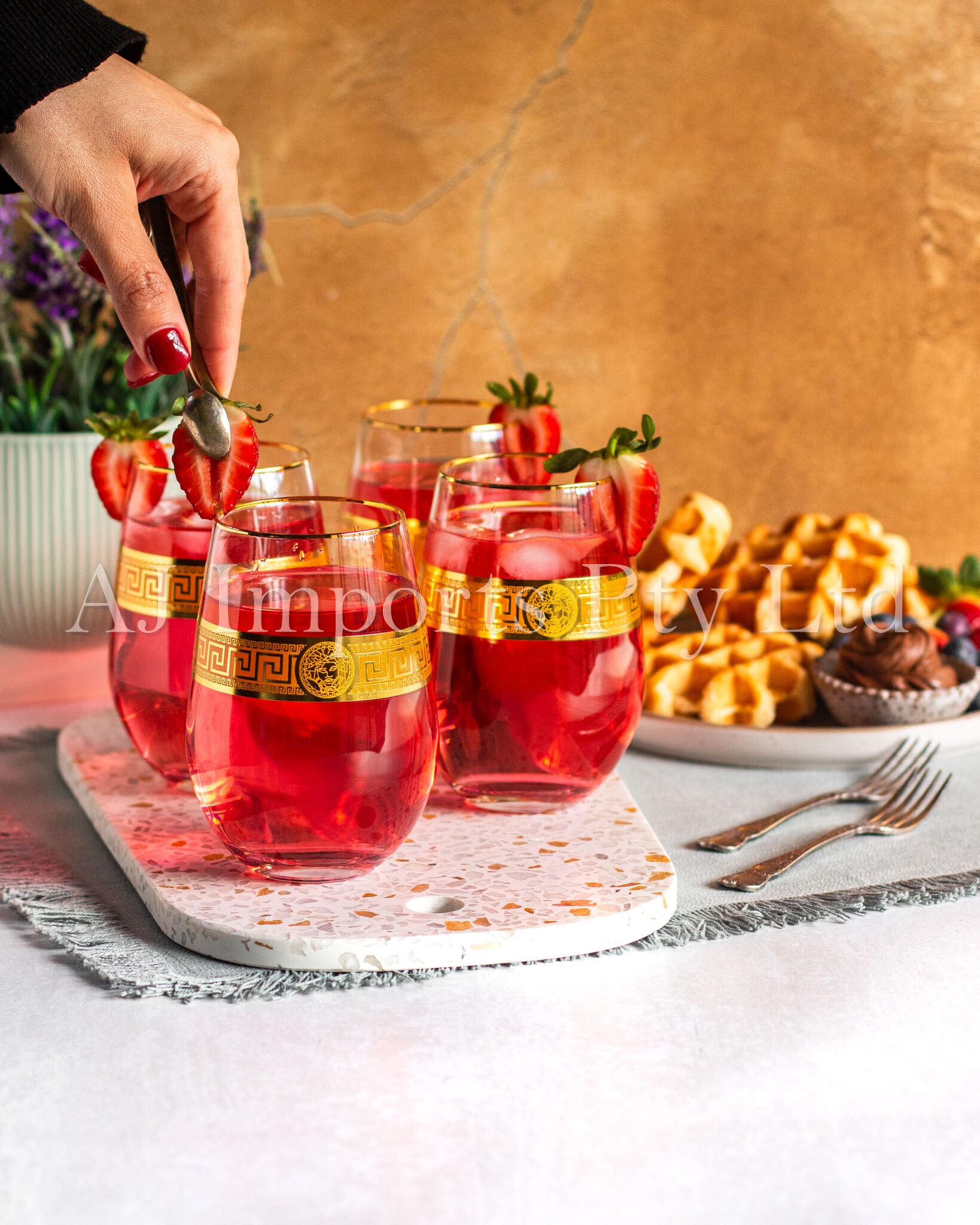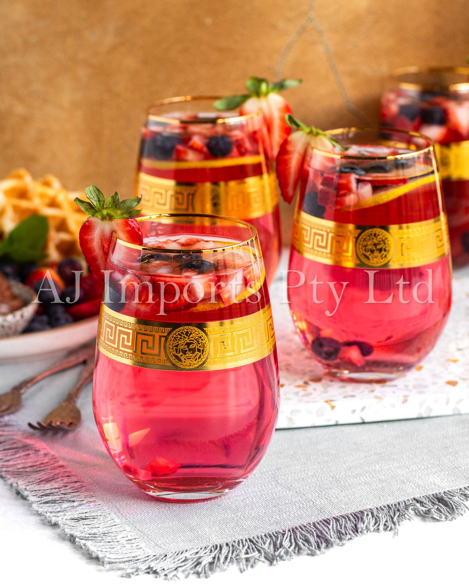 A set of four highball glasses exudes elegance with a silver Medusa Greek key design adorning their sleek exteriors. Crafted with precision, each glass embodies the timeless allure of Greek mythology, intertwining classical motifs with contemporary style. The silver hues gleam under ambient light, casting a mesmerizing aura reminiscent of Medusa’s legendary gaze. These glasses not only elevate any beverage they hold but also serve as exquisite conversation pieces, capturing the imagination with their intricate detailing and opulent charm. Perfect for imbuing gatherings with sophistication or adding a touch of luxury to everyday indulgence.
