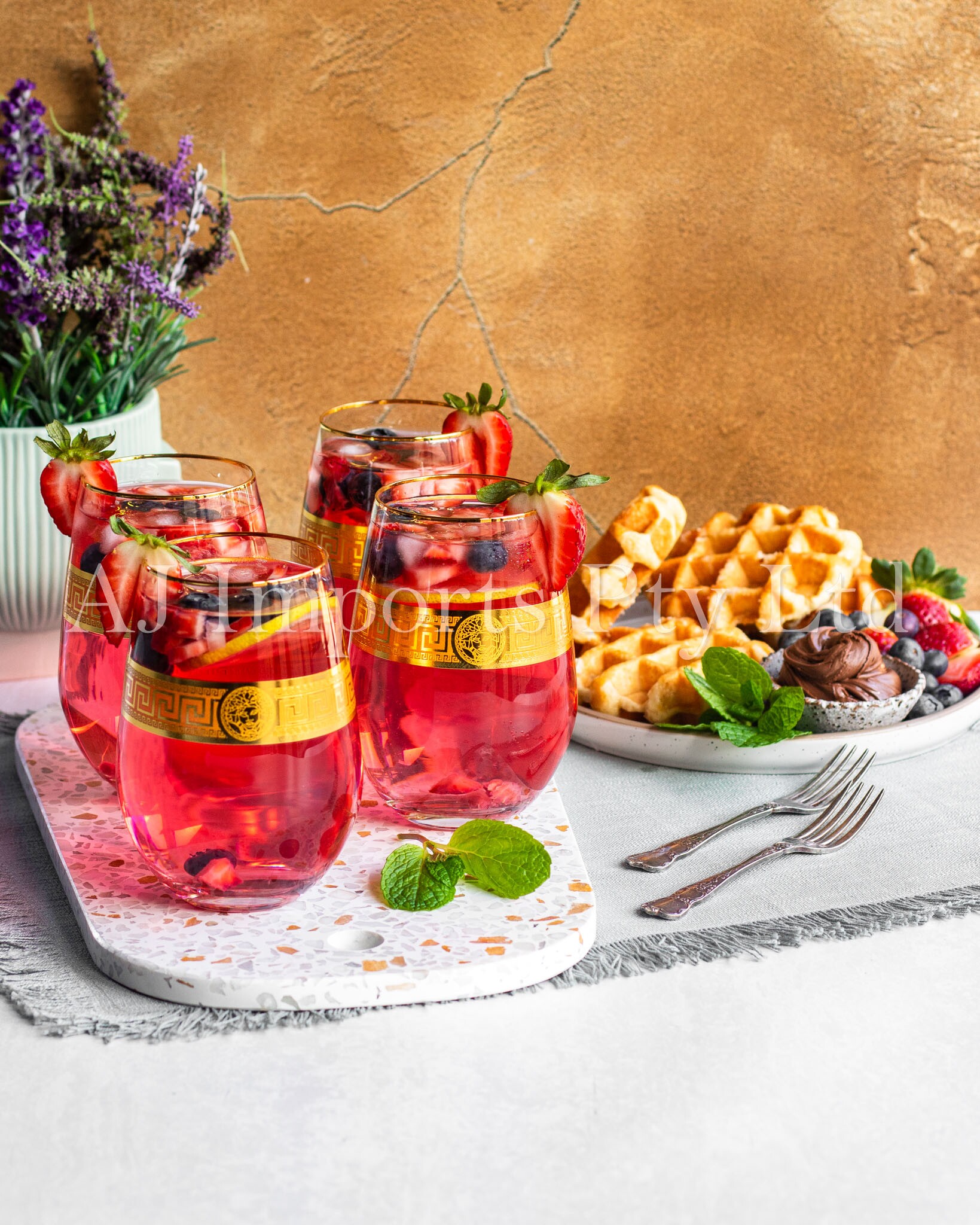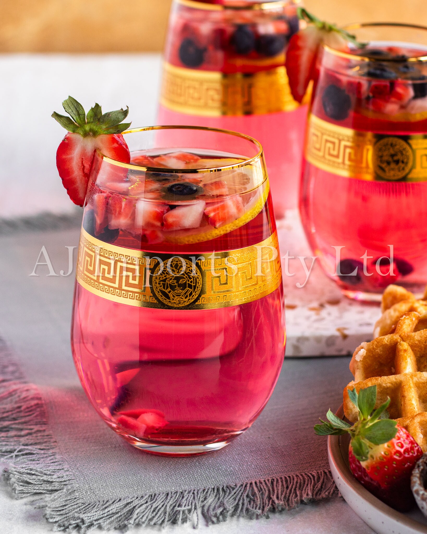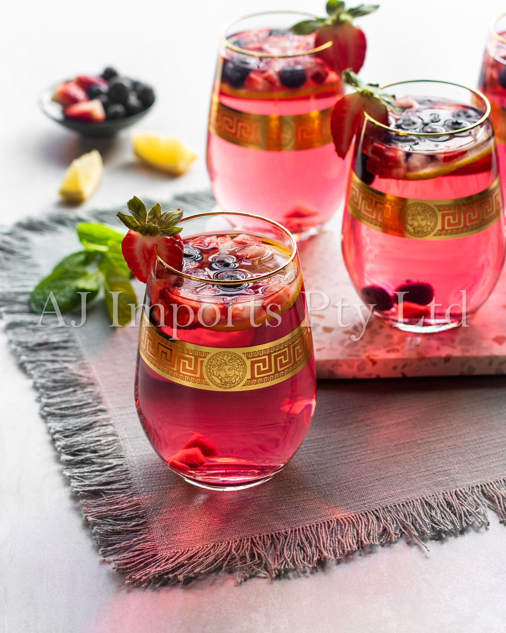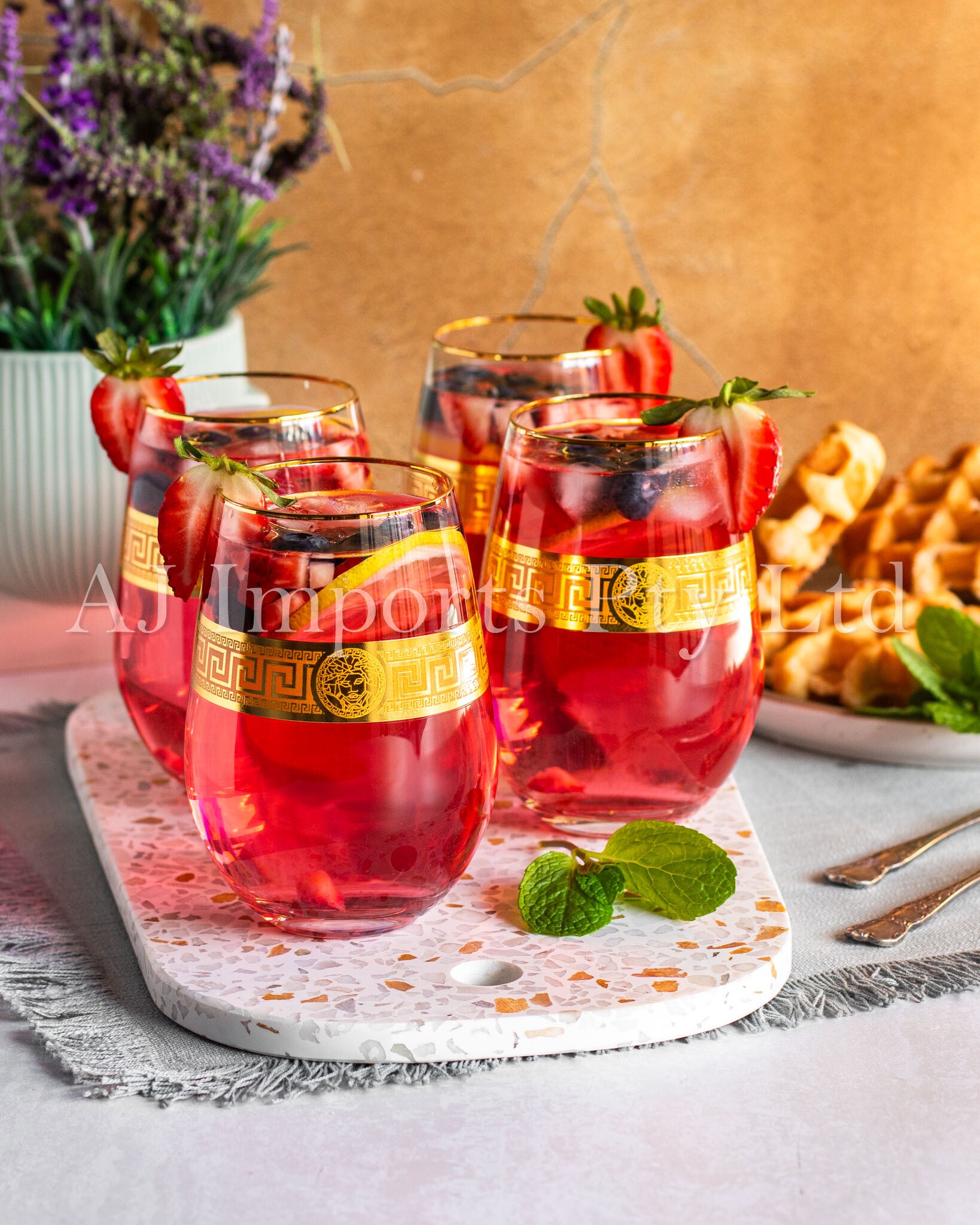 A set of four highball glasses exudes elegance with a silver Medusa Greek key design adorning their sleek exteriors. Crafted with precision, each glass embodies the timeless allure of Greek mythology, intertwining classical motifs with contemporary style. The silver hues gleam under ambient light, casting a mesmerizing aura reminiscent of Medusa’s legendary gaze. These glasses not only elevate any beverage they hold but also serve as exquisite conversation pieces, capturing the imagination with their intricate detailing and opulent charm. Perfect for imbuing gatherings with sophistication or adding a touch of luxury to everyday indulgence.