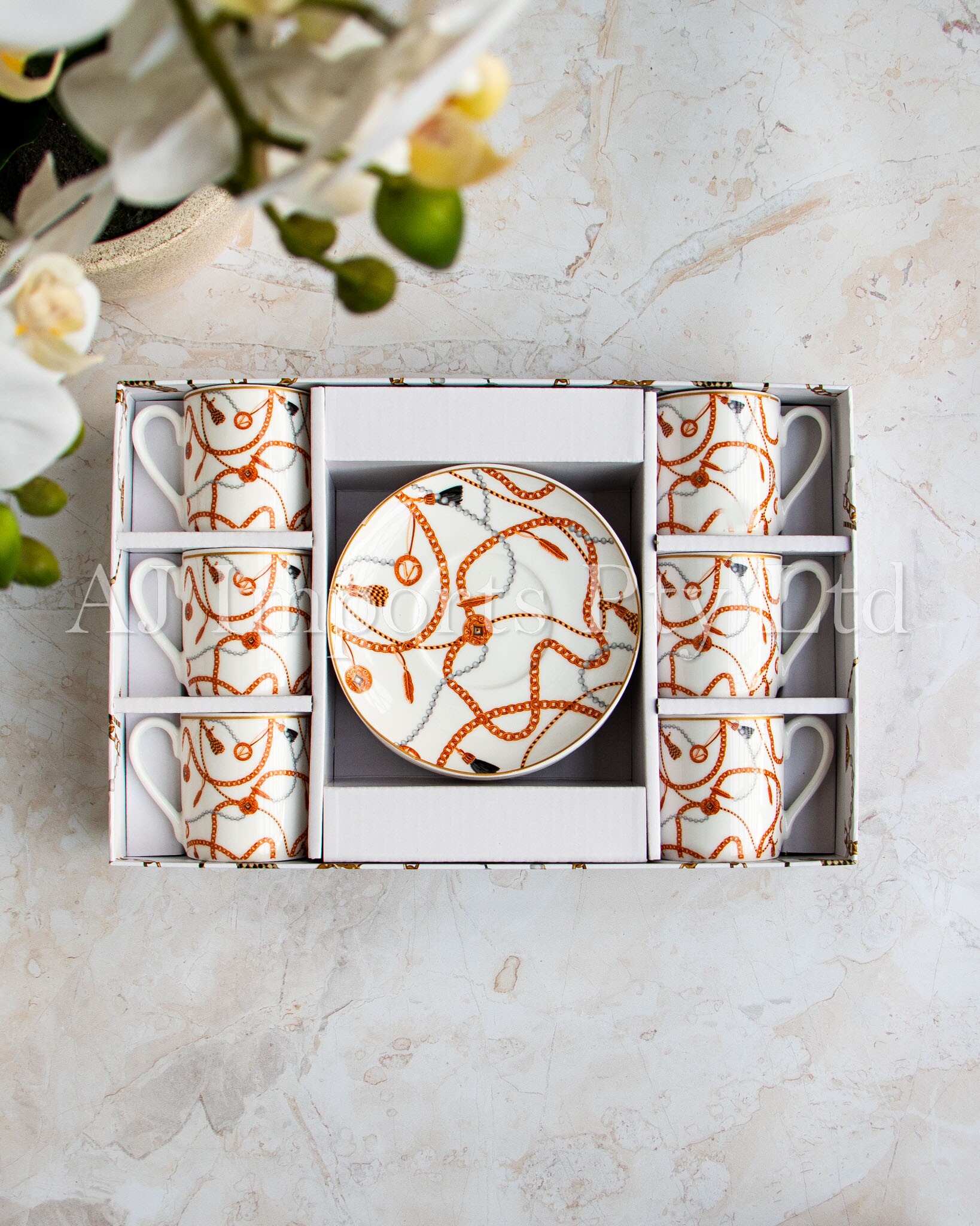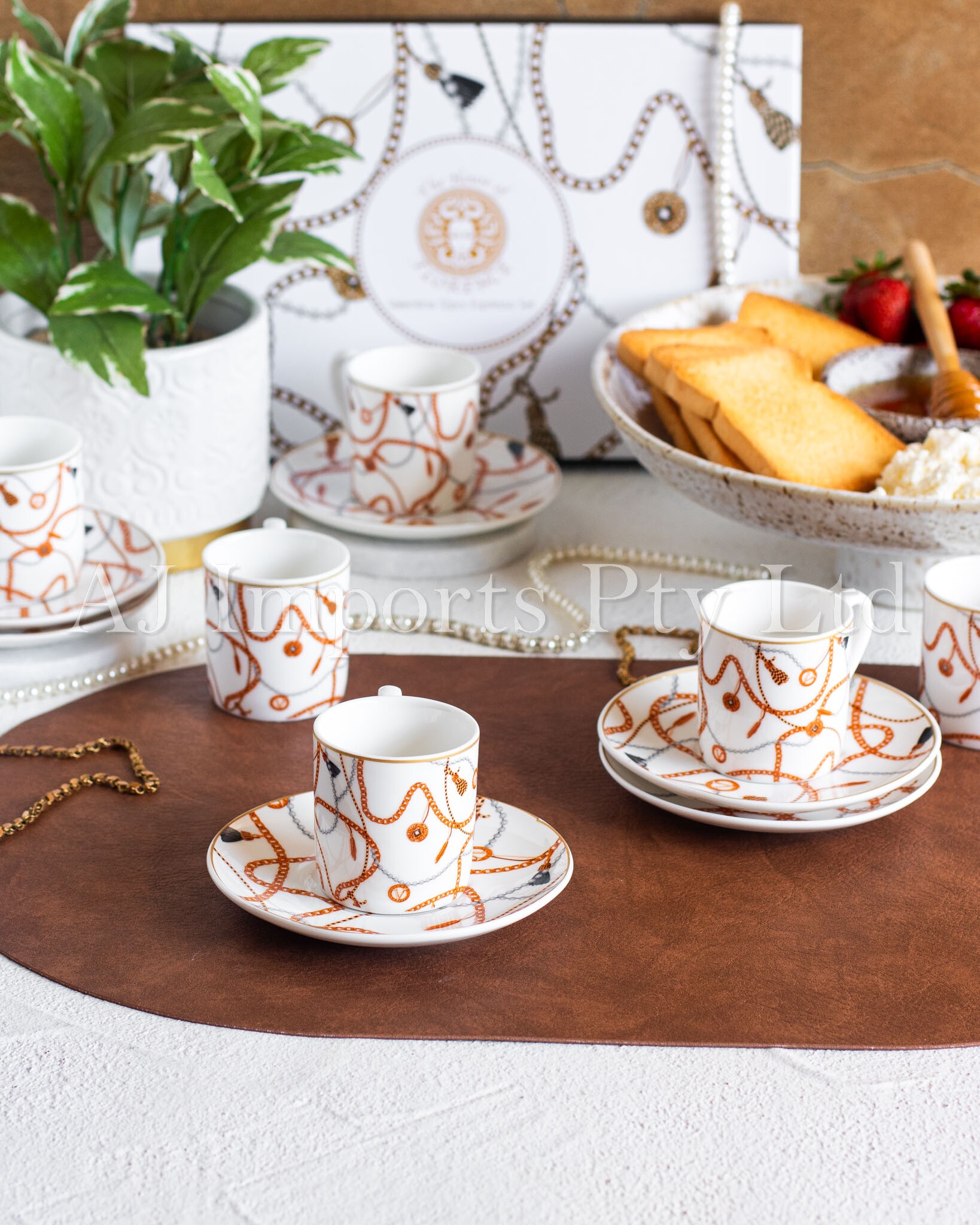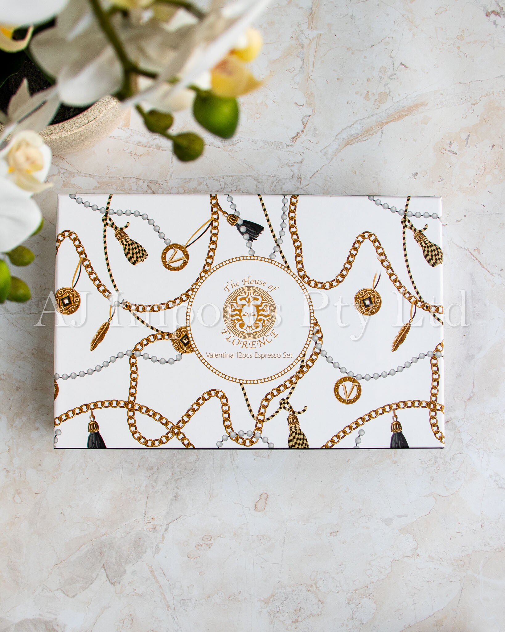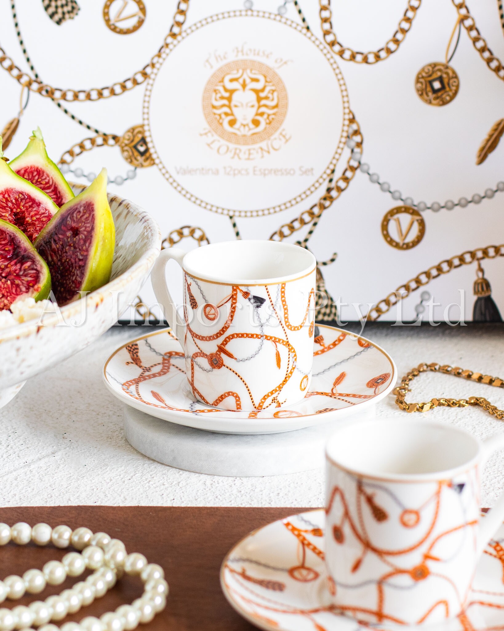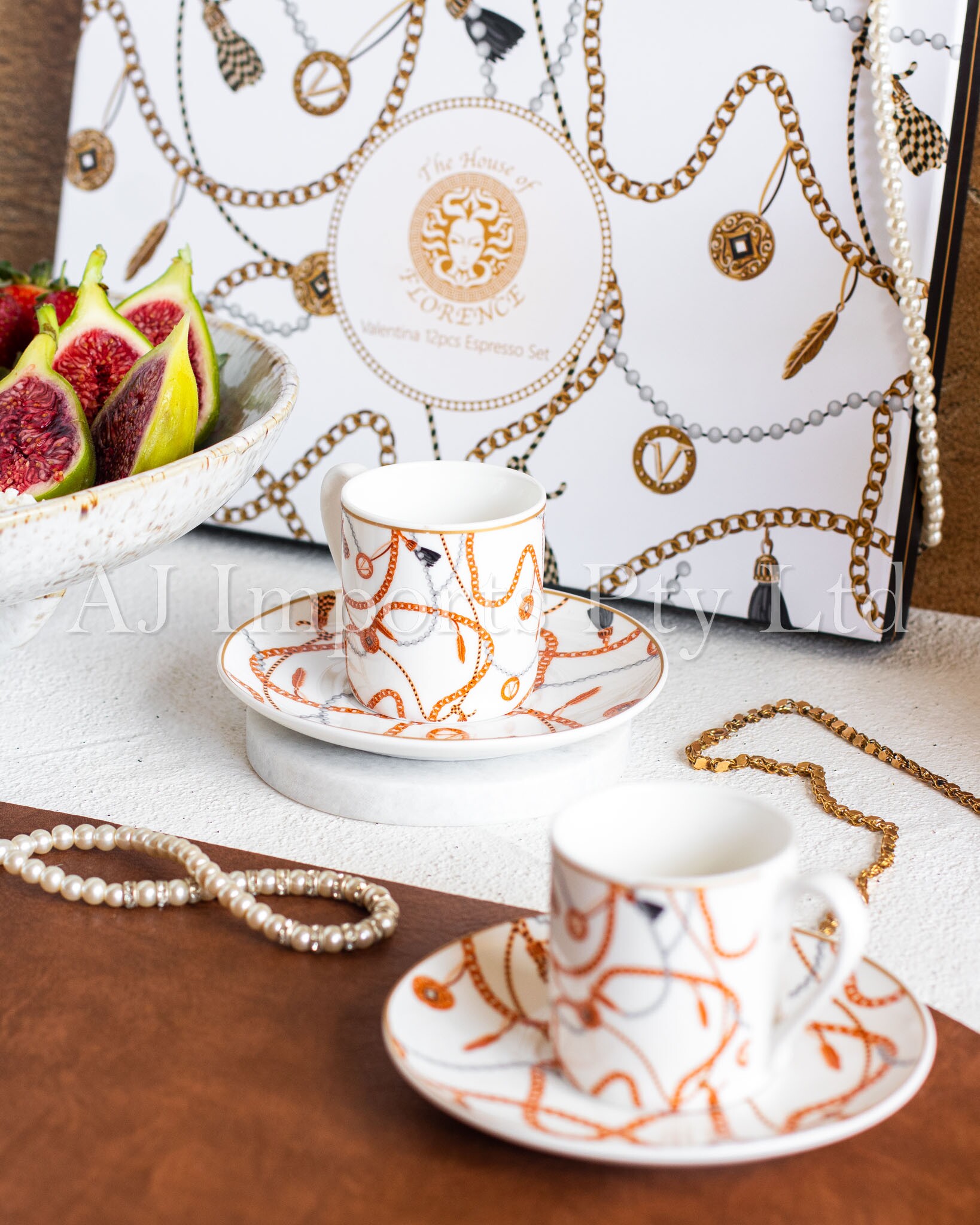 Introducing the exquisite Valentina Collection – an opulent fusion of designer elegance and timeless sophistication. Elevate your coffee experience with this set of 12 espresso cups and saucers, meticulously crafted to perfection and presented in a stunning matching gift box.