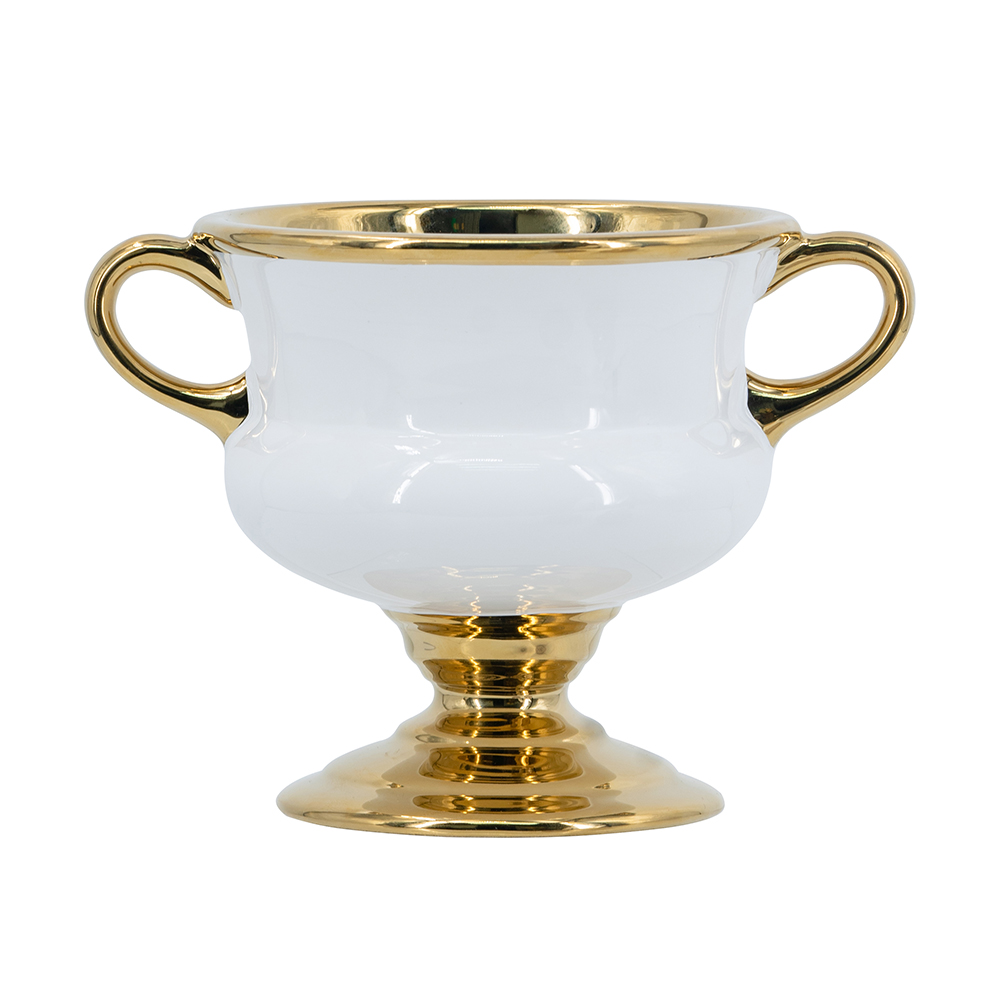 Breathing fresh, luxurious life into classic designs, this decorative ceramic vase boasts a wide silhouette, complete with an electroplated gold pedestal base, handles, and trim. Display it independently, as part of a high-style ensemble, or fill it with a custom arrangement of flowers.